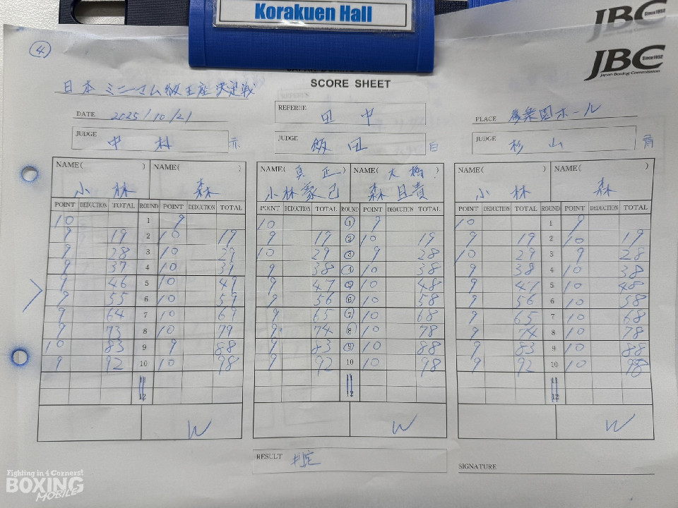 4度目の挑戦で悲願の王座獲得に成功した森は、拍手に包まれながら控え室に戻ると、「4回目ですよ!」と勝利の味を噛み締めた。「映像で観て、いろいろなパターンを想定してきたので、イメージ通りの試合ができた。相手にやられて嫌なことを実行できた。途中採点を聞くまで前半は取られていると思っていたが、これまでの経験が活きた。常に相手の動きに合わせて、3ラウンドから主導権を握ることができた」と冷静に振り返った。