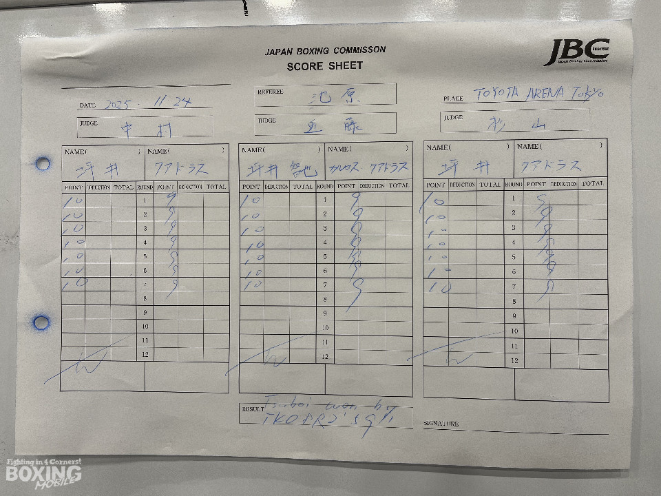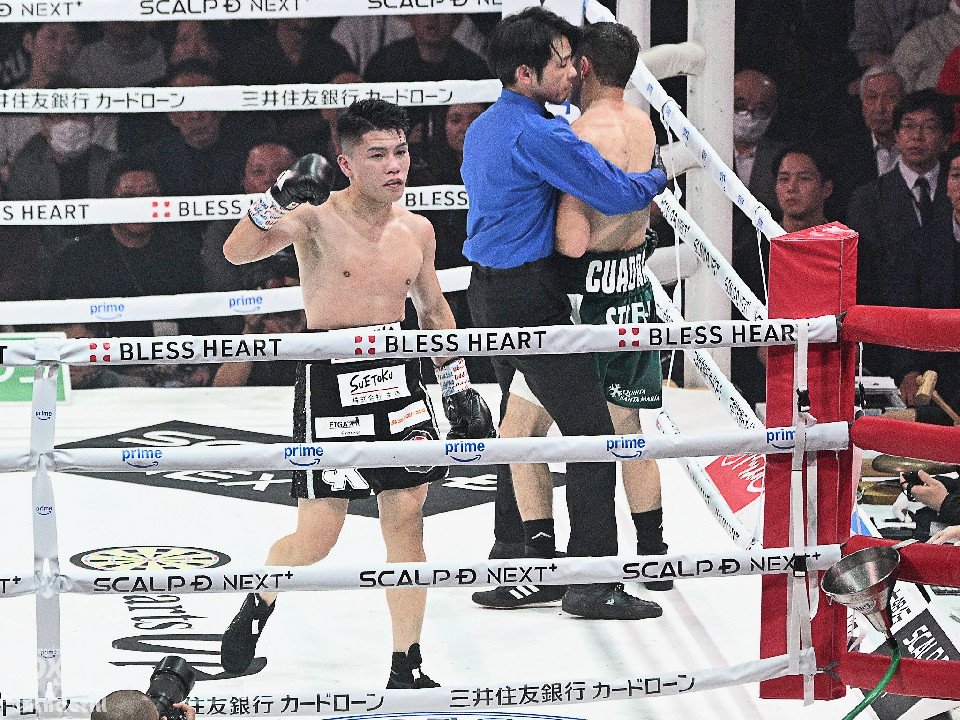 テンポのいい出入りと、隙をついて右ストレートを顔面に打ち込む坪井が、元世界王者のクアドラスを相手にスピードで翻弄した。3回には足を止めて打ち合いにも応じた坪井が、ボディにパンチをまとめて左フックで顔面を捉えた。クアドラスも左右の連打を上下に散らすが、坪井は被弾を回避。下からコンパクトに出す左の軌道を変えながら、坪井が優勢に試合を進めた。試合が決まったのは8回。坪井が連打をまとめると、右ストレートでクアドラスの腰を落とすと、レフェリーが試合を止めた。