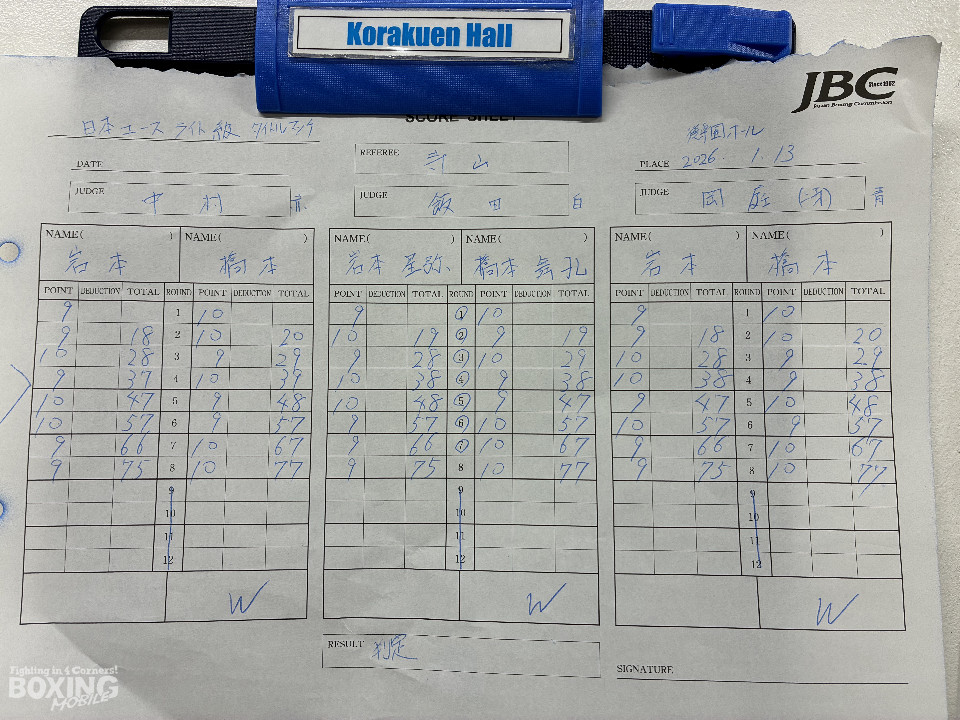岩本の初防衛戦は、挑戦者・橋本が序盤から左ストレートと巧みな動きで主導権を握った。中盤までポイントを先行した橋本に対し、岩本は後半、距離を潰してボディで猛追。最終回は激しい打ち合いとなったが、粘り切った橋本が判定で2ポイント差を守り、新王者となった。
