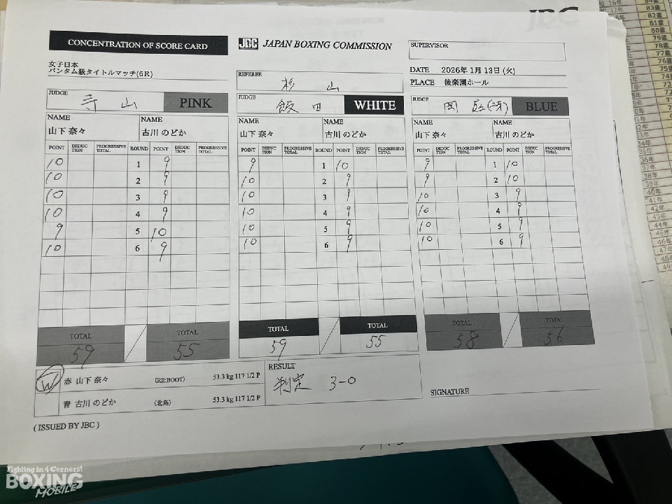 日本女子バンタム級王者・山下が古川とのダイレクトリマッチに臨み、序盤は慎重に立ち上がるも、中盤以降は圧力と手数で主導権を掌握。互いに譲らぬ展開の中、山下が有効打と積極性で上回り、返り討ちで初防衛に成功した。