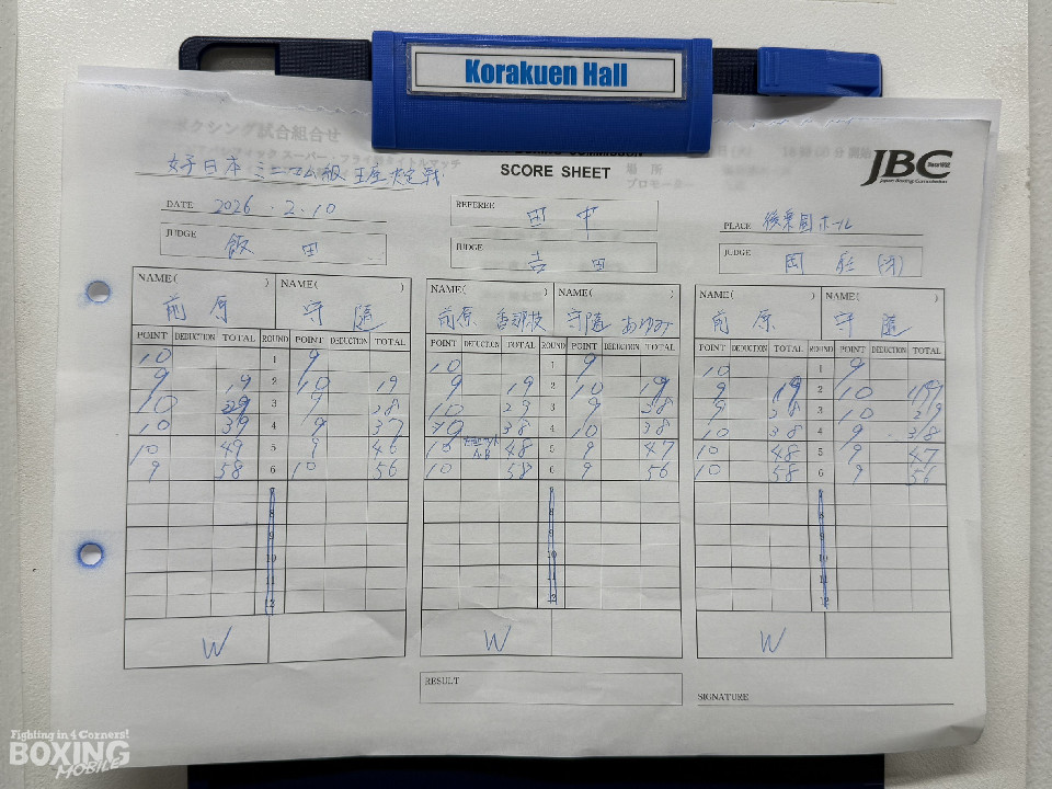 前原が前の手でコントロールしながら、左ボディを好打。守隨は時折、ワンツーを決めたが、前原はボディに倍返しして譲らず。終盤も、前原の有効打が上回った。