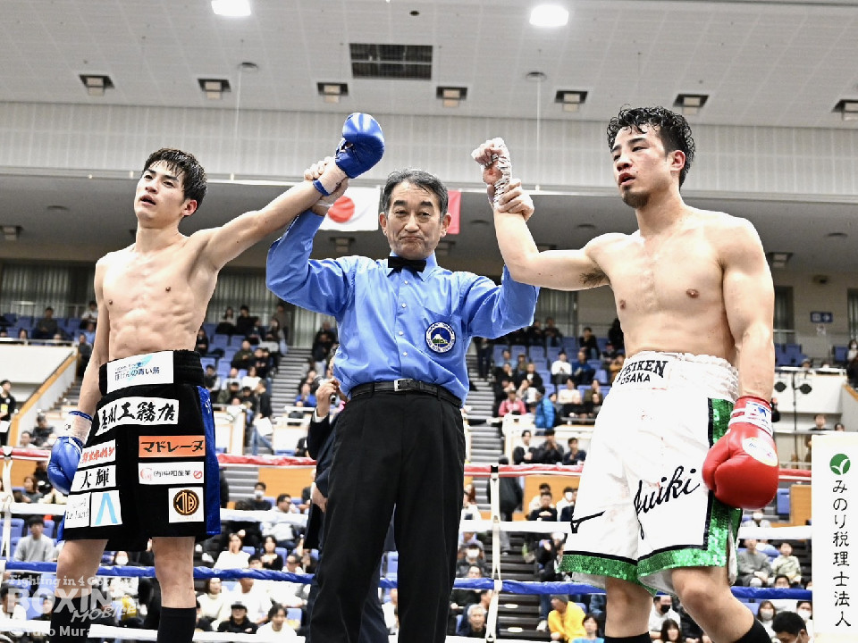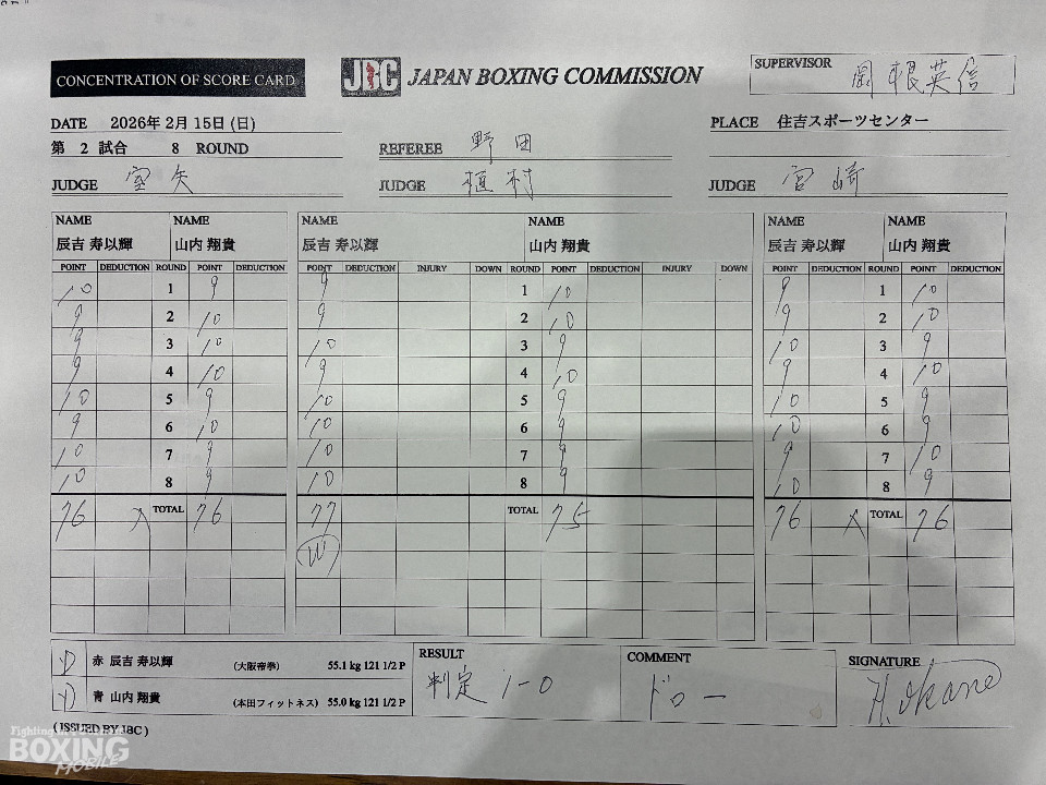 序盤は、山内が中間距離をキープしながらワンツーで顔を弾き先制。なかなか距離を詰めることができない辰吉だが、5回から左ボディを軸に反撃。しかし、山内もここは引かず、ジャブからワンツーにつなげた。後半は、辰吉が積極的な攻撃で挽回した。ジャッジに委ねられた採点は、1者が辰吉に着けたが残り2者は引き分けとした。