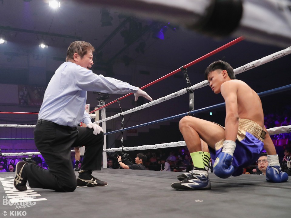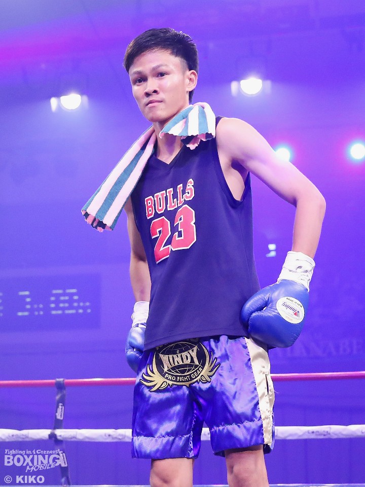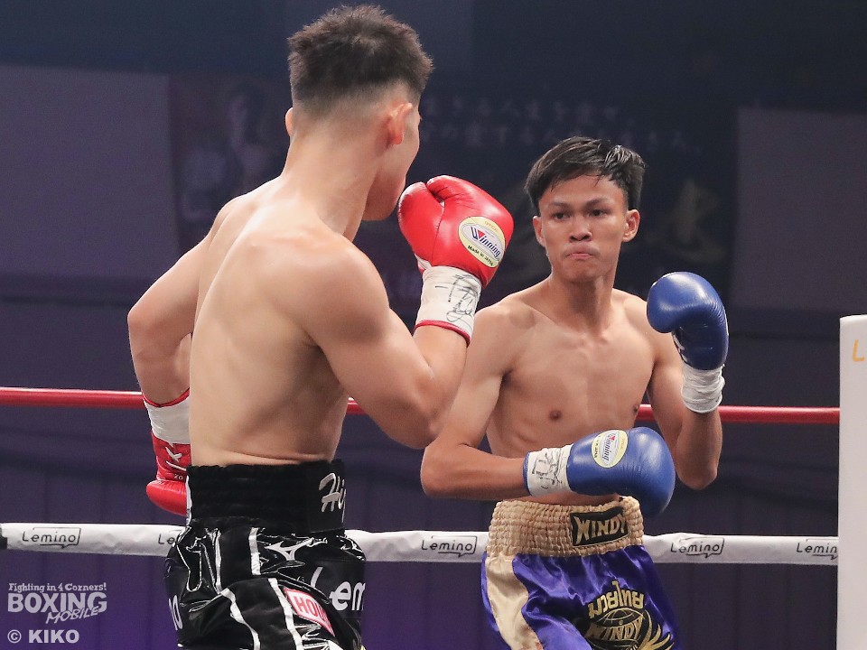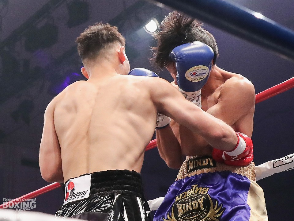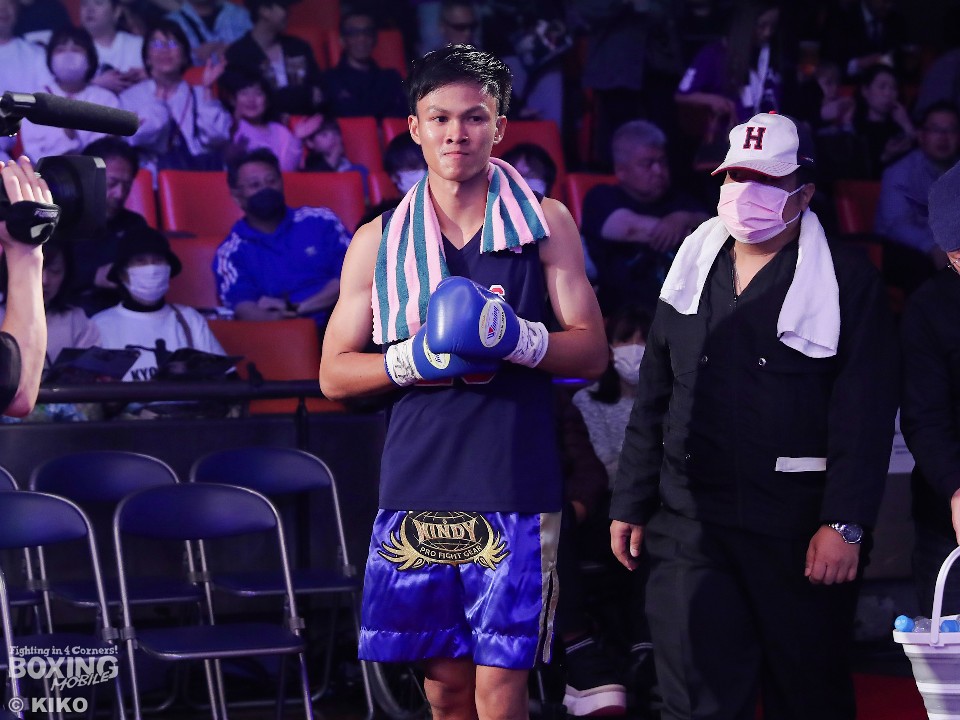試合:2023年国体優勝の岡のデビュー戦。サウスポースタイルのタサナシンがのらりくらりとしながら左を出すが、岡はジリジリと距離を詰めるとワンツー、左フックでダウンを演出。なんとか立ち上がろうとしたタサナシンだが、足元が定まらずレフェリーは10カウントを数え上げた。岡の豪快KOに会場からどよめきの声が上がった。