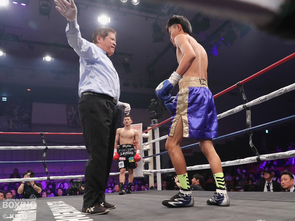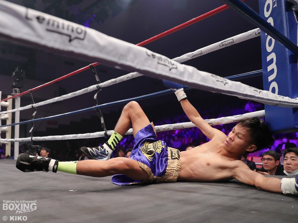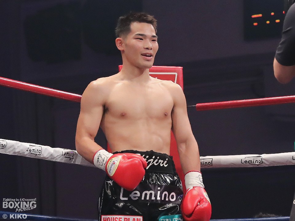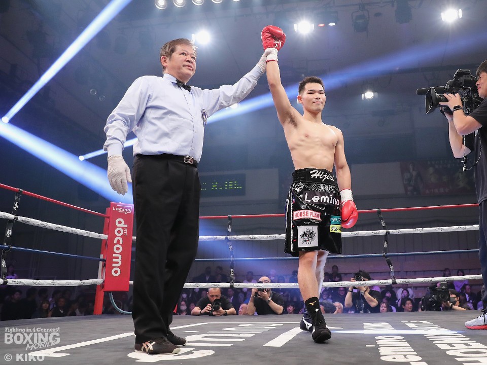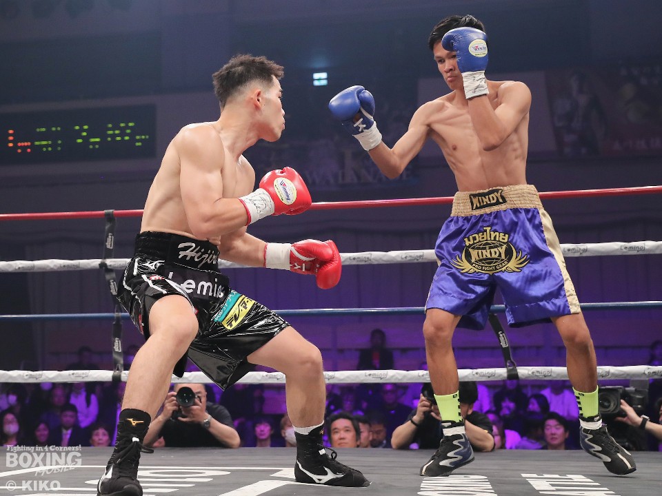 試合:2023年国体優勝の岡のデビュー戦。サウスポースタイルのタサナシンがのらりくらりとしながら左を出すが、岡はジリジリと距離を詰めるとワンツー、左フックでダウンを演出。なんとか立ち上がろうとしたタサナシンだが、足元が定まらずレフェリーは10カウントを数え上げた。岡の豪快KOに会場からどよめきの声が上がった。