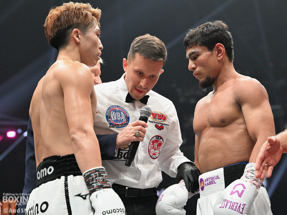 試合:世界スーパーバンタム級4団体統一王者の井上が、過去最強の相手・アフマダリエフを迎えて統一王座の防衛戦に臨んだ。先に入場したアフマダリエフは、左拳を軽く突き上げながら、自らに何かを言い聞かせるように入ってきた。井上の入場曲が流れると会場にいる全員がスマホを片手にその雄姿を撮った。リングインすると地鳴りのような歓声が沸き起こった。ウズベキスタンの「MJ」コールが起こるその何倍も「尚弥」コールが起こる。緊張感あふれる攻防の中、井上が単発の右ボディストレートをヒット。2回、何重にも罠を仕掛ける神経戦を展開。一瞬の隙も見逃せない。3回、井上はステップインから右ボディストレートを痛打。しかし、深追いはせず一定の距離をキープした。4回、アフマダリエフは距離を詰めて左ストレートで顔を弾くが、井上は慌てる素振りを見せず、ジャブからワンツーにつなげた。5回、アフマダリエフはプッシュしながら左を叩きつけるが、井上はリターンの右ストレートで対抗。6回、力強い左右フックで攻め立てるアフマダリエフに対し、井上は真っ向から応戦。右から左ボディを突き刺し一瞬動きを止めた。7回、井上はジャブからワンツーを決めると返しの右フックをスウェーで回避。8回も井上は鉄壁のディフェンスでクリーンヒットをもらわず。ジャブで削っていった。9回、井上はカウンターの右アッパーで顔を弾くとワンツー左ボディを好打。10回、アフマダリエフはワンツー右フックでアグレッシブな姿勢。しかし、ヒットを奪うまでには至らず。11回、井上は軽快なステップからジャブを軸にコントロール。12回、「尚弥」コールが起こる中、井上は最後まで集中力を切らさず被弾を回避。相手に付け入る隙を与えなかった。試合終了のゴングが鳴ると抱き合って健闘を称え合った。井上が大差判定勝ちで王者の力を示した。