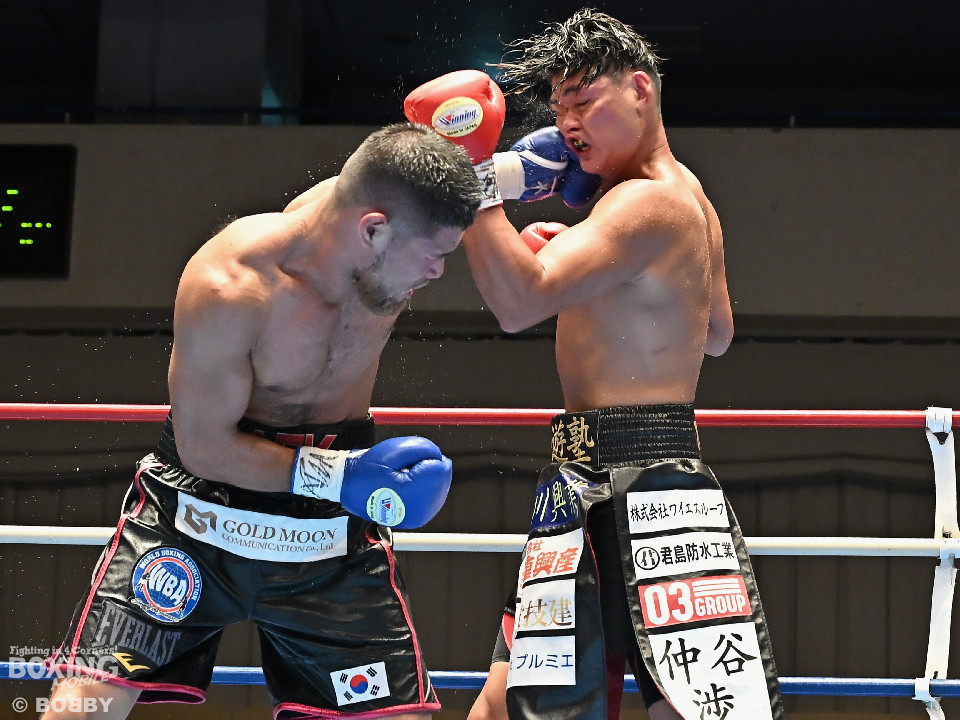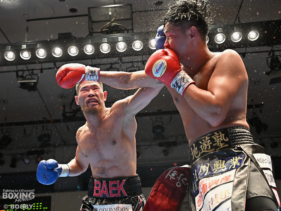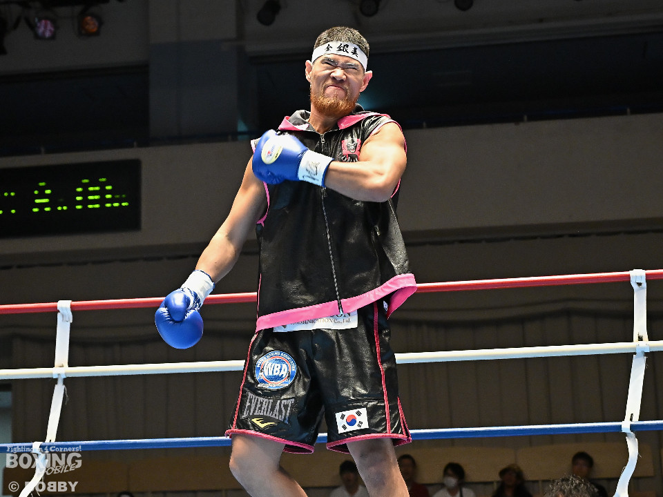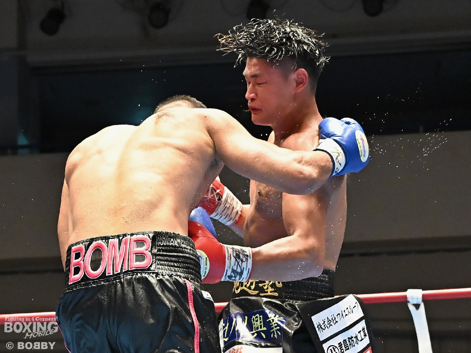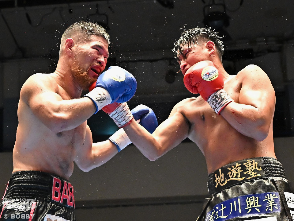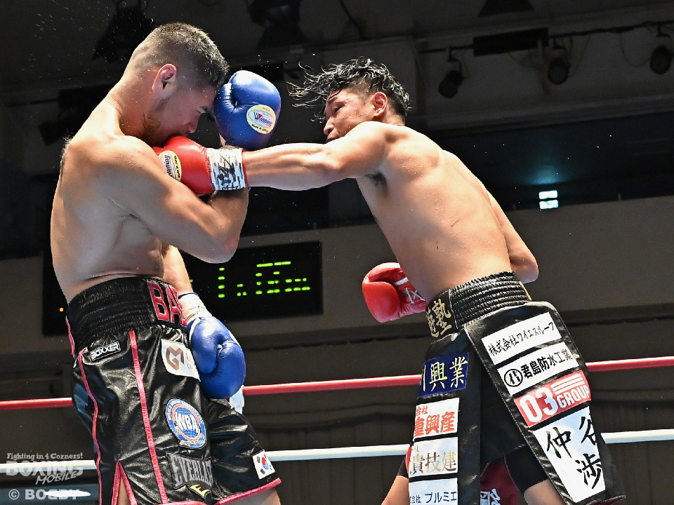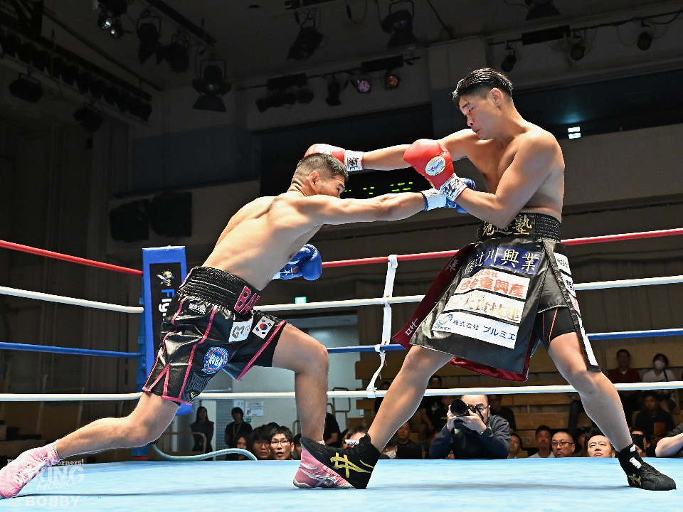 試合:日本スーパーミドル級王者の帝尊が韓国のファイター・ベクとベルトをかけてダイレクトリマッチに臨んだ。サウスポー帝尊が左ボディストレートから切り込むのに対し、ベクはリターンの左フックで応戦。2回、帝尊は攻め急がず左ボディストレートを軸に体力を削る作戦。3回、帝尊はワンツーで突き放すとボディの打ち合いでも上回った印象。4回、ベクは距離を詰めて左フックをねじ込むと手数を増やして反撃。5回、ショートレンジで激しいパンチの応酬。ベクのしつこさが上回った印象。前半終了時の公開採点は48-47×2(帝尊)、48-47×1(ベク)と割れた。6回、帝尊はこれでもかと左ボディアッパーを突き刺し攻勢。我慢比べの打ち合いが続いた。7回、ベクは左フックを打ち込みながら頭をぶつけてラフ戦法。8回、帝尊は左フックでグラつかせてチャンスを作るが、ベクは懸命に打ち返して意地を見せた。9回、帝尊は距離をキープしながらワンツーをヒット。10回、帝尊は丁寧なボクシングを構築するが、試合終了間際、真っ向勝負で会場を盛り上げた。ジャッジ3者ともに2ポイント差をつけた帝尊が返り討ちを果たし初防衛に成功した。