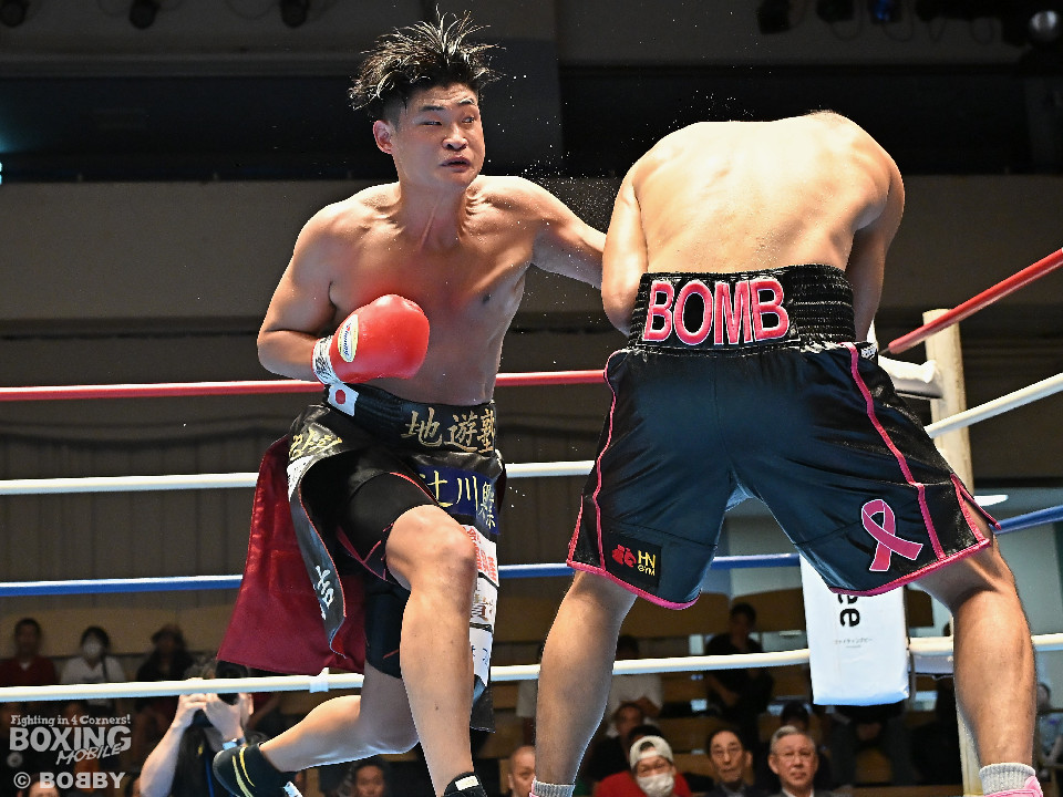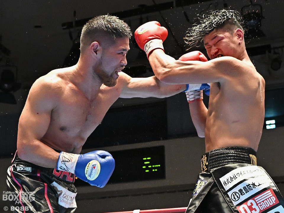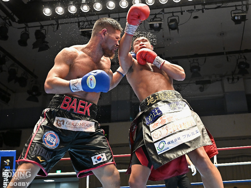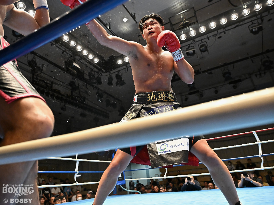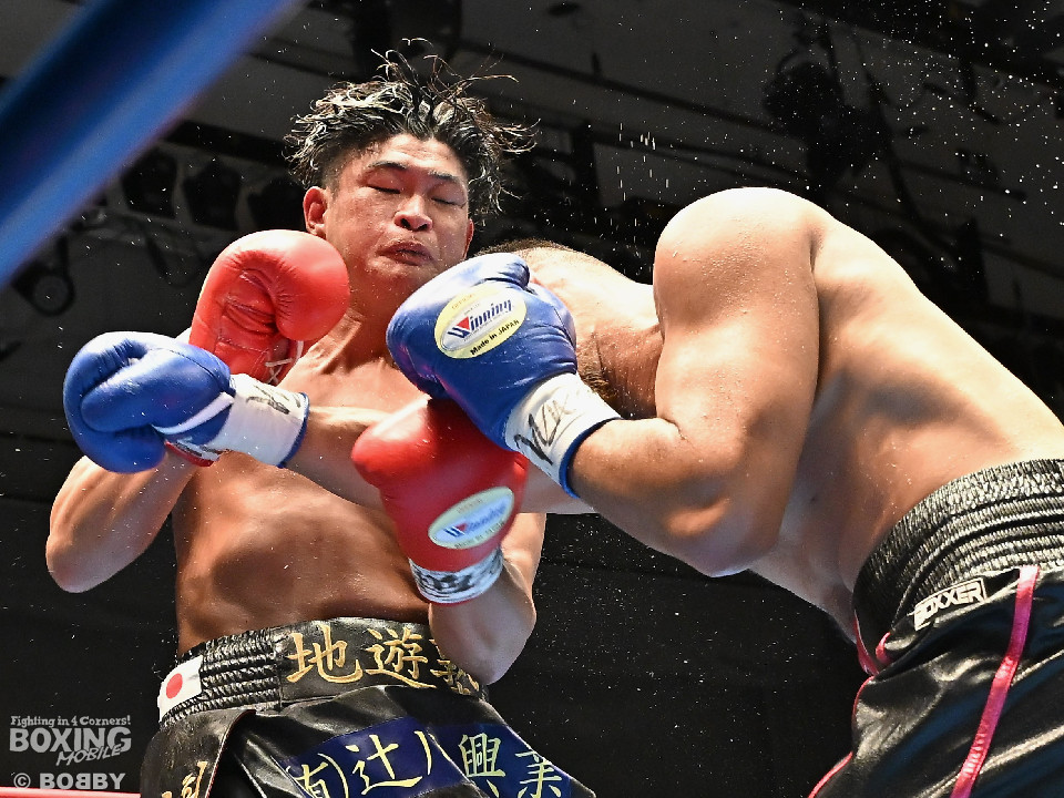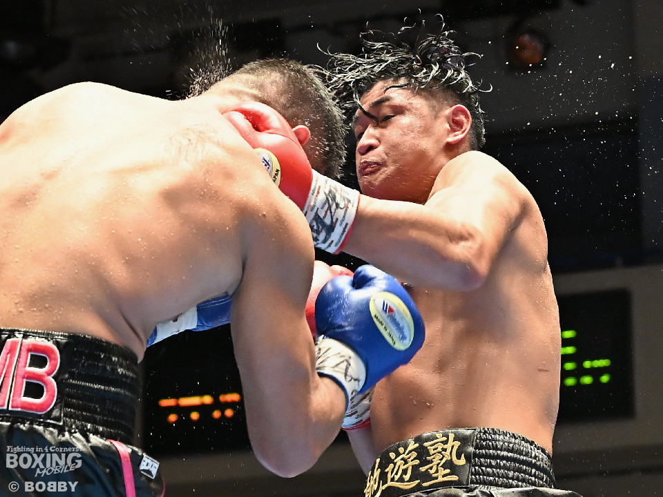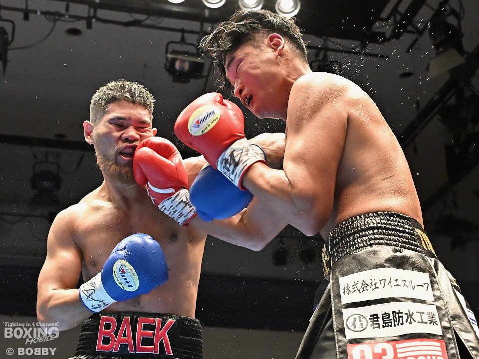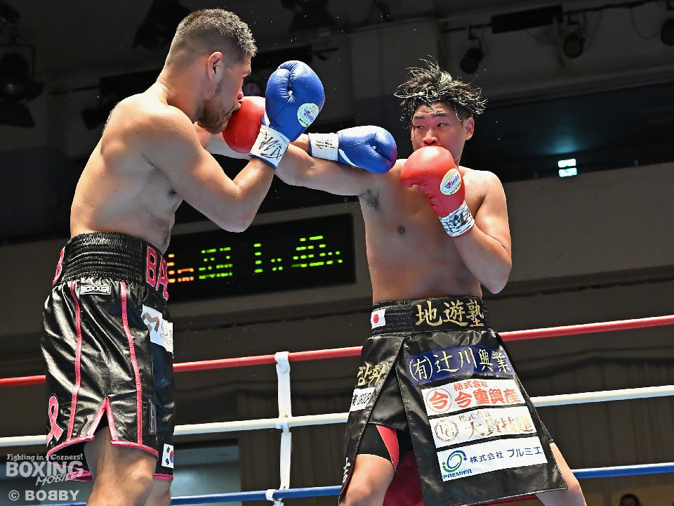 試合:日本スーパーミドル級王者の帝尊が韓国のファイター・ベクとベルトをかけてダイレクトリマッチに臨んだ。サウスポー帝尊が左ボディストレートから切り込むのに対し、ベクはリターンの左フックで応戦。2回、帝尊は攻め急がず左ボディストレートを軸に体力を削る作戦。3回、帝尊はワンツーで突き放すとボディの打ち合いでも上回った印象。4回、ベクは距離を詰めて左フックをねじ込むと手数を増やして反撃。5回、ショートレンジで激しいパンチの応酬。ベクのしつこさが上回った印象。前半終了時の公開採点は48-47×2(帝尊)、48-47×1(ベク)と割れた。6回、帝尊はこれでもかと左ボディアッパーを突き刺し攻勢。我慢比べの打ち合いが続いた。7回、ベクは左フックを打ち込みながら頭をぶつけてラフ戦法。8回、帝尊は左フックでグラつかせてチャンスを作るが、ベクは懸命に打ち返して意地を見せた。9回、帝尊は距離をキープしながらワンツーをヒット。10回、帝尊は丁寧なボクシングを構築するが、試合終了間際、真っ向勝負で会場を盛り上げた。ジャッジ3者ともに2ポイント差をつけた帝尊が返り討ちを果たし初防衛に成功した。
