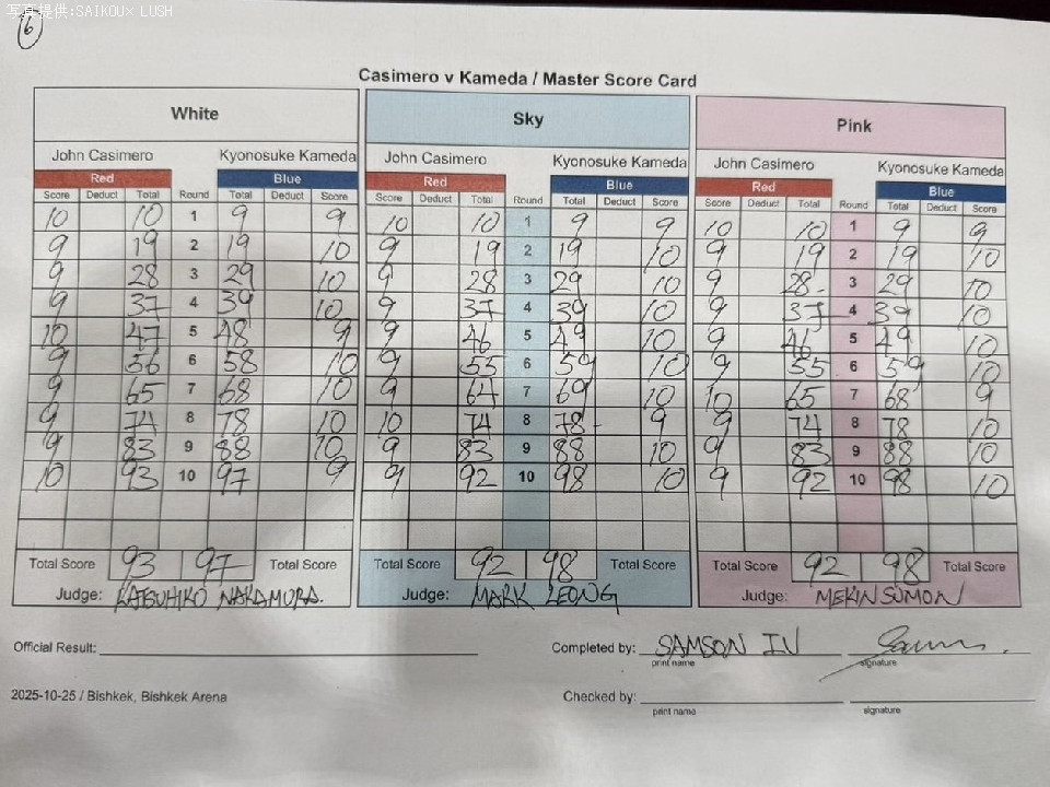 試合:元世界3階級制覇王者の悪童・カシメロと"浪速の狂犬"亀田京之介による注目の一戦。身長差13㎝対決は、初回、カシメロが圧力をかけて右フックを「ブン!」と強振。亀田は足を使いながらパンチの威力を探る展開。2回、亀田は集中力を保ちながら距離をキープ。3回、カシメロは圧力を強めて左フックを振り回すが、距離が遠いか。4回、距離を詰めるカシメロと迎え撃つ亀田の構図。5回、亀田はジャブを飛ばしながら右カウンターを好打。6回、やや押し込まれていた亀田だが、カウンターの左フックで顔を弾き見栄えの良さをアピール。7回、亀田はジャブを上下に散らすと足を使いながらアウトボクシングを遂行。8回、強打を決めたいカシメロだが、攻撃が単調で追い切れず。9回、亀田はサークリングしながらジャブでコントロール。10回、逆転を狙うカシメロに対し、亀田はフットワークを駆使しながらカウンターを決めた。最後まで作戦を遂行した亀田がカシメロを撃破した。