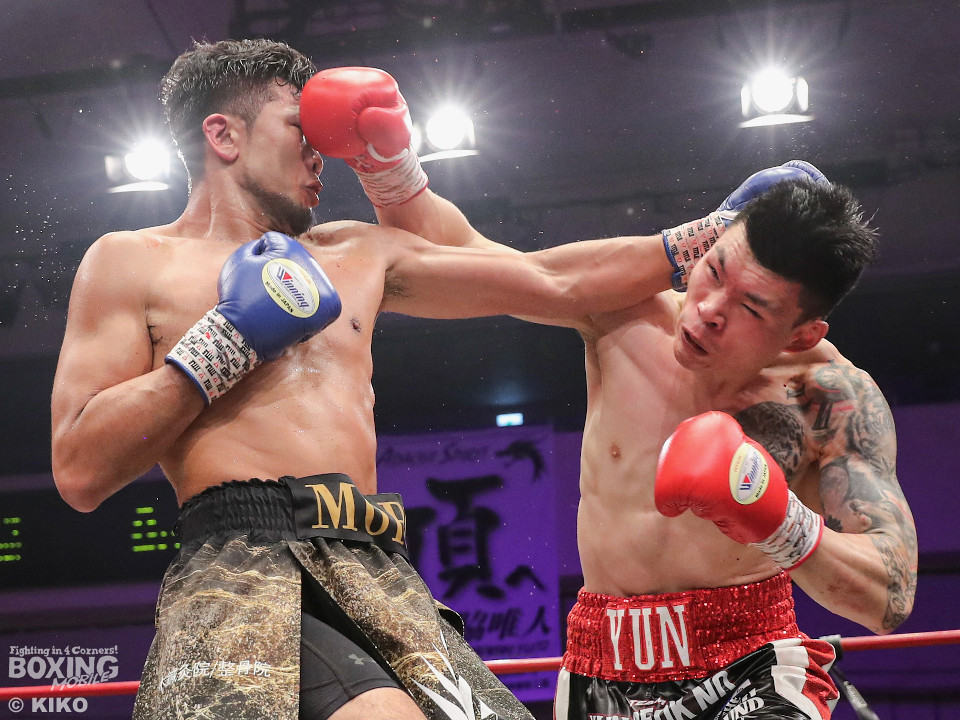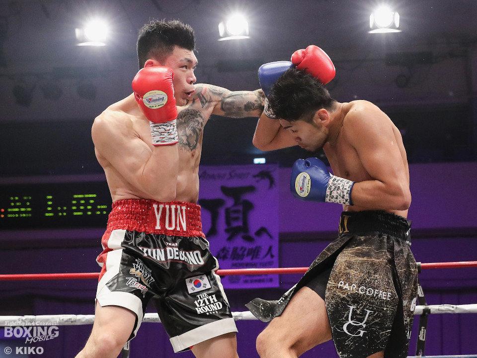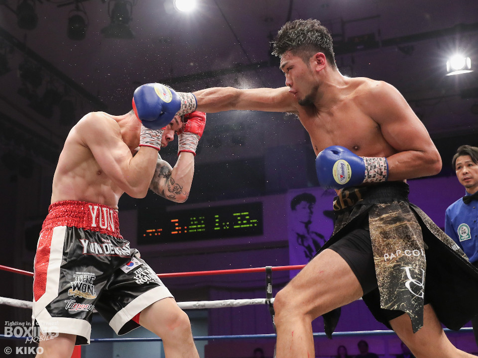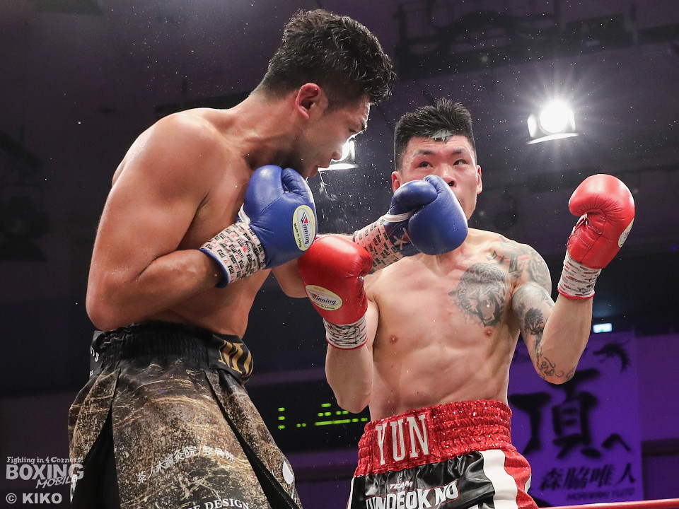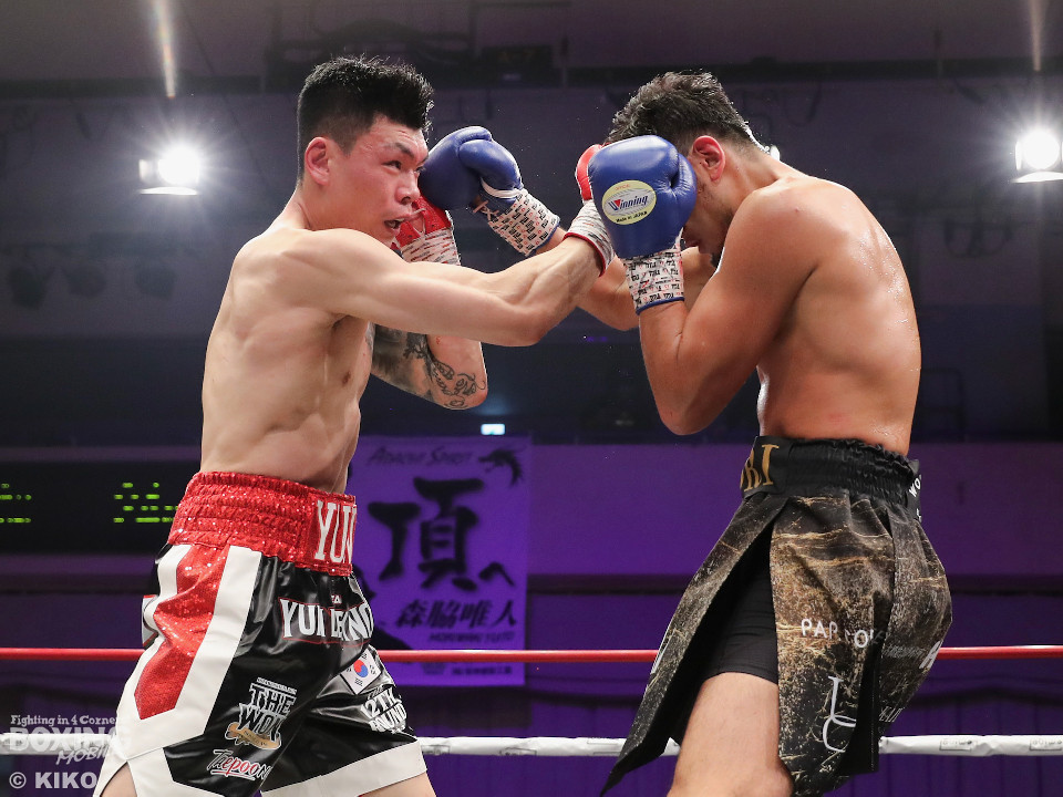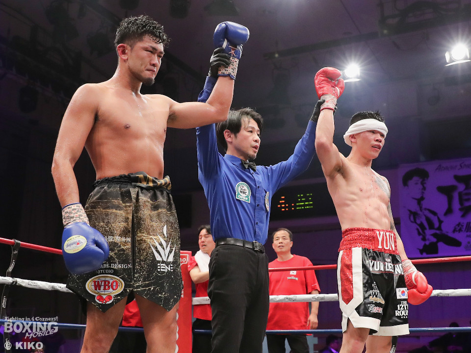 試合:東京五輪代表の森脇がプロ転向2戦目でOPBF東洋太平洋・WBO-AP王者のユンに挑戦した。森脇が前の手で距離を測りながら様子を伺うのに対し、ユンは右フックをヒット。それでも森脇は「想定内」とばかりにニヤリ。ラウンド終了間際、森脇は右カウンターでダウンを奪う絶好のスタートを切った。2回、激しいパンチの応酬の中、頭がぶつかり森脇は左目上をカット。ドクターチェック後、強気の打ち合いで会場を盛り上げた。3回、ユンはショートアッパーを織り交ぜたコンビネーションで反撃。4回、偶然のバッティングで今度はユンが左目上をカット。ユンの傷が深く1度目のドクターチェックでレフェリーはこれ以上の試合続行不能と判断。既定のラウンドに達していいないため、負傷引き分けでユンが防衛した。