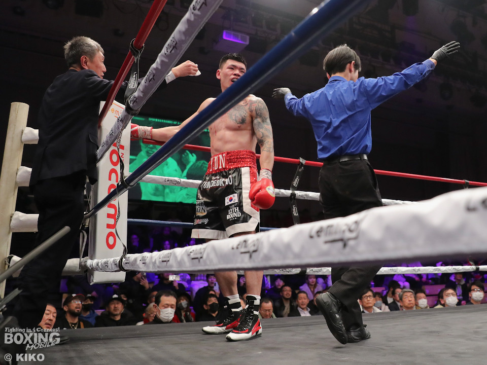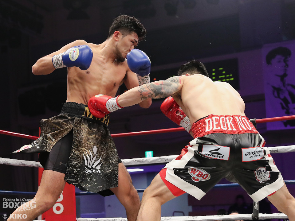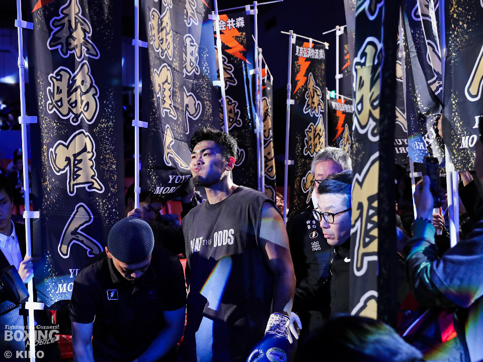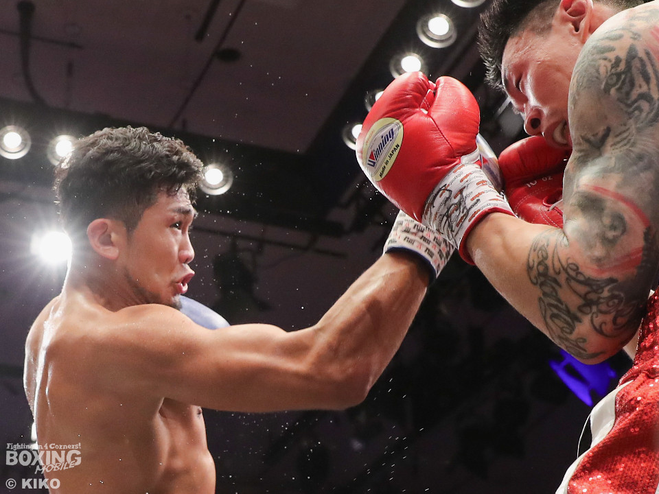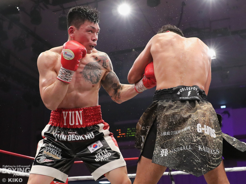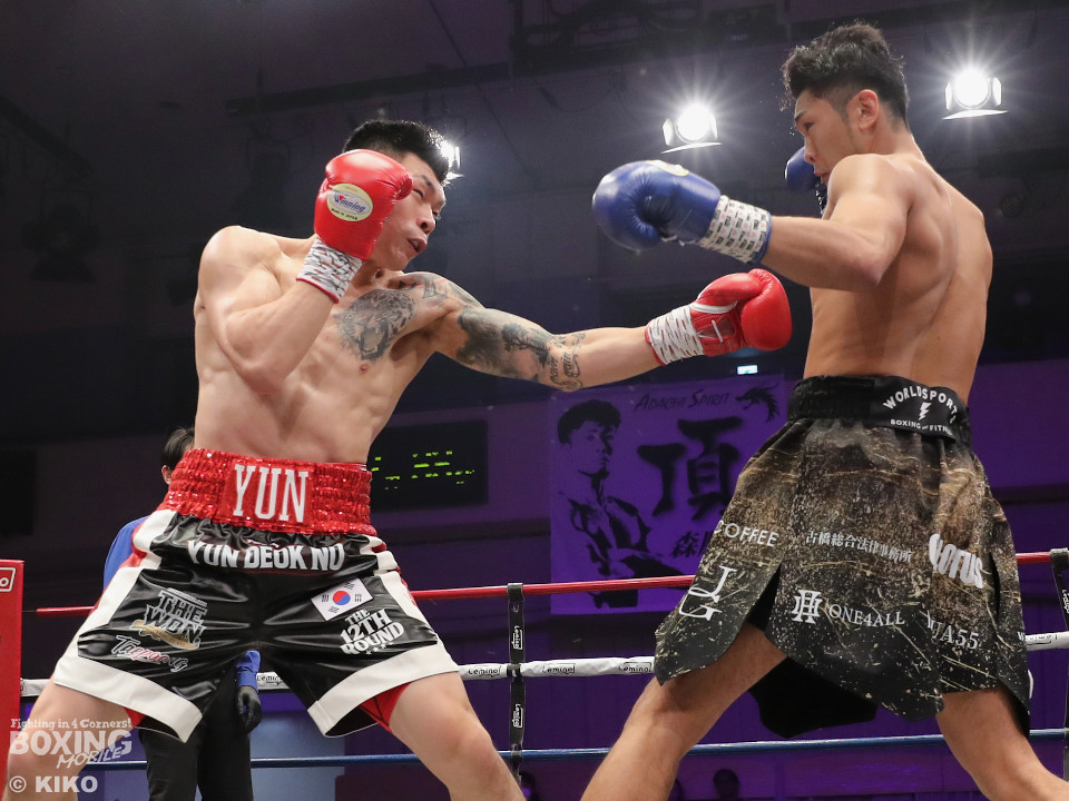 試合:東京五輪代表の森脇がプロ転向2戦目でOPBF東洋太平洋・WBO-AP王者のユンに挑戦した。森脇が前の手で距離を測りながら様子を伺うのに対し、ユンは右フックをヒット。それでも森脇は「想定内」とばかりにニヤリ。ラウンド終了間際、森脇は右カウンターでダウンを奪う絶好のスタートを切った。2回、激しいパンチの応酬の中、頭がぶつかり森脇は左目上をカット。ドクターチェック後、強気の打ち合いで会場を盛り上げた。3回、ユンはショートアッパーを織り交ぜたコンビネーションで反撃。4回、偶然のバッティングで今度はユンが左目上をカット。ユンの傷が深く1度目のドクターチェックでレフェリーはこれ以上の試合続行不能と判断。既定のラウンドに達していいないため、負傷引き分けでユンが防衛した。