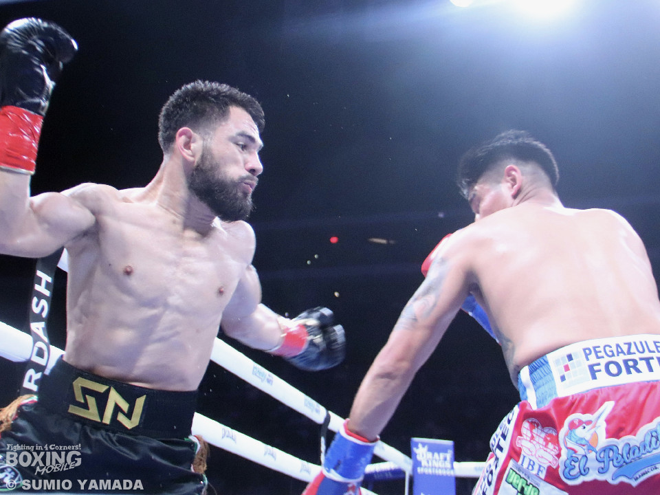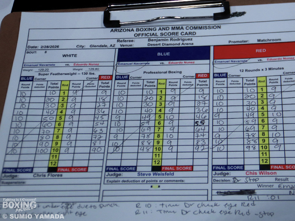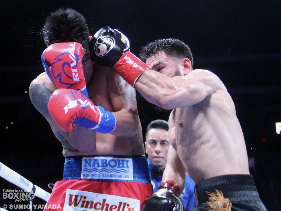 試合:サイズで上回るWBO王者ナバレッテは、ゆったりと構えてロングレンジから右を放ち、対するIBF王者ヌニェスは距離を詰めてインファイトを仕掛ける立ち上がりとなった。ナバレッテは持ち前のダイナミックな攻撃で、3回には鋭い左アッパーをヒット。ヌニェスは右目下をカットし、中に入り切れないまま中盤戦へ突入した。それでもヌニェスはプレッシャーを強め、ボディにパンチを集めて反撃。ナバレッテも真っ向から撃ち合いに応じ、メキシカン同士による激しい打撃戦となった。ナバレッテは随所で左アッパーを好打し、9回には右アッパーもクリーンヒット。ヌニェスは後退を余儀なくされた。10回、ヌニェスは右目下を再びカットし、腫れも目立つとドクターチェックが入る。ナバレッテはなおも右アッパーとボディで攻め立て、そのままゴング。11回開始直後、再度ドクターチェックが行われ試合はストップ。ナバレッテが11回1秒TKO勝利を収め、WBO・IBF王座を統一し、統一王者となった。