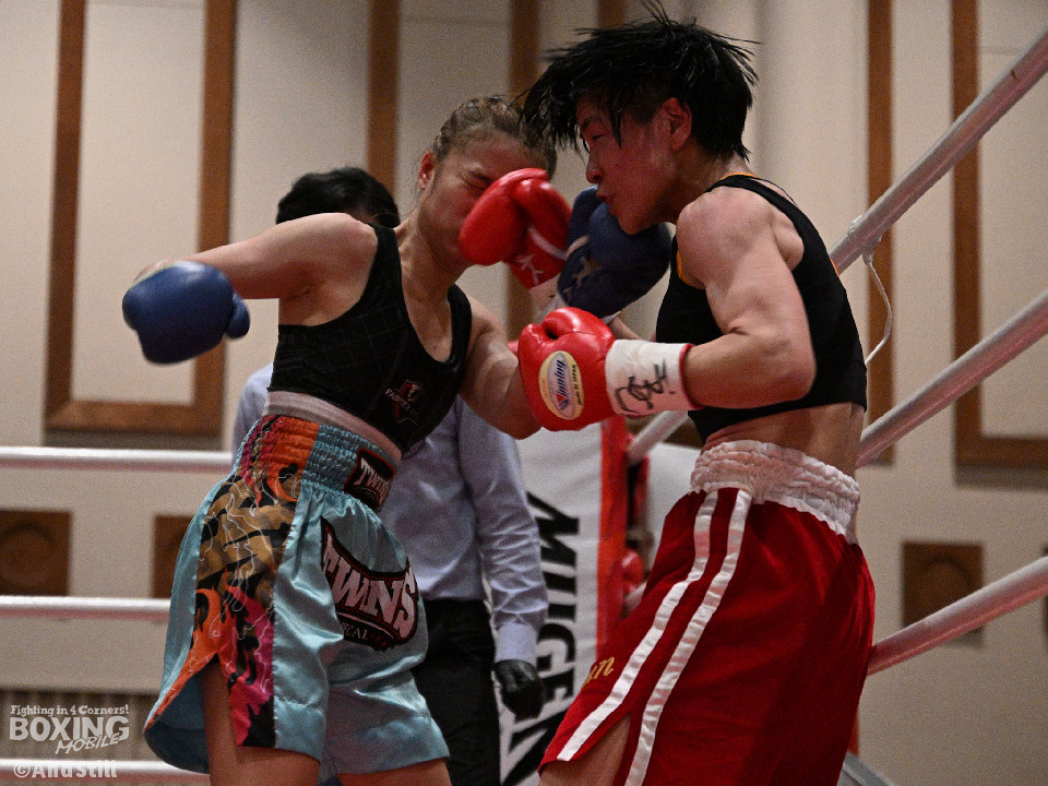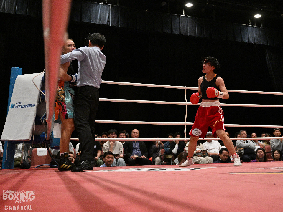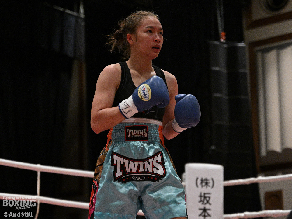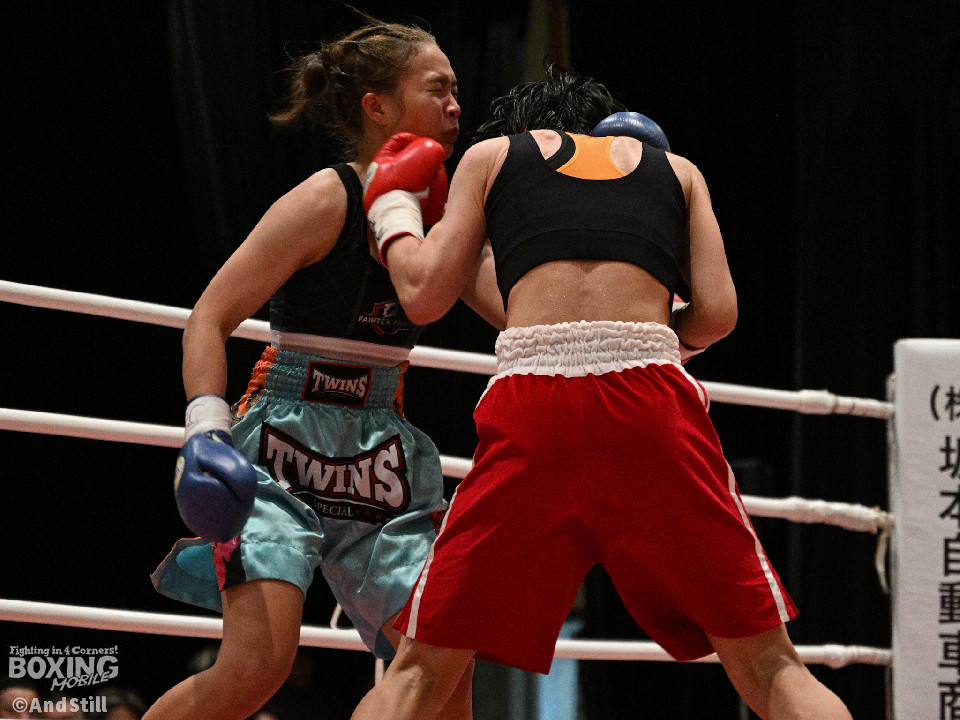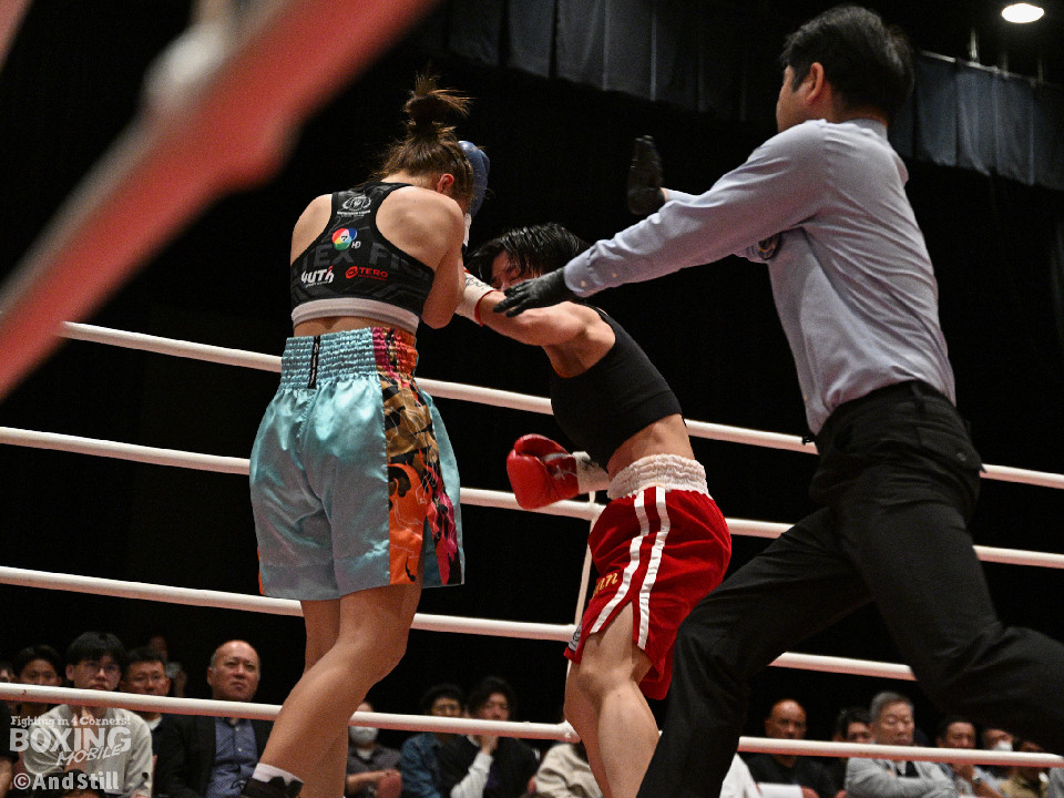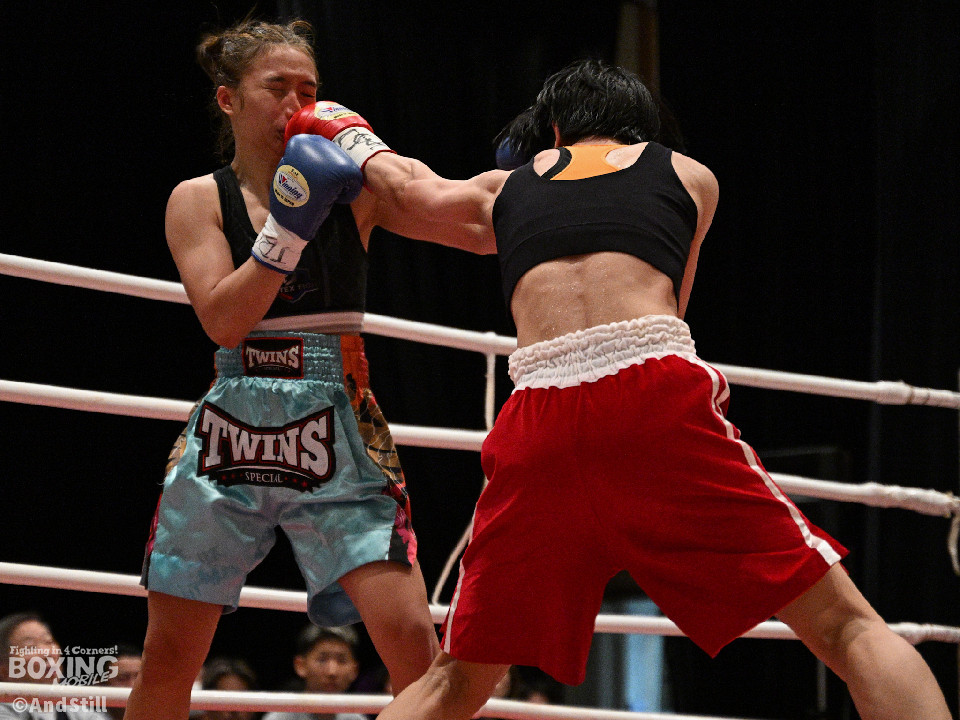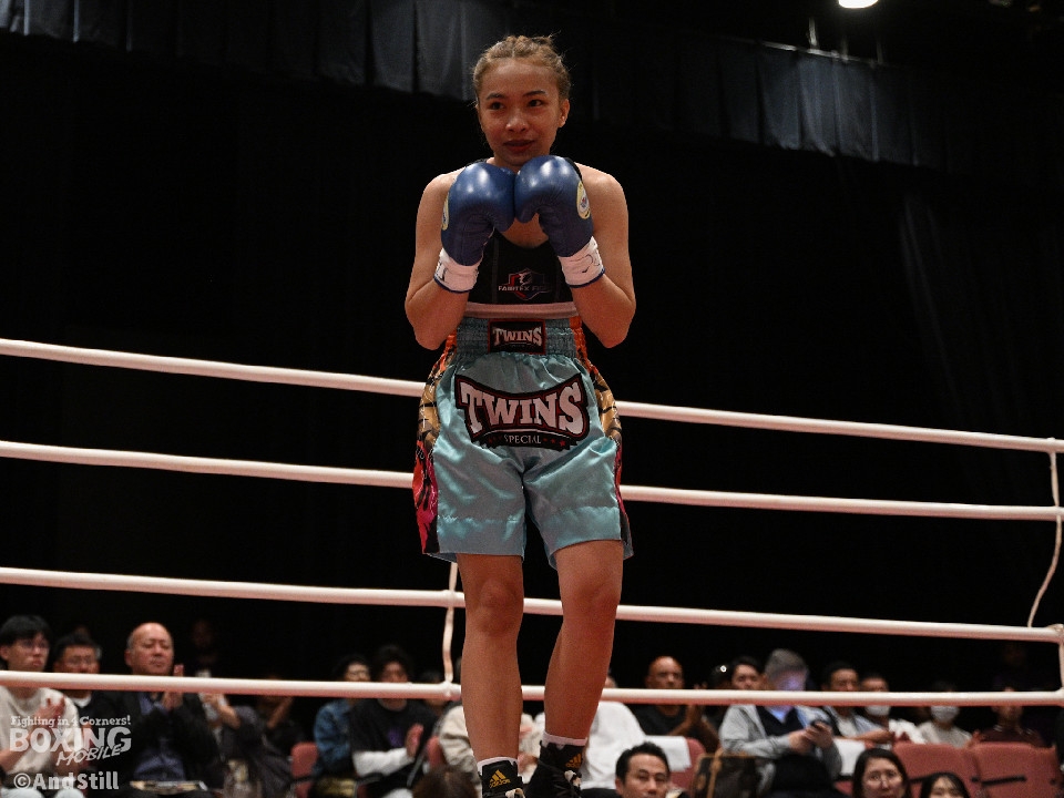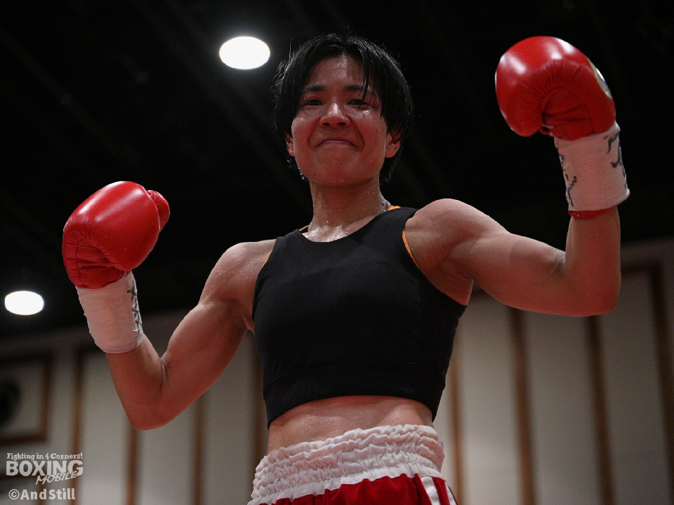 試合:元OPBF女子バンタム級王者の平安山は、ガードで被弾を回避すると相手のジャブにジャブを合わせてコツコツとヒットを重ねる。プラーンウィライはサークリングしながらワンツーで応戦。2回、平安山は右ストレートでアゴを跳ね上げると、再三右ストレートをヒット。強気に打ち返すプラーンウィライに攻勢をかけるとパンチをまとめてダウンを先取。大きなポイントだ。3回、今日の平安山はジャブが冴え渡った。ジャブを起点に顔を何度も弾くと、ワンツーからパンチをまとめてレフェリーストップを呼び込んだ。