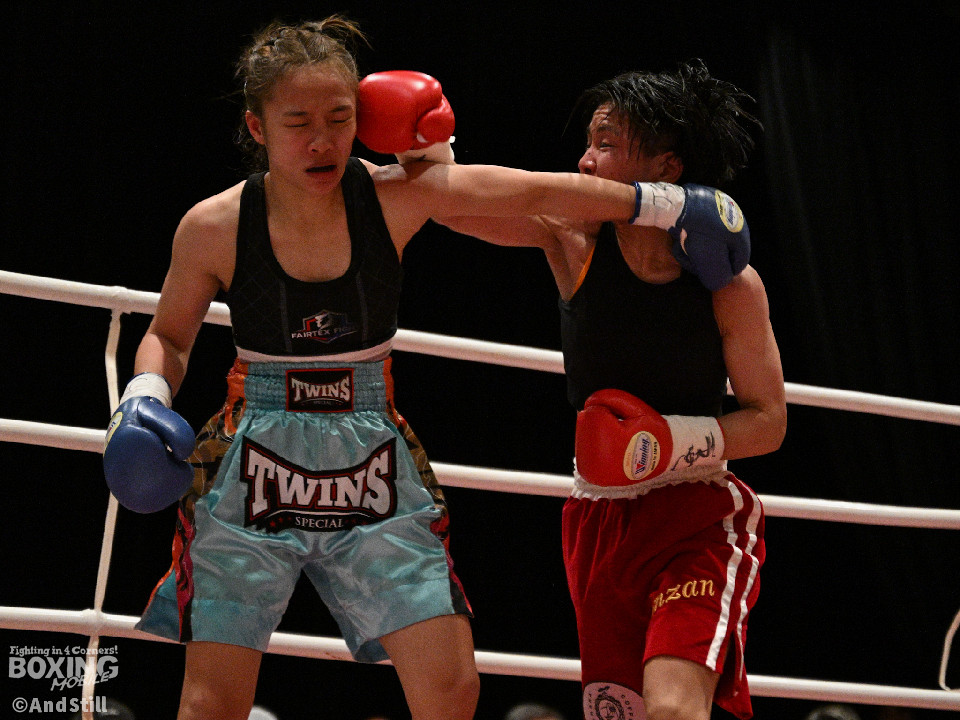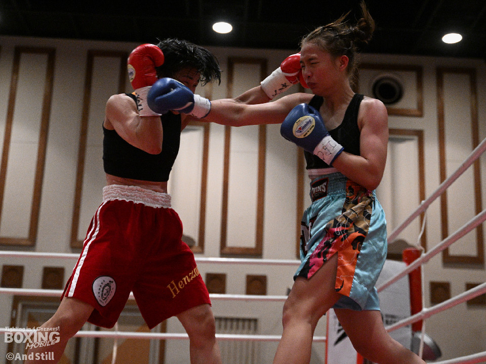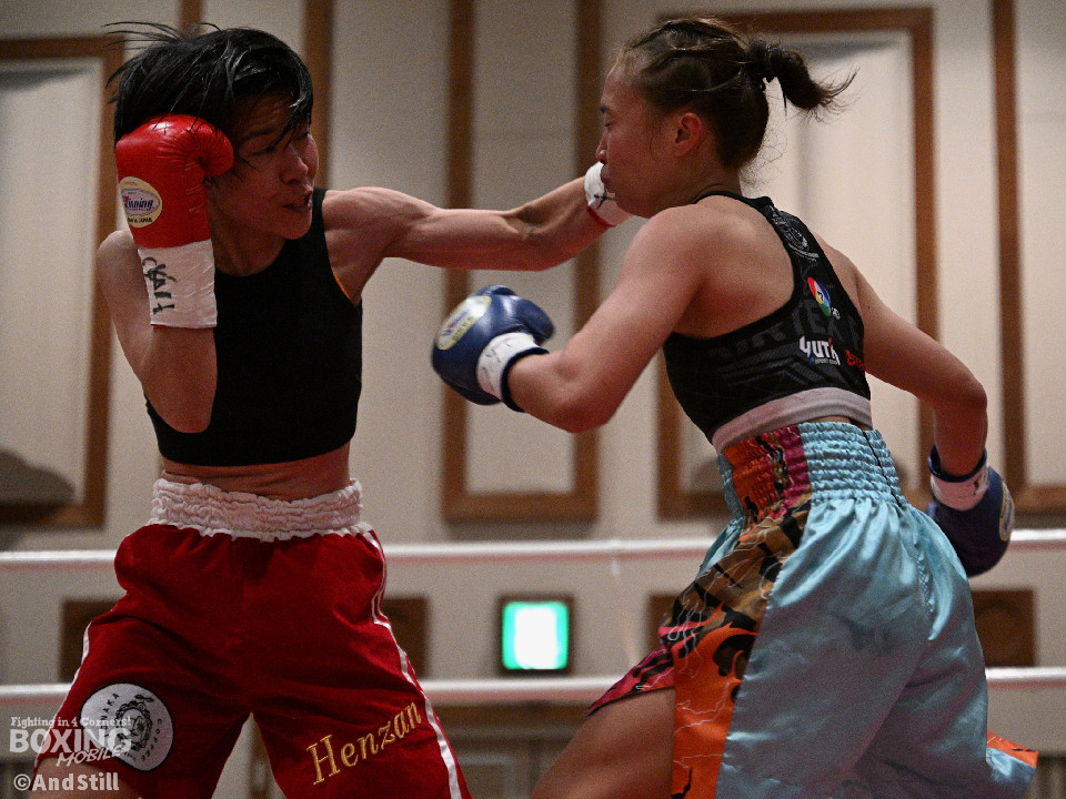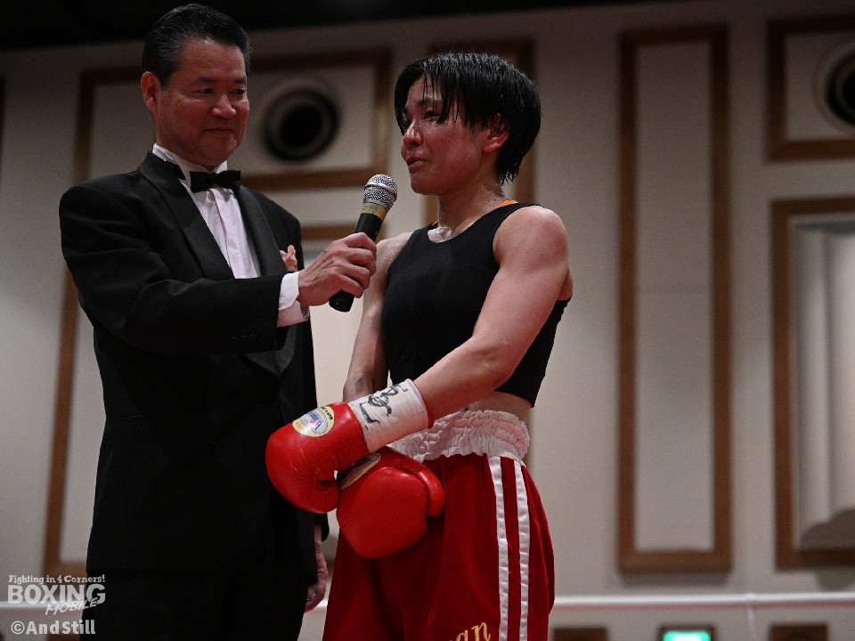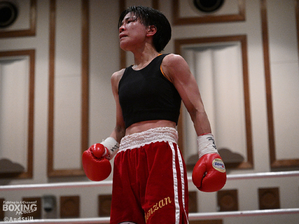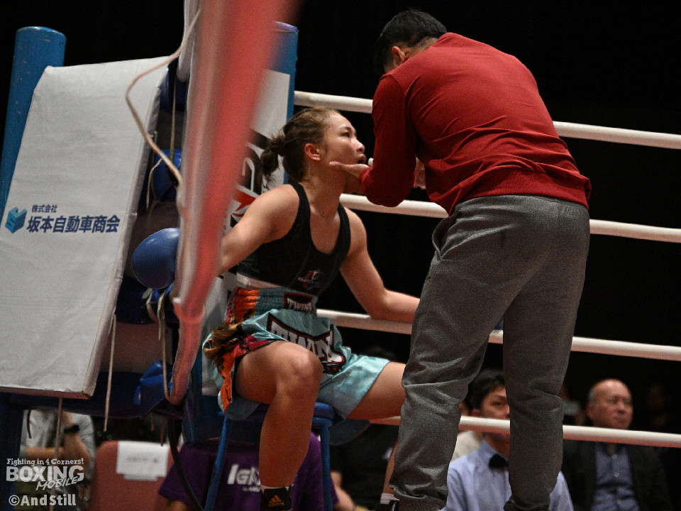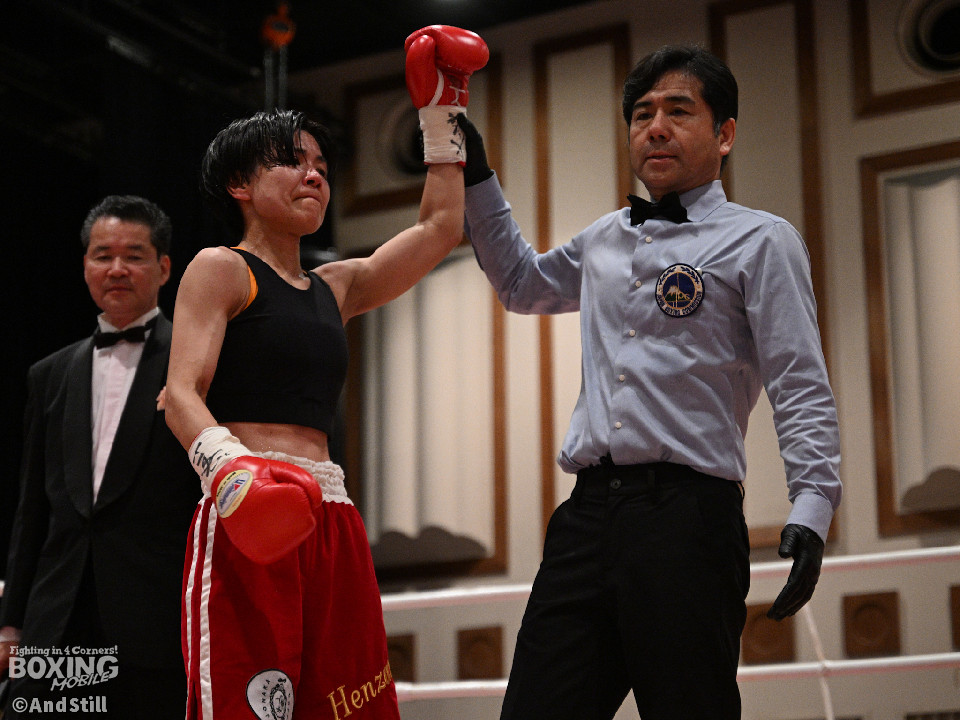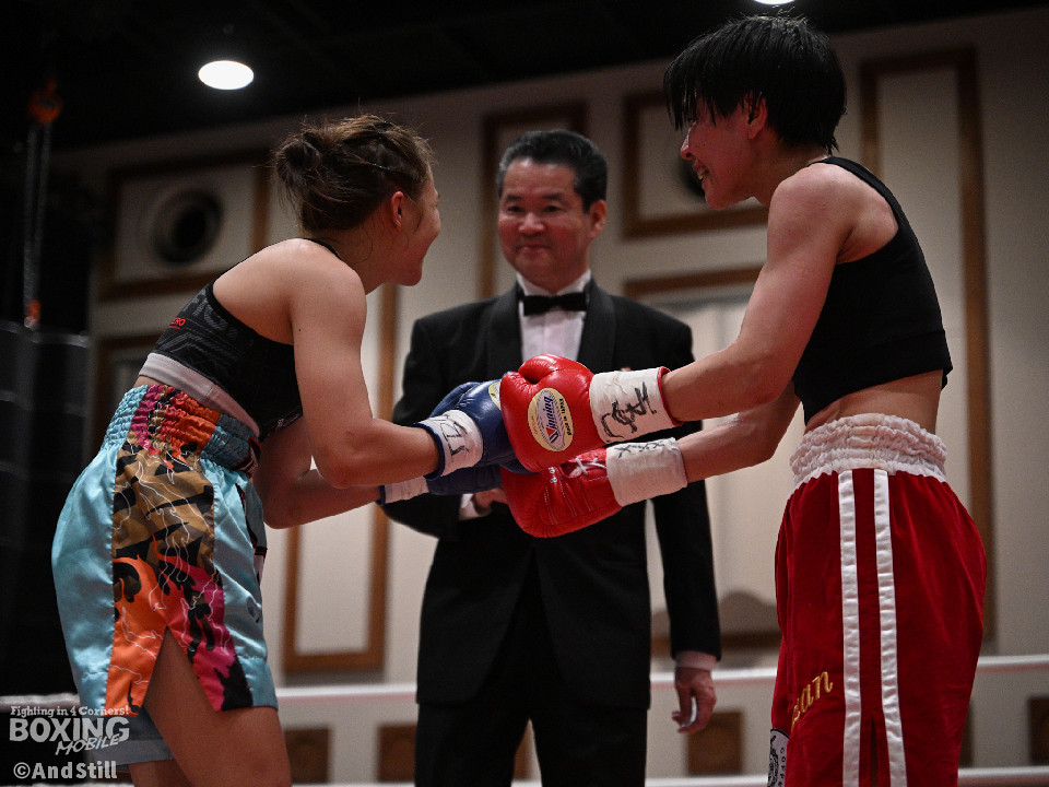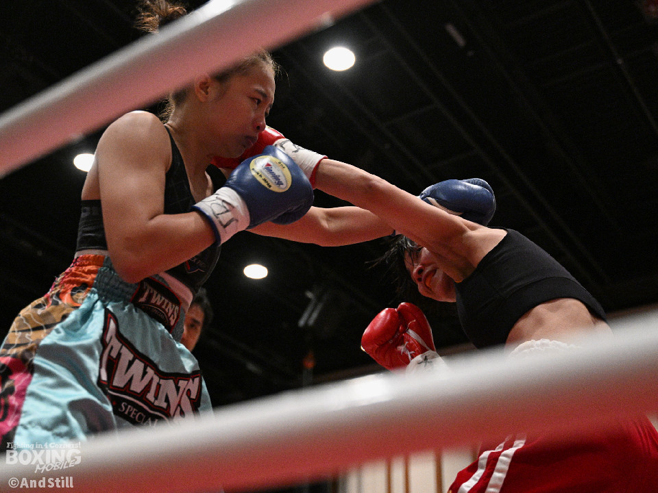 試合:元OPBF女子バンタム級王者の平安山は、ガードで被弾を回避すると相手のジャブにジャブを合わせてコツコツとヒットを重ねる。プラーンウィライはサークリングしながらワンツーで応戦。2回、平安山は右ストレートでアゴを跳ね上げると、再三右ストレートをヒット。強気に打ち返すプラーンウィライに攻勢をかけるとパンチをまとめてダウンを先取。大きなポイントだ。3回、今日の平安山はジャブが冴え渡った。ジャブを起点に顔を何度も弾くと、ワンツーからパンチをまとめてレフェリーストップを呼び込んだ。