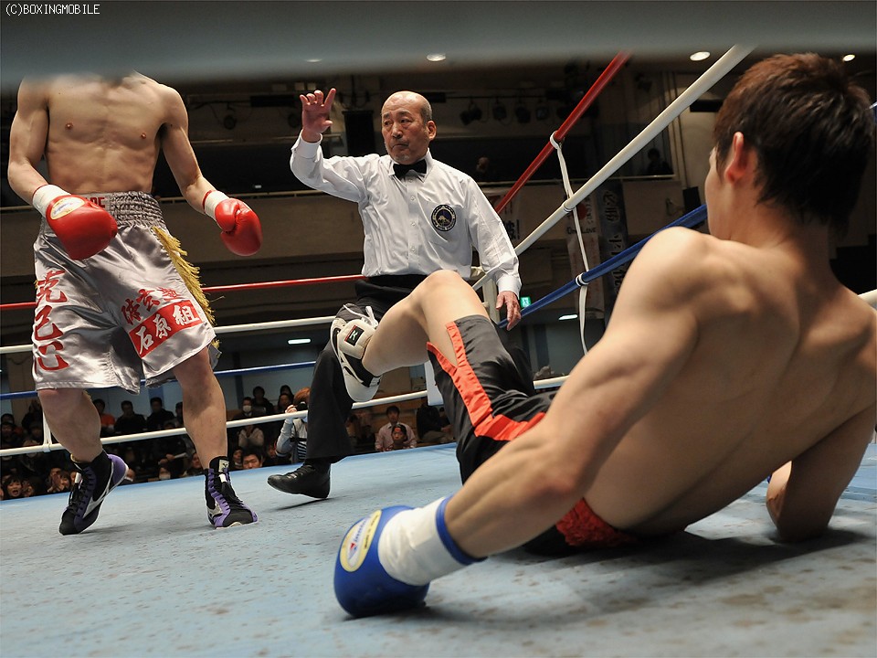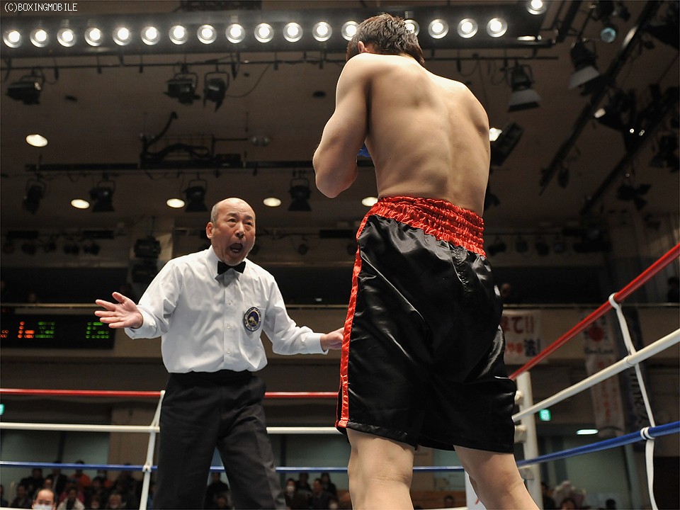 。すると平山は左フックで柏原の膝を揺らし、追撃の右ストレートで顔面を打ち抜きダウンを奪う。カウント8で立ち上がる柏原だが、足元がフラ付き10カウントが数えられた。★