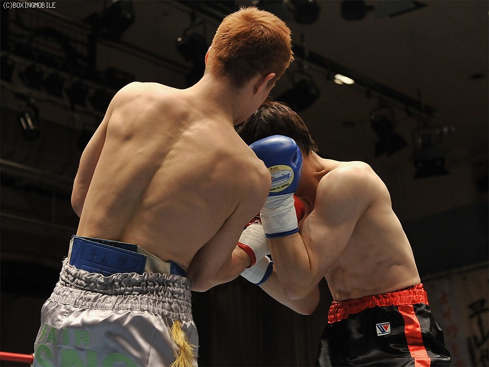 試合:平山の右ストレートが貫く!!ジャブの刺し合いでスタートするが、平山は左フック・右ストレートを柏原に浴びせペースを握る