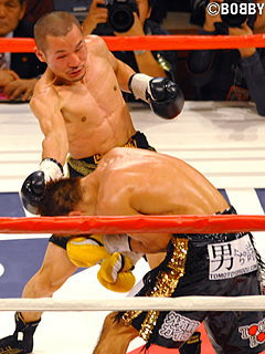 試合:序盤から名城・河野打撃戦を展開。ジャブ・ワンツーを主体に攻め、主導権を奪おうとする両者だが、2・3Rは名城がワンツー・左フックをヒットさせ、手数でもやや上回り名城がポイントを奪う。中盤、河野が奪われたポイントを奪い返す為に猛反撃を開始。インファイトを仕掛けたい名城に対し、ミドルレンジからジャブ・ワンツーをヒットさせる河野。名城が距離を詰めると河野が右アッパーをヒットさせ、名城に奪われたポイントを強引に奪い返す。7R、名城が河野のヒッティングで右目上をカット。終盤に入り、両者互いに一歩も引かない打撃戦を繰り広げる。河野が左ボディから左フックを名城にヒットさせれば、名城が距離を詰め、左右アッパーを河野にヒットさせる。11・12Rと共に手を休める事無く、無酸素状態で打ち合いを続ける。右ストレート・左フック・左ボディと共に持てる力を振り絞り、退る事無く王座を掴む為、打ち合う名城と河野。最終12R終了のゴングが鳴り、試合は判定に委ねられた。判定は115-114名城・115-114河野。そして、115-114名城と、勝利の女神は名城の名前を告げた。WBA世界スーパーフライ級新王者は、再び名城信男が執念で返り咲く事となった。