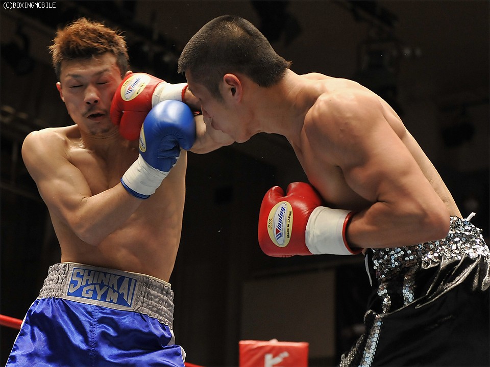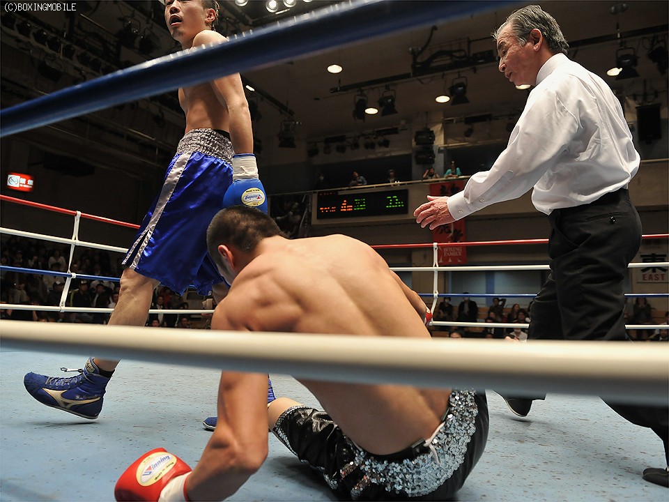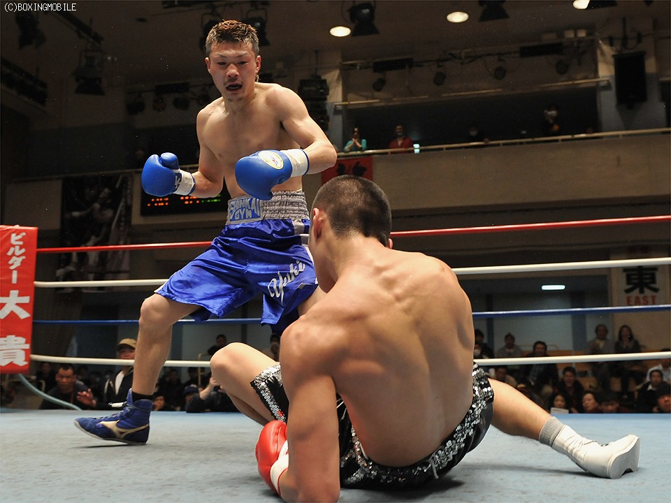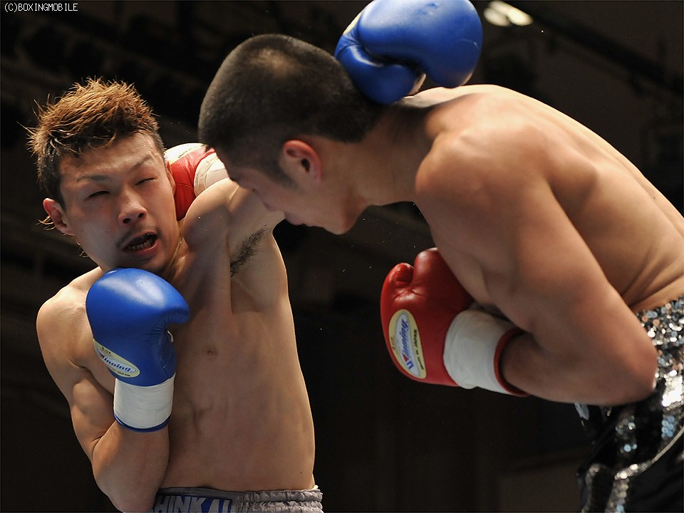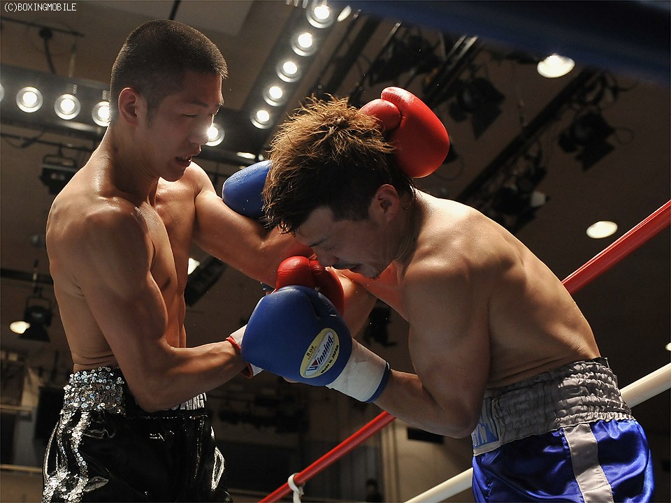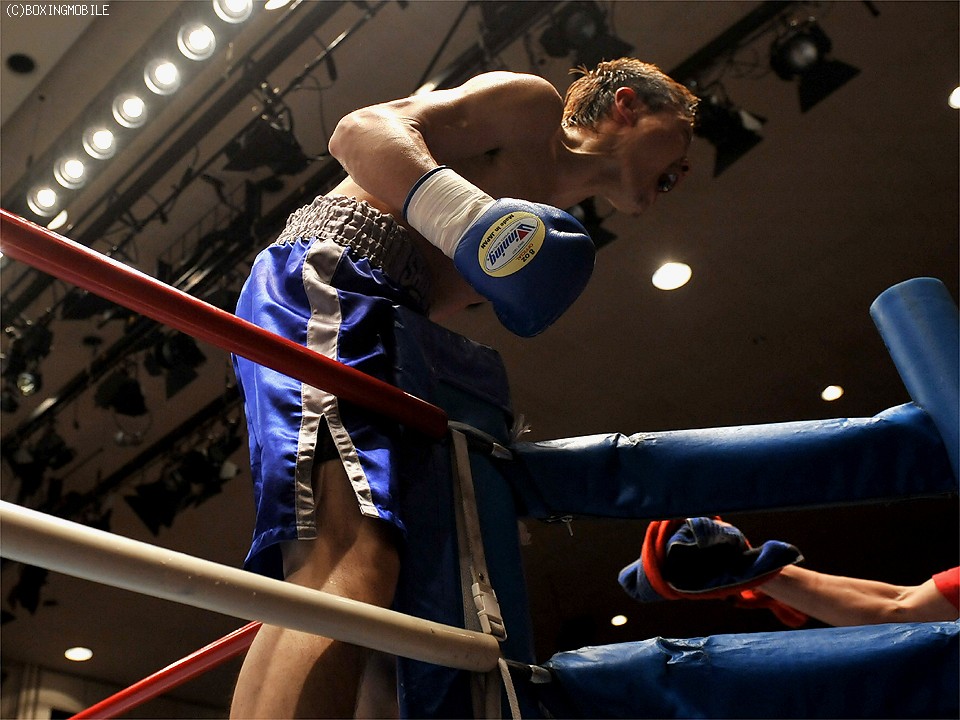 試合:足を使い、上体を振りながら距離を詰める前之園に対し、岩崎はジャブで距離を取り右の強打を狙う。2R、前之園は、ジャブ・ワンツーと的確に有効打を奪うと、ロープ際に追い込んだ岩崎に、左フック・右アッパーを叩き込みダウンを奪う。続く3Rも前之園のが、主導権を握る展開となるが、岩崎は守りを固めてカウンターを狙う。4R、好戦的に有効打を狙う前之園に、岩崎のワンツーが炸裂しダウンを奪う。立ち上がる前之園に連打を浴びせると、岩崎の左フックがアゴを捕え、またもダウン。セコンドから、タオルが投げ込まれ試合終了。 ★