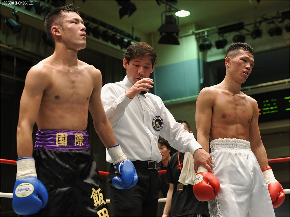 試合:手数で勝る丸山はテンポよく足を使って距離を詰めるが、飯田も足を使って同じリズムからワンツーを狙って応戦。最終回は至近距離で最後まで打ち合った両者。結果はドロー。終始先に手を出した丸山が優勢ポイントで勝り新人王トーナメント2回戦へ