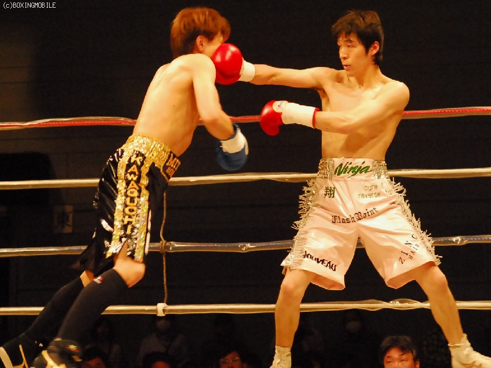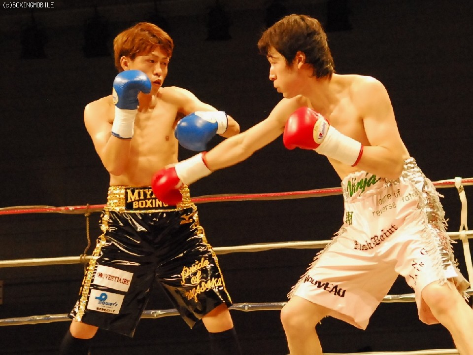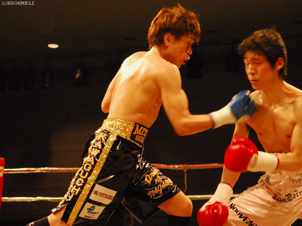 試合:サウスポーの中澤は左ジャブを川口のガードを割って当てていく。対し川口は、距離を詰め右ボディストレートを狙う。