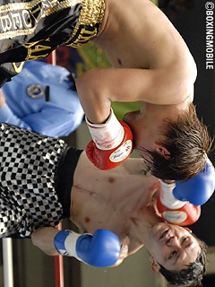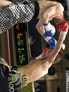 試合:井川(前:関ジム)の移籍第1戦。1~2R、井川がジャブで距離を計り、冷静に上間の変則スタイルに対処。時折り左フック・ワンツーを上間にヒットさせ主導権を掴もうとするが、2R終了間際、上間の左フックがクリーンヒットし、井川ダウン。ここは立ち上がり、井川はゴングに救われる。3R、ダウンを取られた井川はプレスを掛け、前に出る。上間もこれに応戦し、右ストレート・左フックをヒット。しかし両者の距離が詰まると、頭が当たってしまい上間が左頭頂部を大きくカット。この傷が4Rの打ち合いに中で広がり、5R開始と同時にドクターチェック。これ以上続行不可能と判断され、5R負傷判定に。2Rにダウンを奪った上間が判定2-0で勝利を掴んだ。井川移籍第1戦は、無念の判定負けとなった。