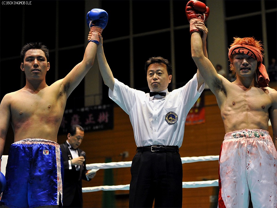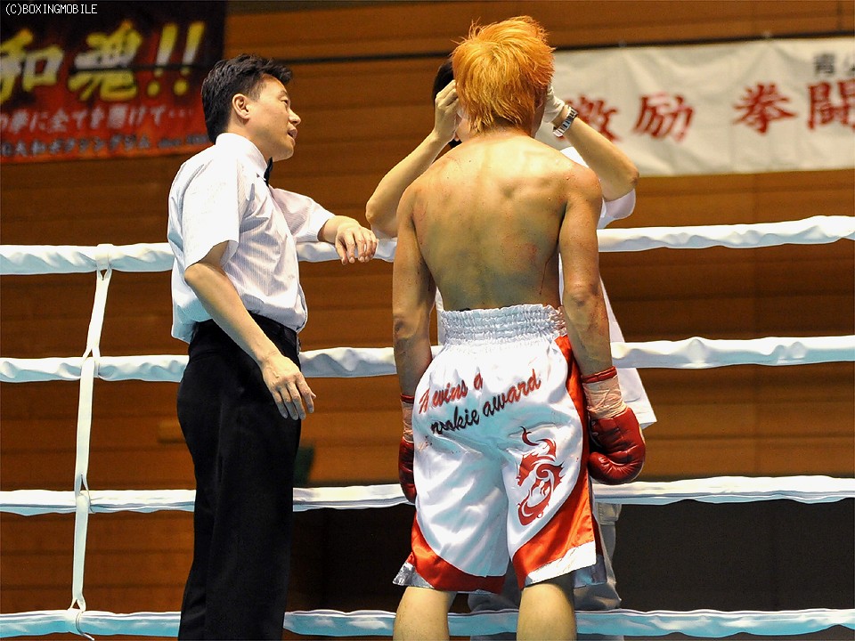 試合:西山がプレスをかけ、1Rから頭を付けての打ち合いに。西山がワンツー、アッパーを打ち込めば、坂口も左右フックを返し、我慢くらべが続く。しかし2Rに偶バツで坂口が負傷。ストップを恐れた坂口は猛アタックをかけるが、傷が広がり負傷判定となった。
