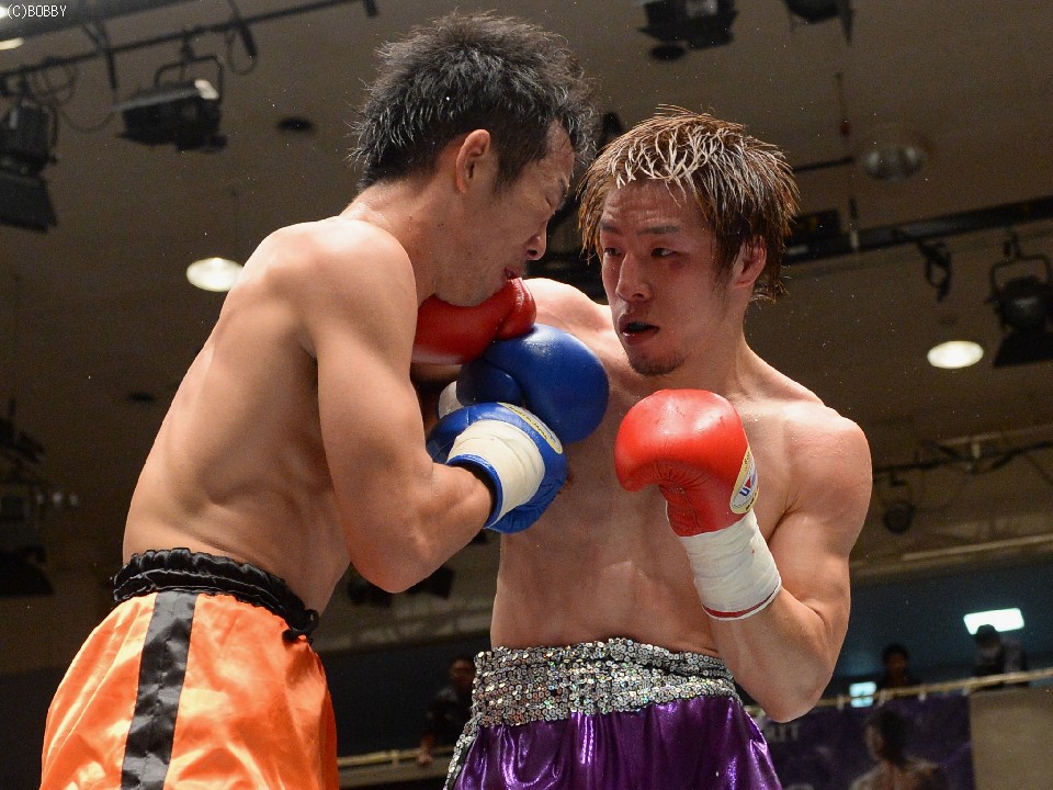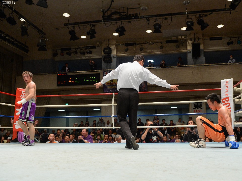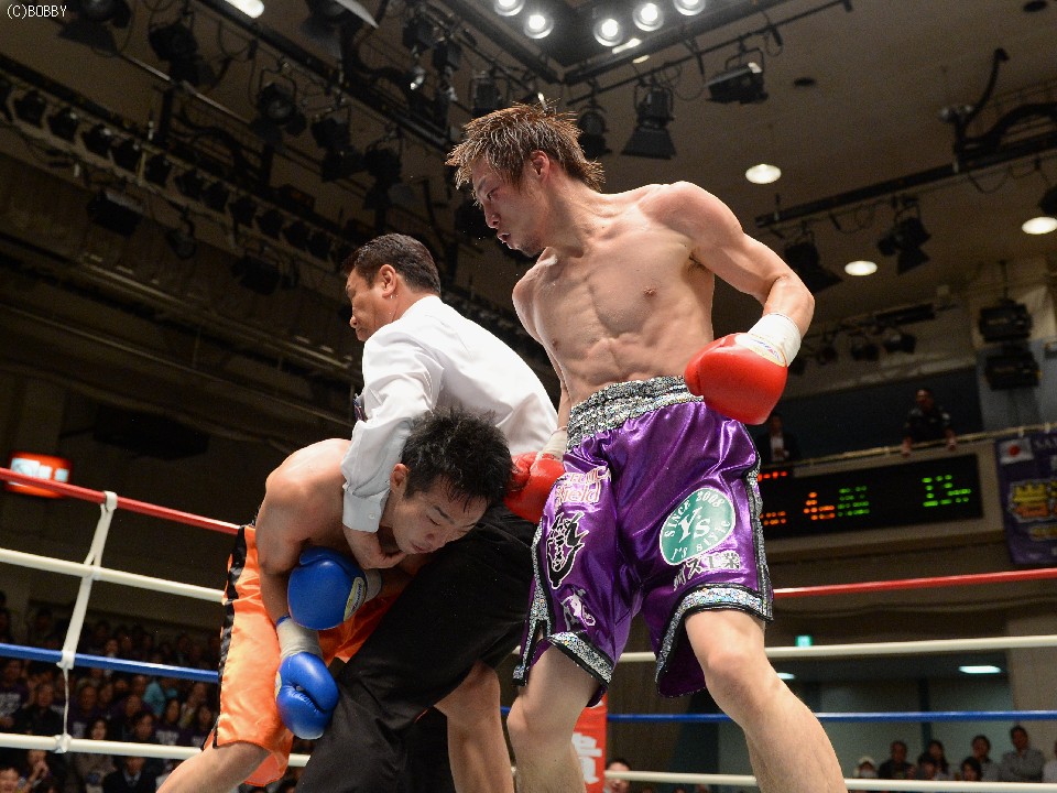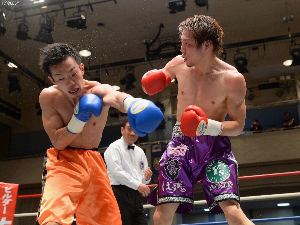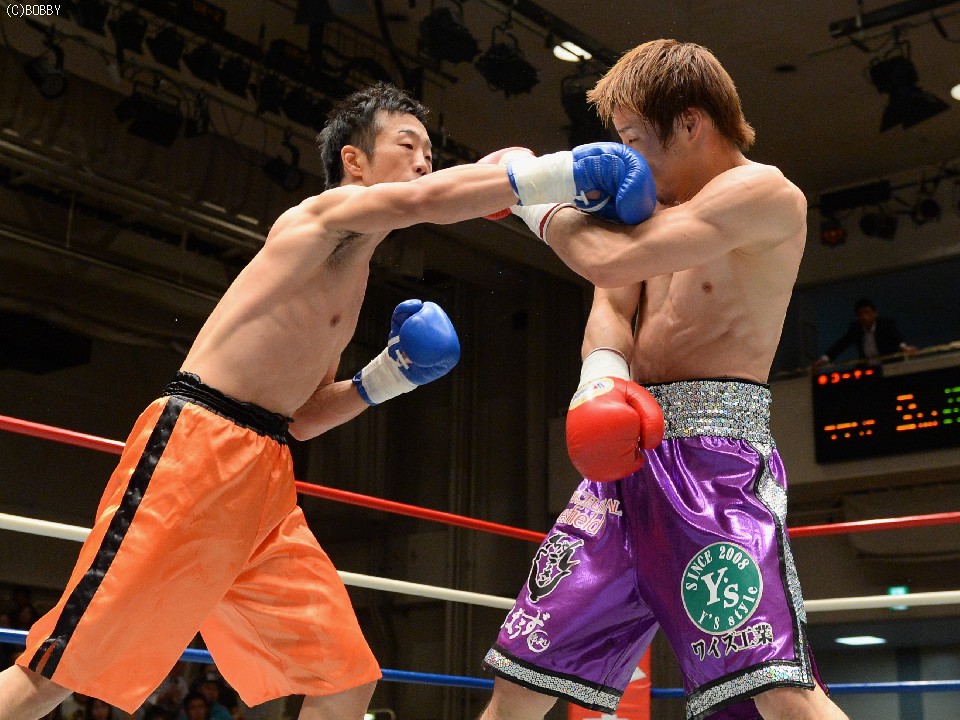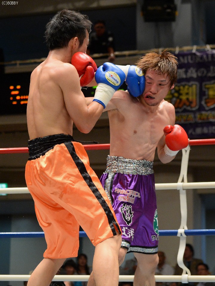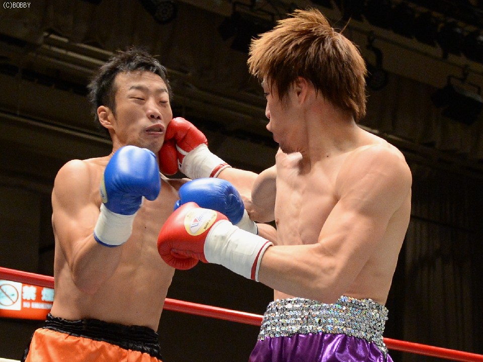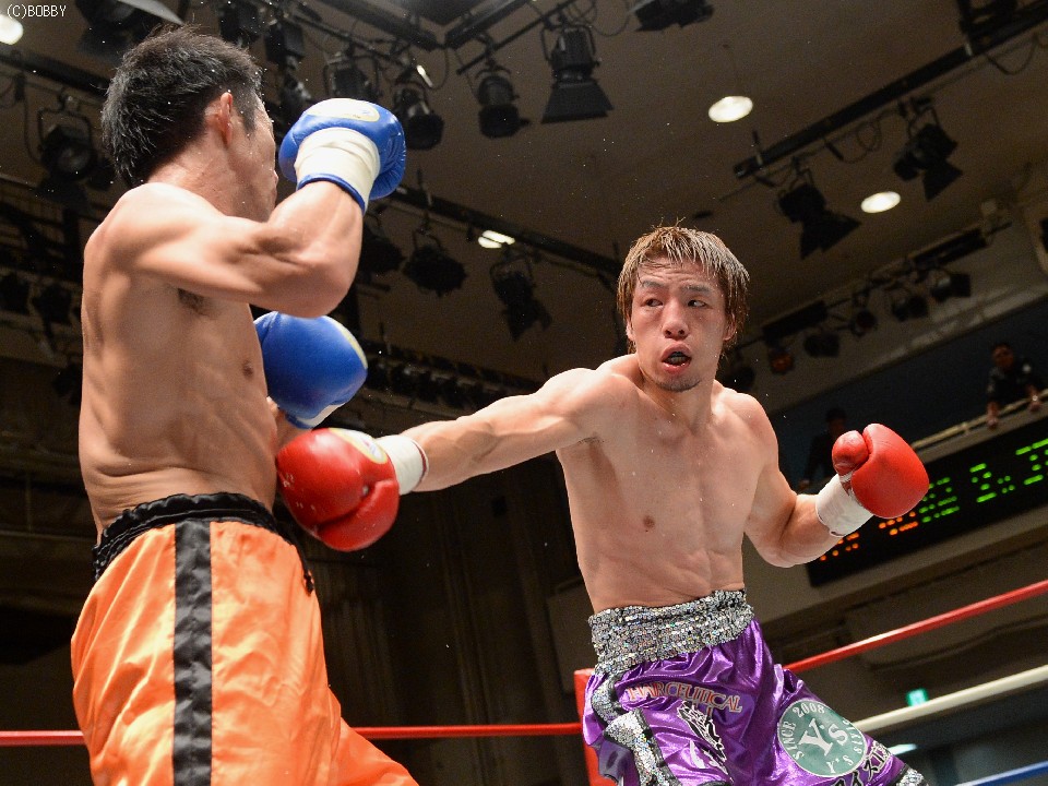 試合:岩渕の半年ぶりの再起戦。昨年度の西日本新人王の小川は、足を使って距離を保ち、圧力をかけるサウスポー岩渕の勢いをジャブ、ワンツーで封殺。ストレートで岩渕の顔を跳ね上げるなど、右のタイミングは合っている。岩渕は試合感が戻らないのか、今ひとつ本来のキレのある姿が見れず。防御の反応も悪く、相打ちでの左ストレートがヒットするだけ。苦しい岩渕を尻目に、調子を上げていた小川だったが、4Rの打ち合いで岩渕の左ストレートが決まりダウン。起き上がり、立て直しを計る小川だったが、今度は勢いついた岩渕を止められず連打を浴びストップ。岩渕は再起戦をTKO勝利で飾ったが、不安要素は残った。