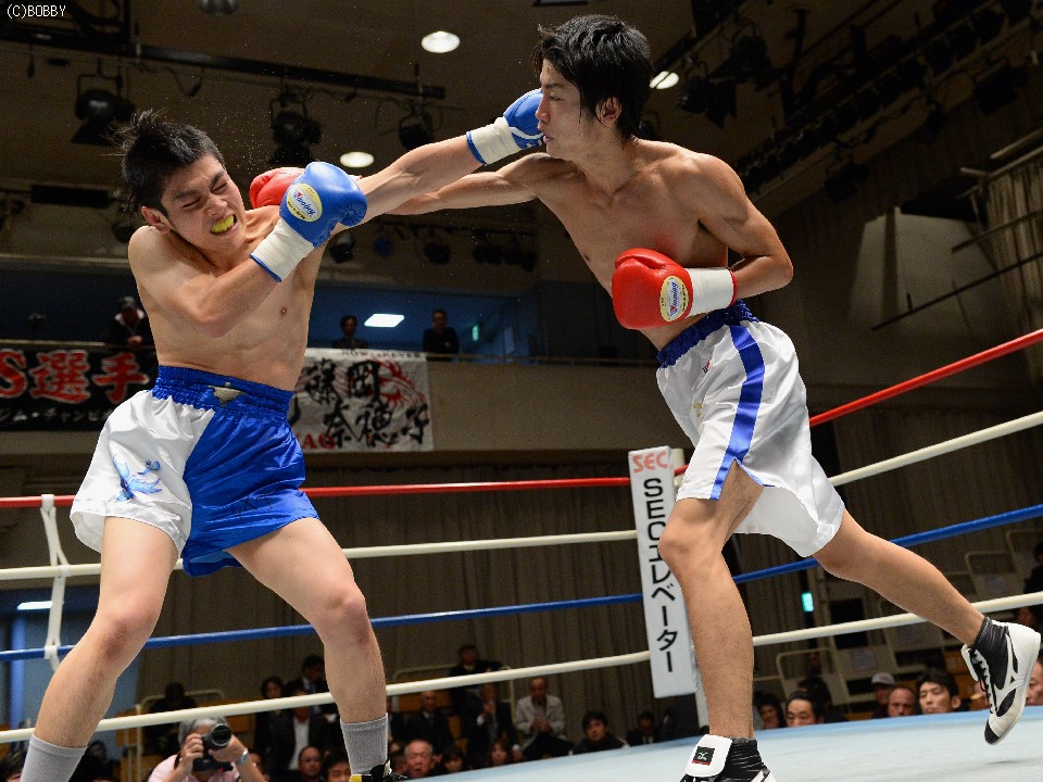試合:B級昇格に大手の小原は、ジャブの刺し合いからワンツーをヒットさせる。これでリズムが出てきた小原は2R、左フック、右ストレートで攻勢。対し今年の新人王予選敗退の金城も、どうにか懐に入ろうと手を伸ばすが、身長、リーチで上回る小原の左に阻まれてしまった。