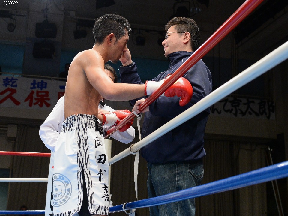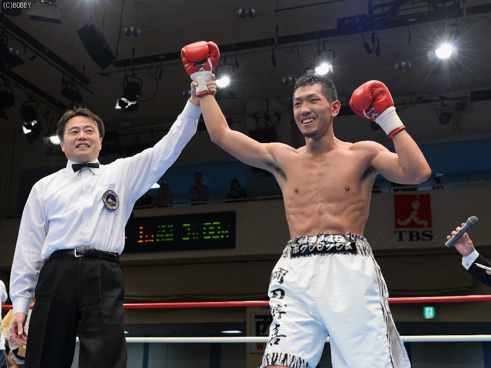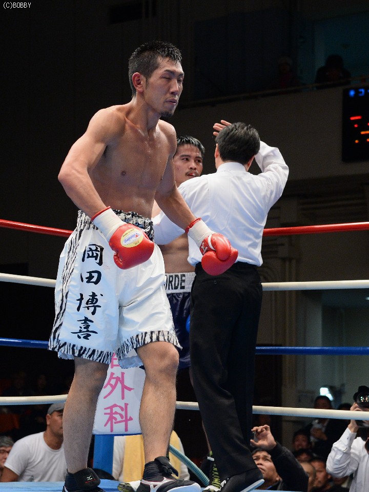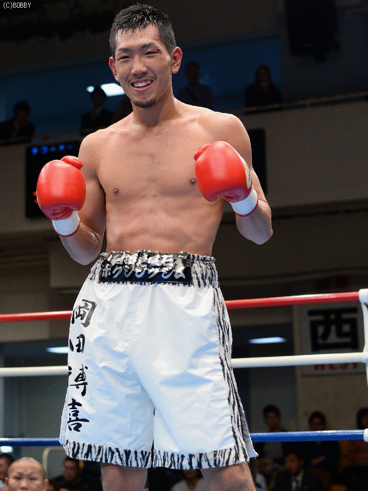 試合:大声援に後押しされてリングインした岡田。プレスをかけて距離を詰める岡田はイグナシオにロープを背負わせてノックアウトのタイミングを計るが左のリードの後が出ない。テンポアップしたのは3R、岡田がロープを背にするイグナシオにワンツーとボディで仕留めにかかる。が、イグナシオは左ボディとカウンターで応戦。打たれ強いイグナシオは変則的な左アッパーボディを返して決定的チャンスを許さず。優勢に試合を組み立てる岡田。最後ラウンドに漸く連打をまとめた岡田がTKO勝利。