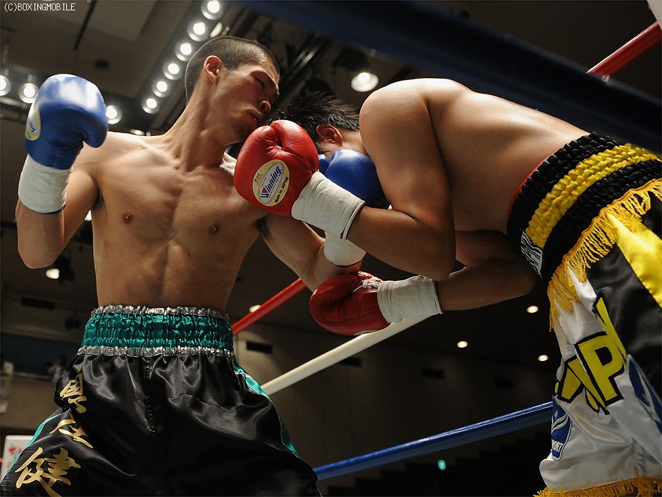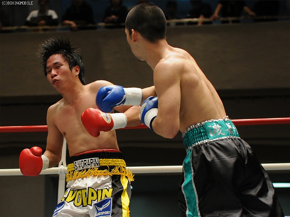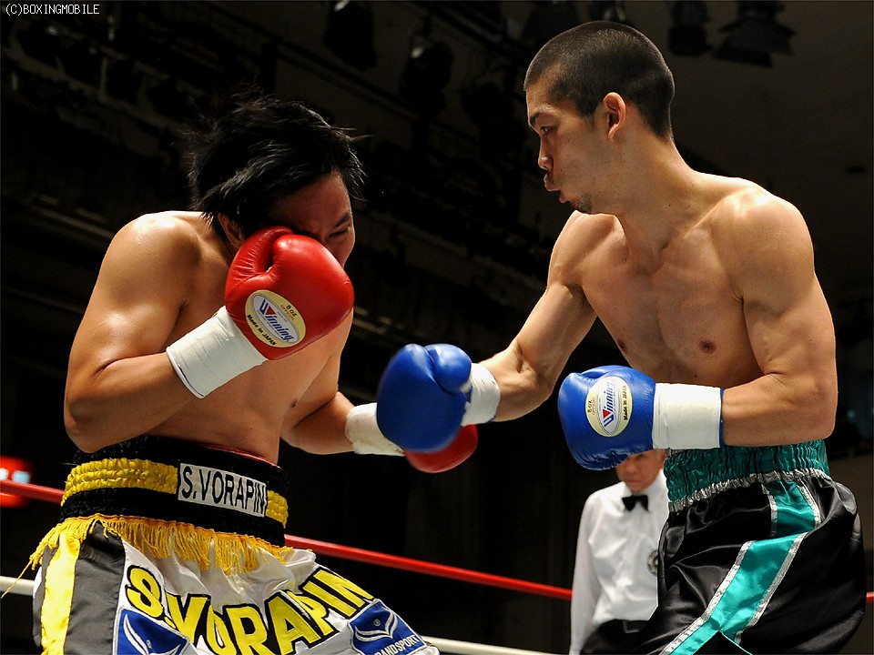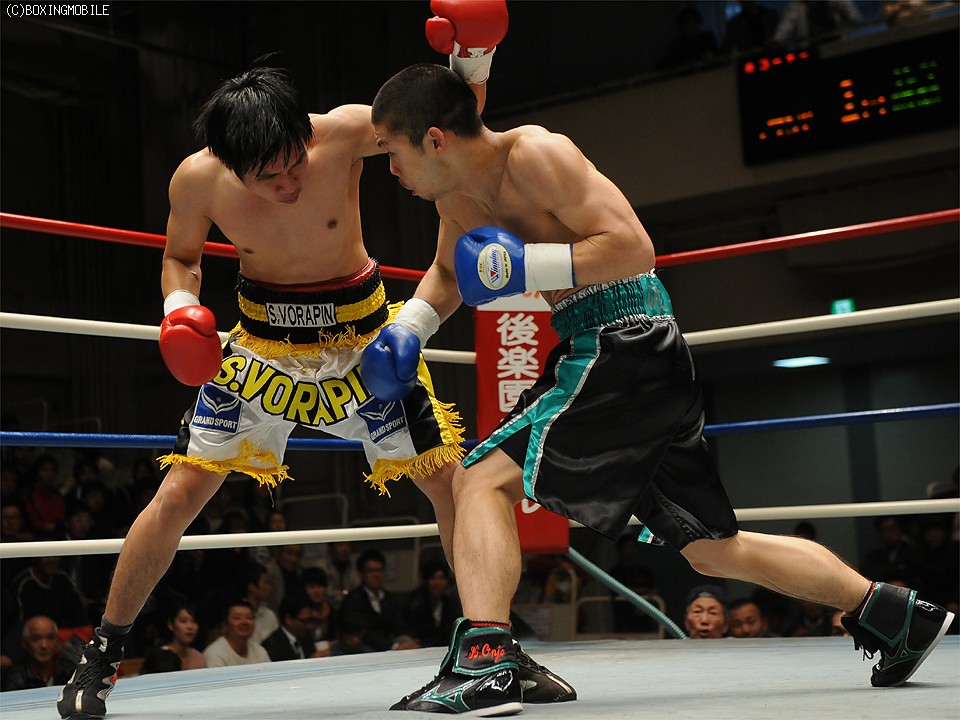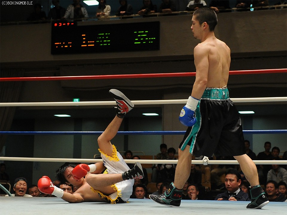 試合:豪快なボディを突き刺され、後退するソビスを最後は右ストレートでキャンバスに沈めた。