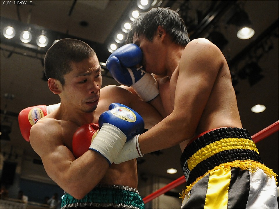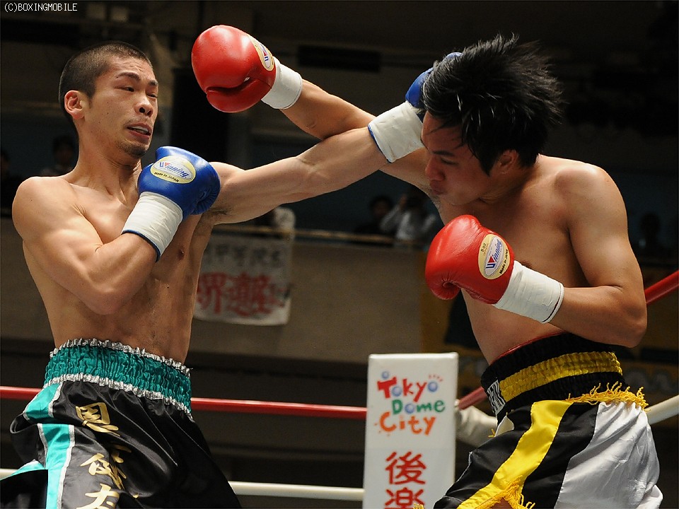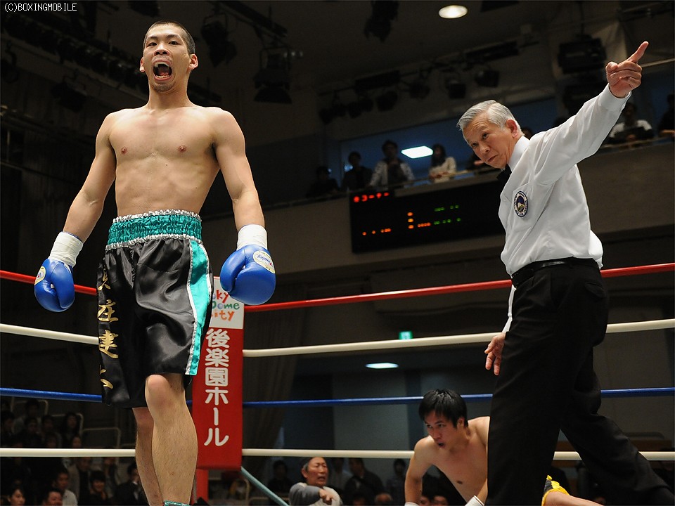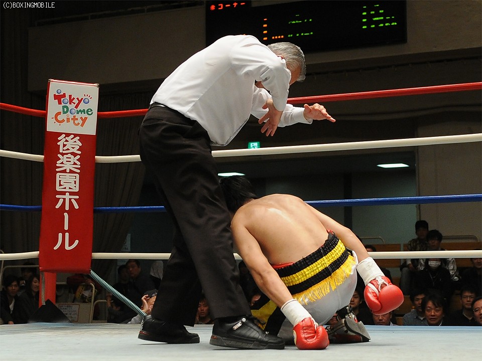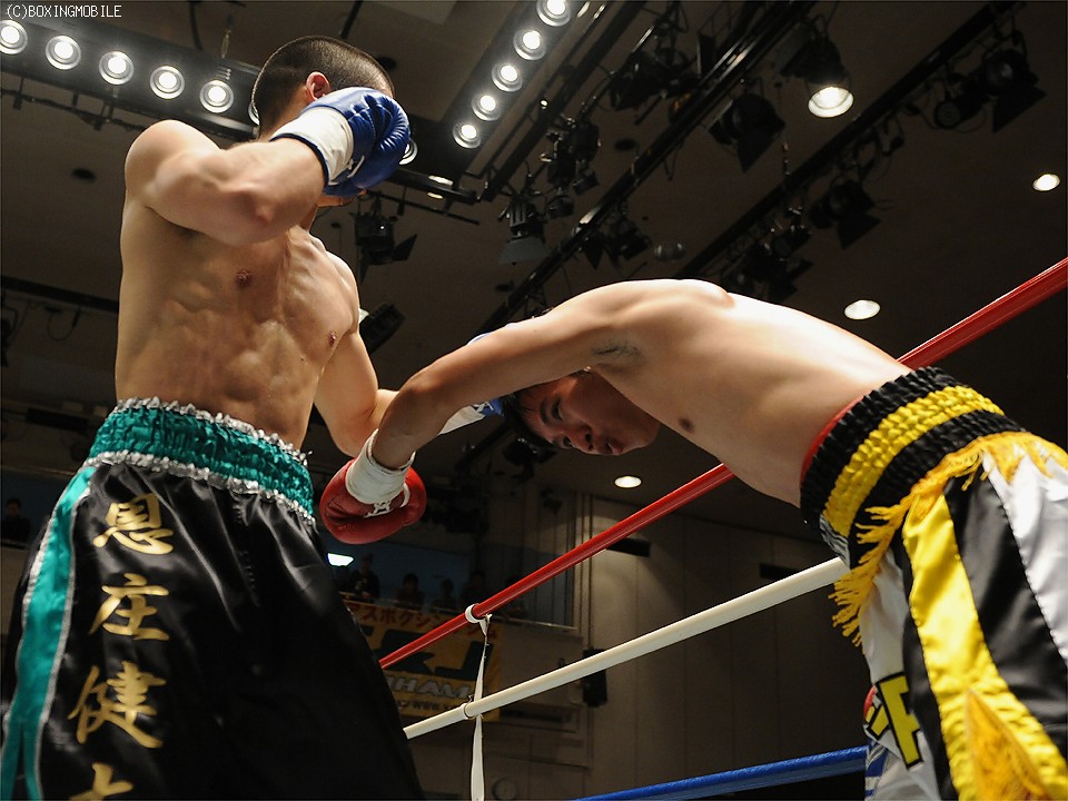 試合:豪快なボディを突き刺され、後退するソビスを最後は右ストレートでキャンバスに沈めた。