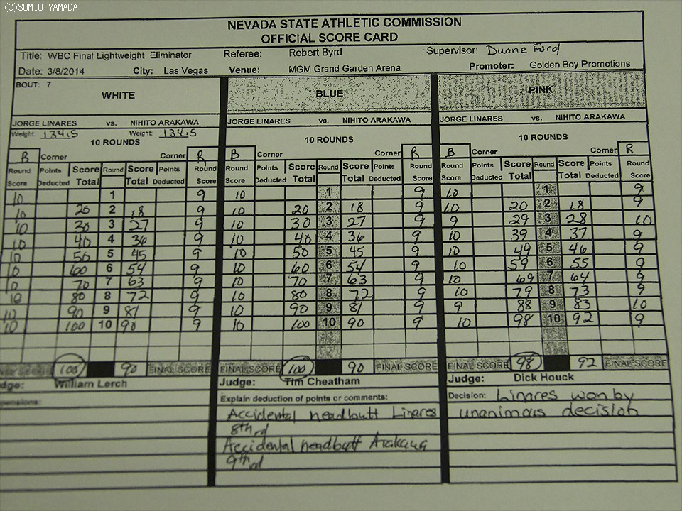 採点は二者が100対90、もうひとりも98対92の大差でリナレスを支持していた。WBCのライト級王座への挑戦権を獲得したリナレスは39戦36勝(23KO)3敗。8ヵ月前のオマール・フィゲロア(米)戦に続く敗戦となった荒川は29戦24勝(16KO)4敗1分。