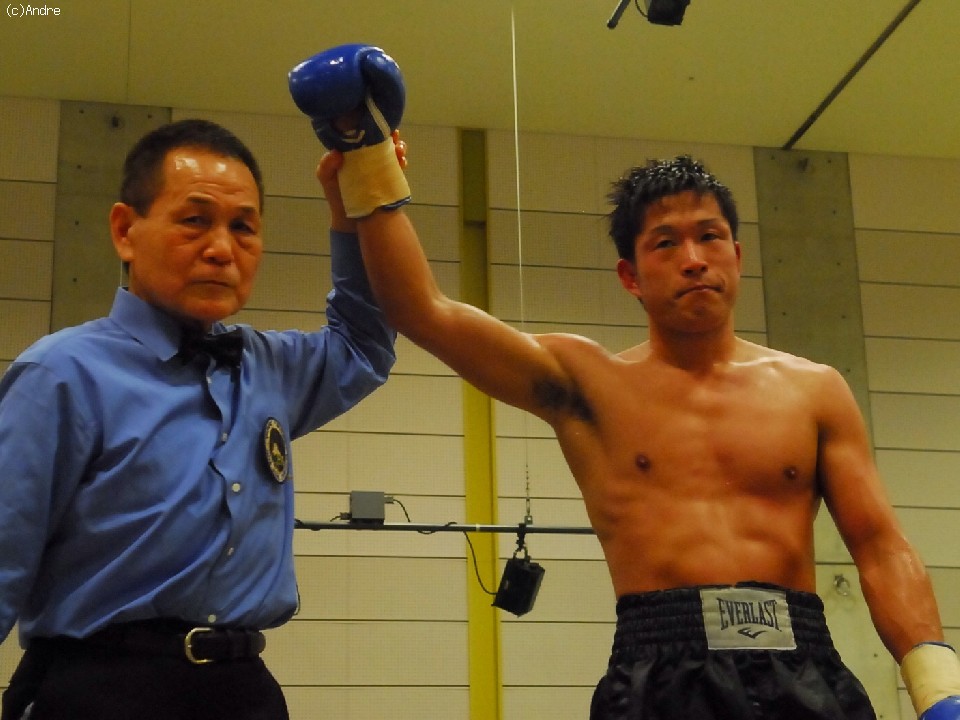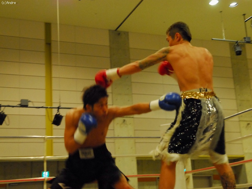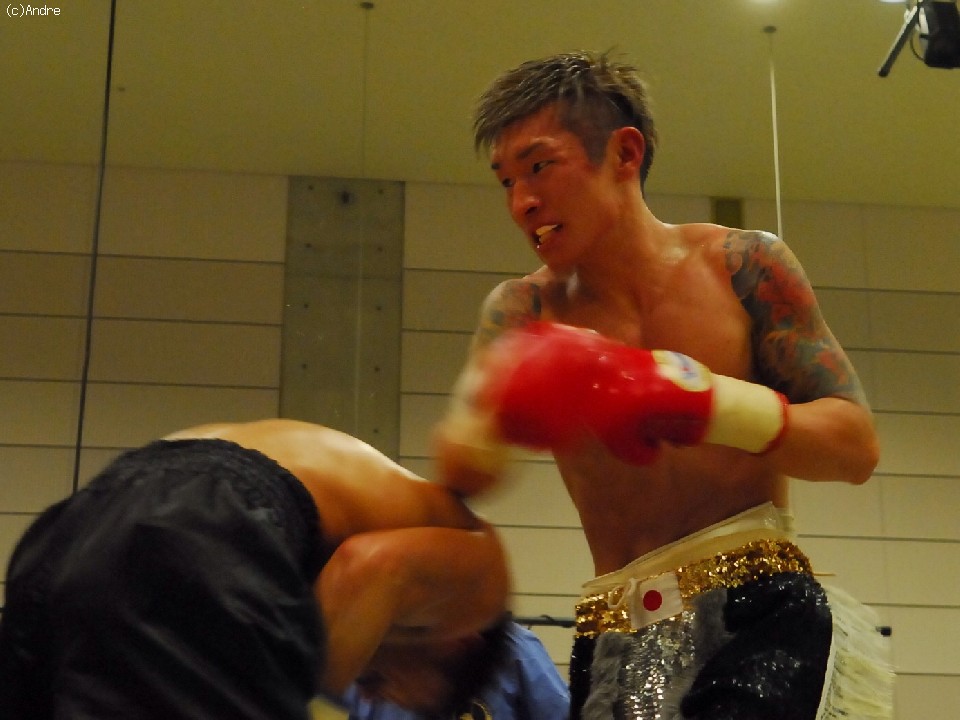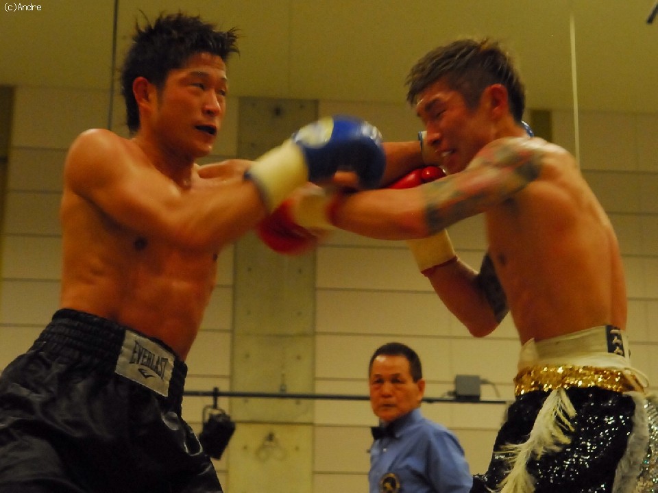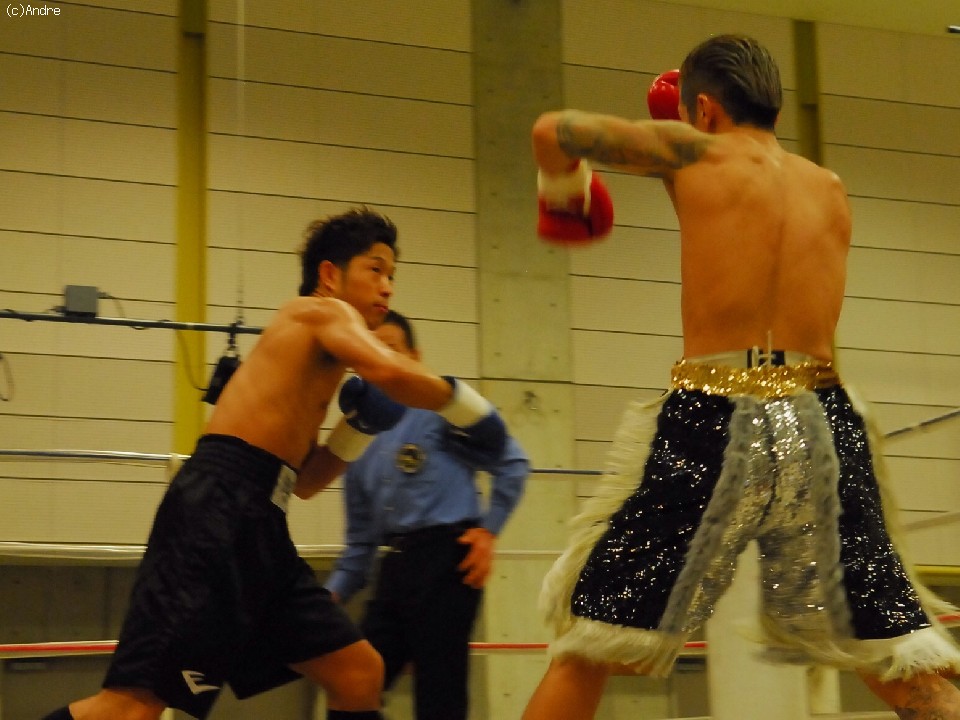 試合:スピードの嶋津に対してパワーの林崎の対戦。序盤は両者距離奪い合い。嶋津は左ジャブから鋭く踏み込むと回転の速いワンツーを繰り出す。対して林崎は接近して渾身の左右のフックを顔面にあてていく。終盤、執拗にボディを狙う林崎に対してカウンターを狙う嶋津の戦い。後半盛り返した林崎の判定勝利。