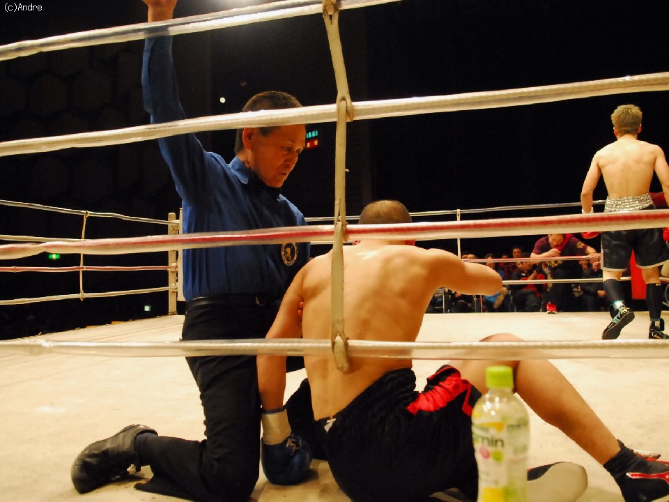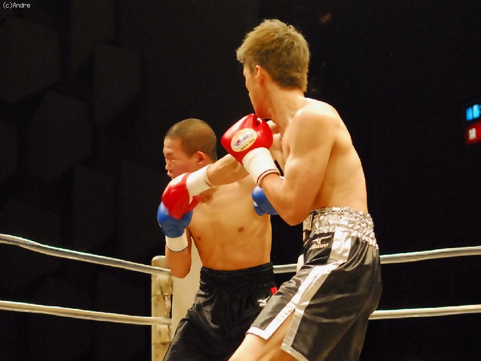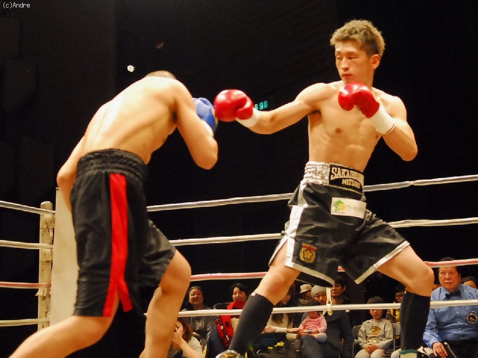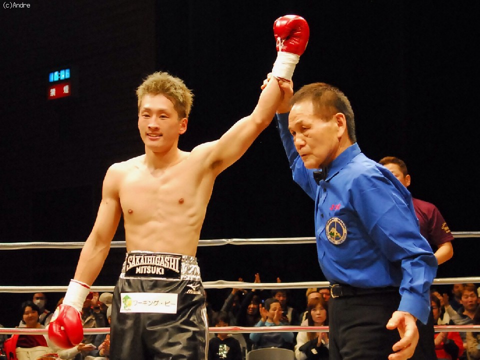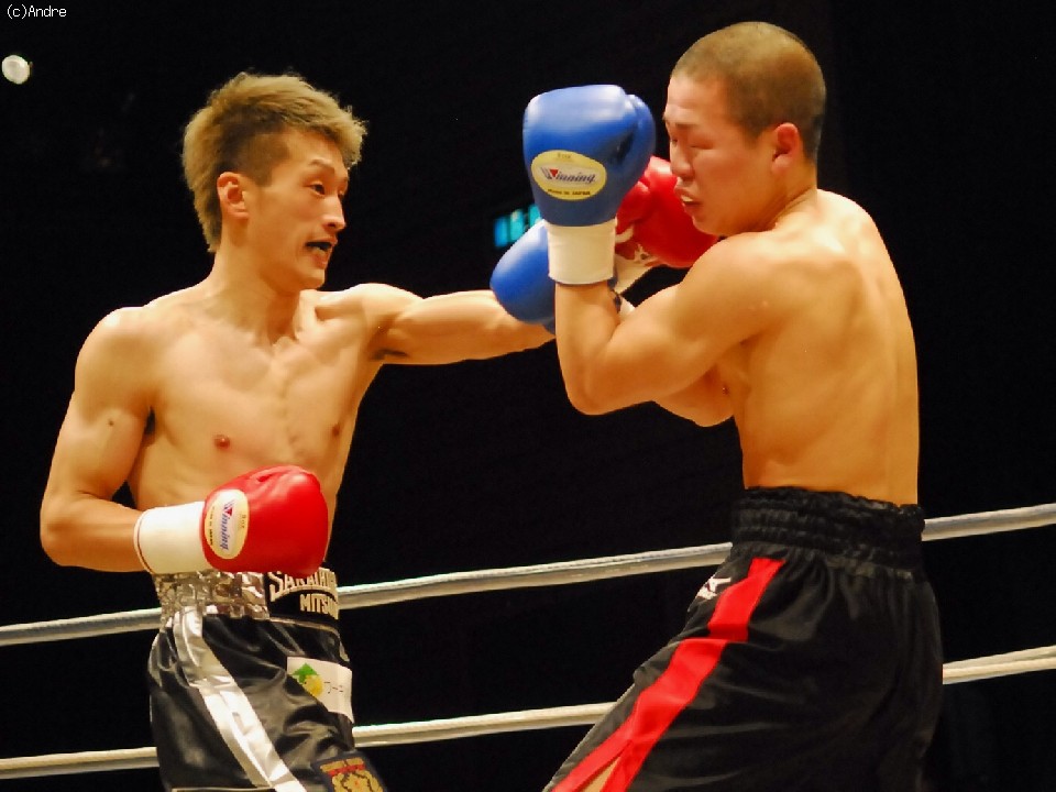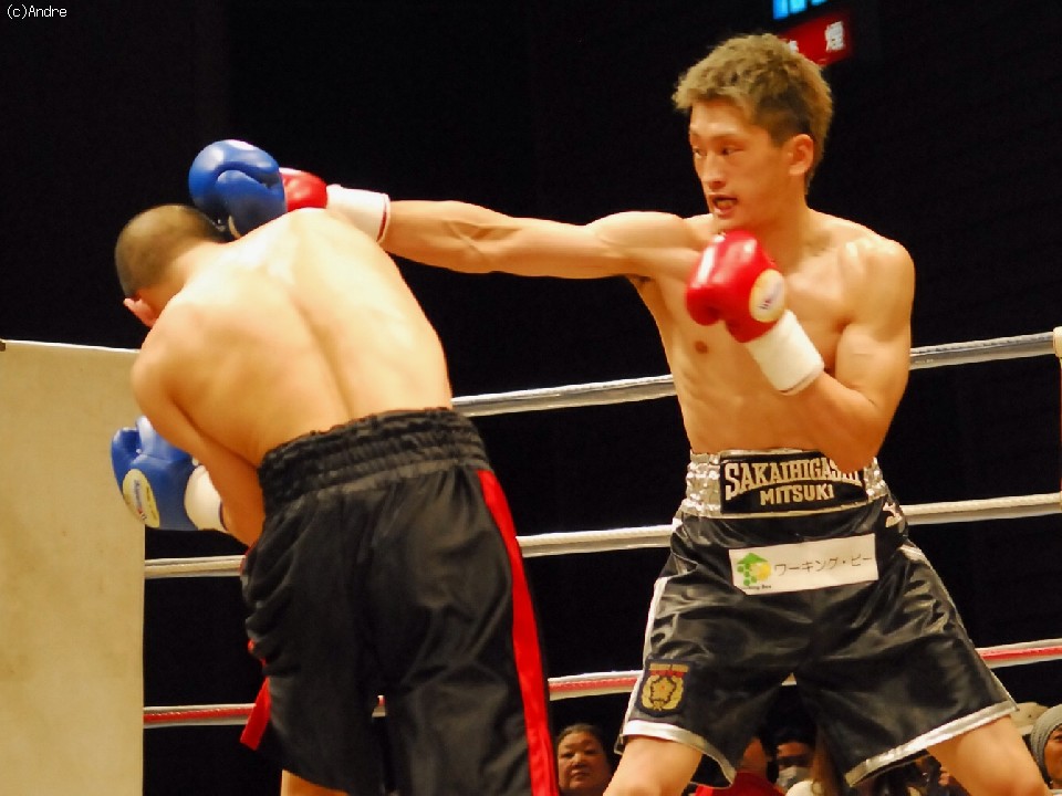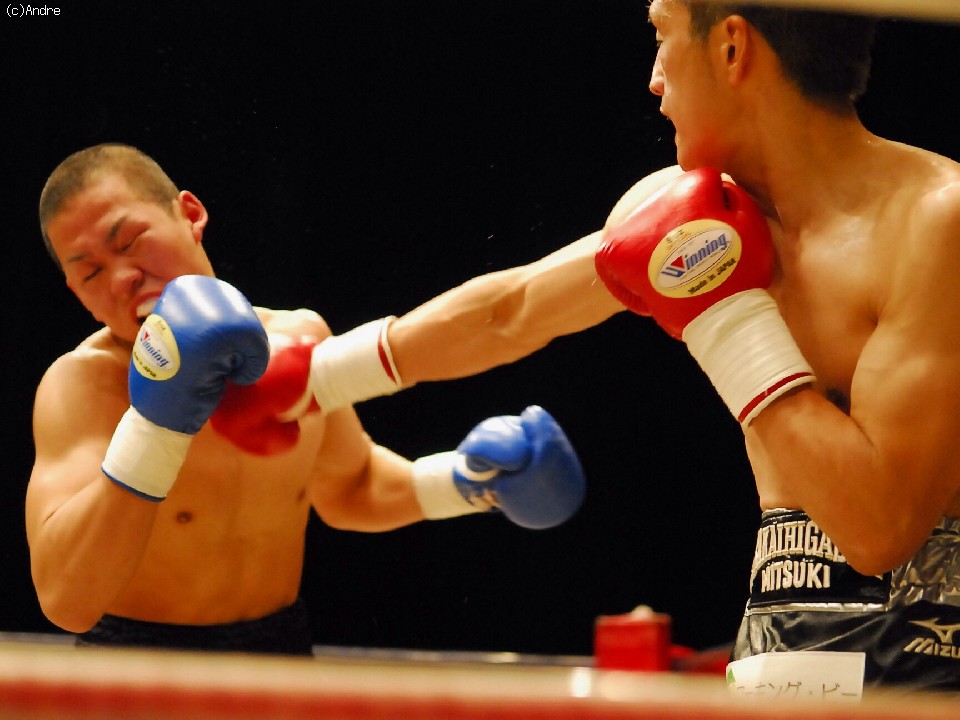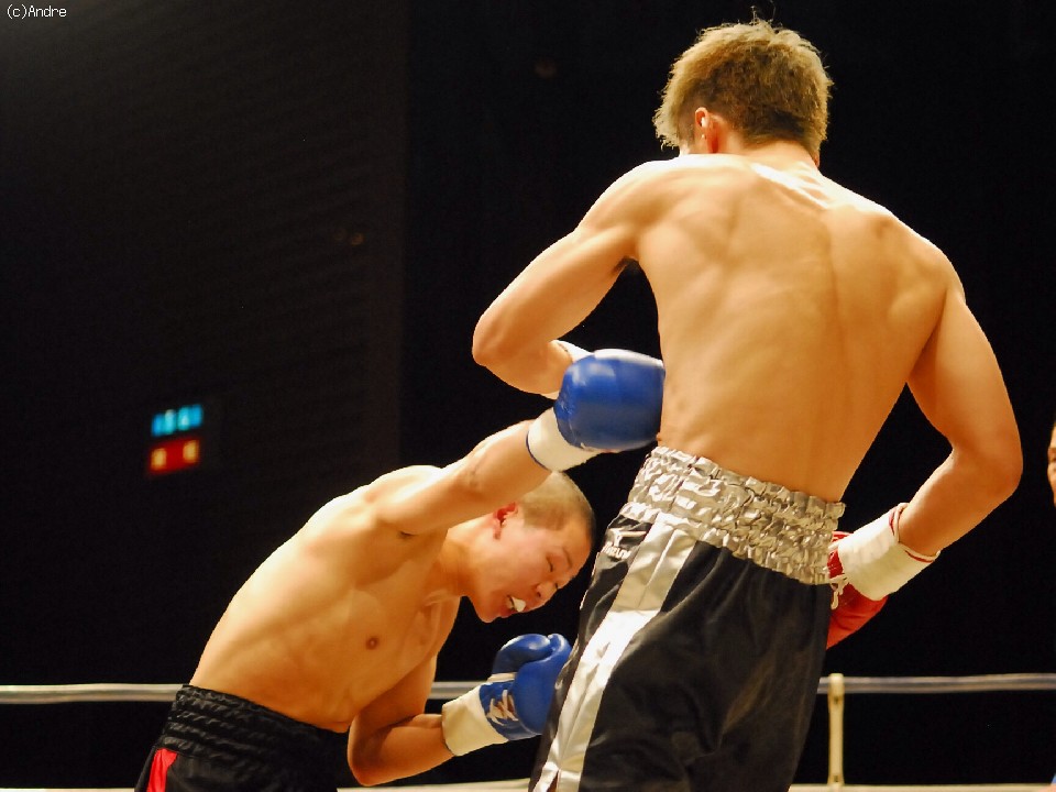 試合:森泉はガードを固めプレスをかけると左右のフックを狙う。対してサウスポーの河村は脚を使い森泉の打ち終わりにワンツーを的確にあてていく。2R開始早々、河村のワンツーが見事に決まり森泉がダウン。ダメージが深いと見たレフェリーが試合を止めた。