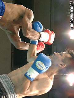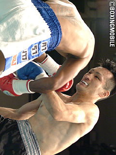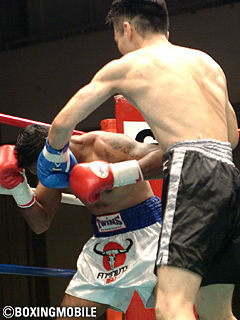 試合:伊藤博文を破り、ランク入りしたサウスポー塩谷。1R、踏み込んで右ストレートを放つサムローンに塩谷はボディ攻め。下がるサムローンにさらにボディで攻め立てるが、2Rに入るといきなりバテ気味の塩谷は攻めが雑に。3R、こちらもバテバテのサムローンにこれ以上続行不可能と見たレフェリーが試合をストップした。