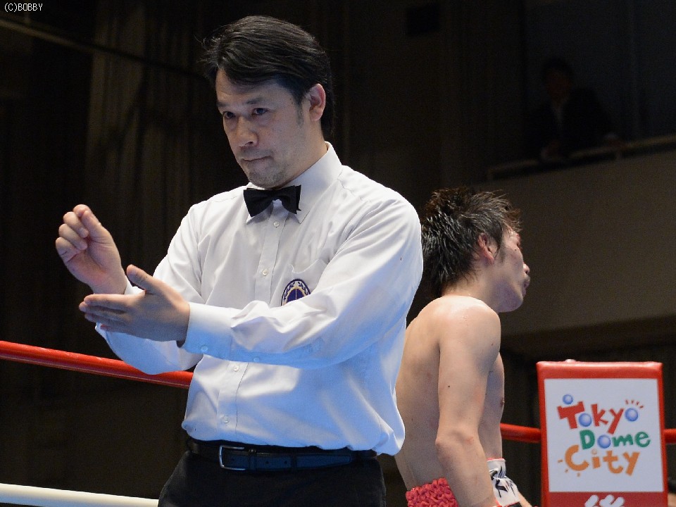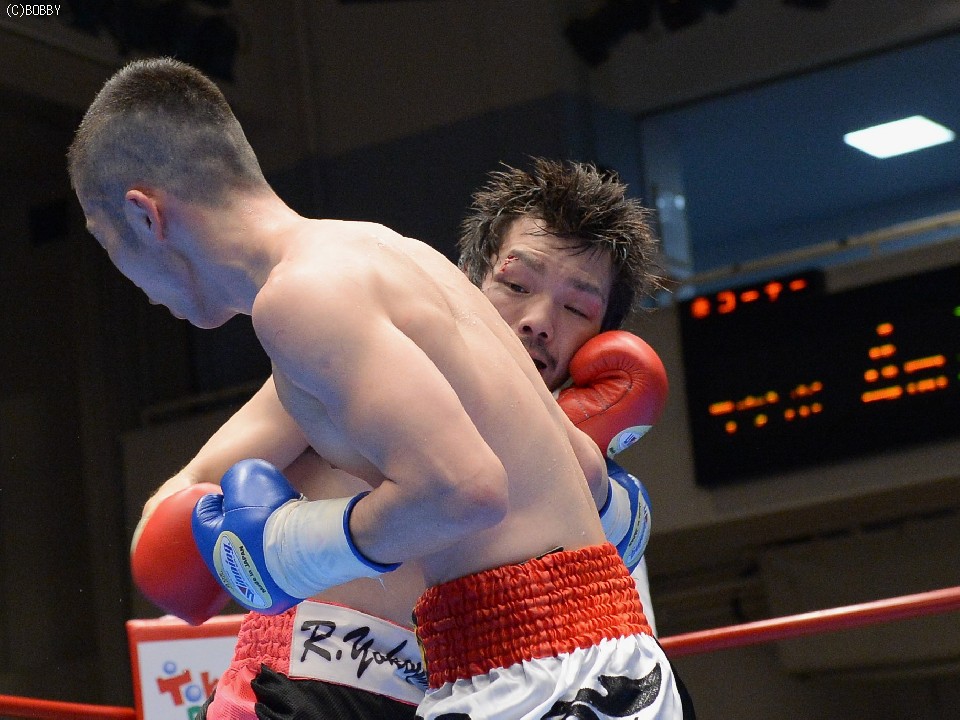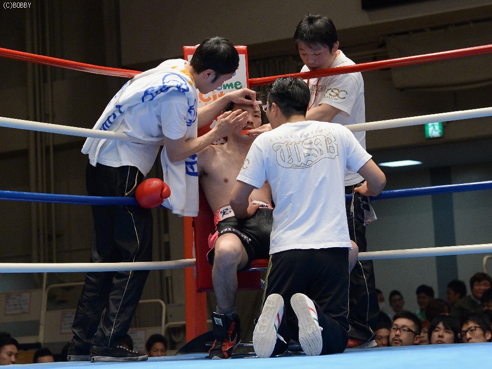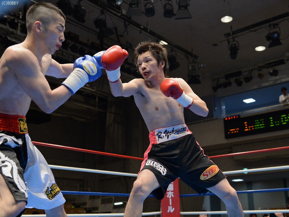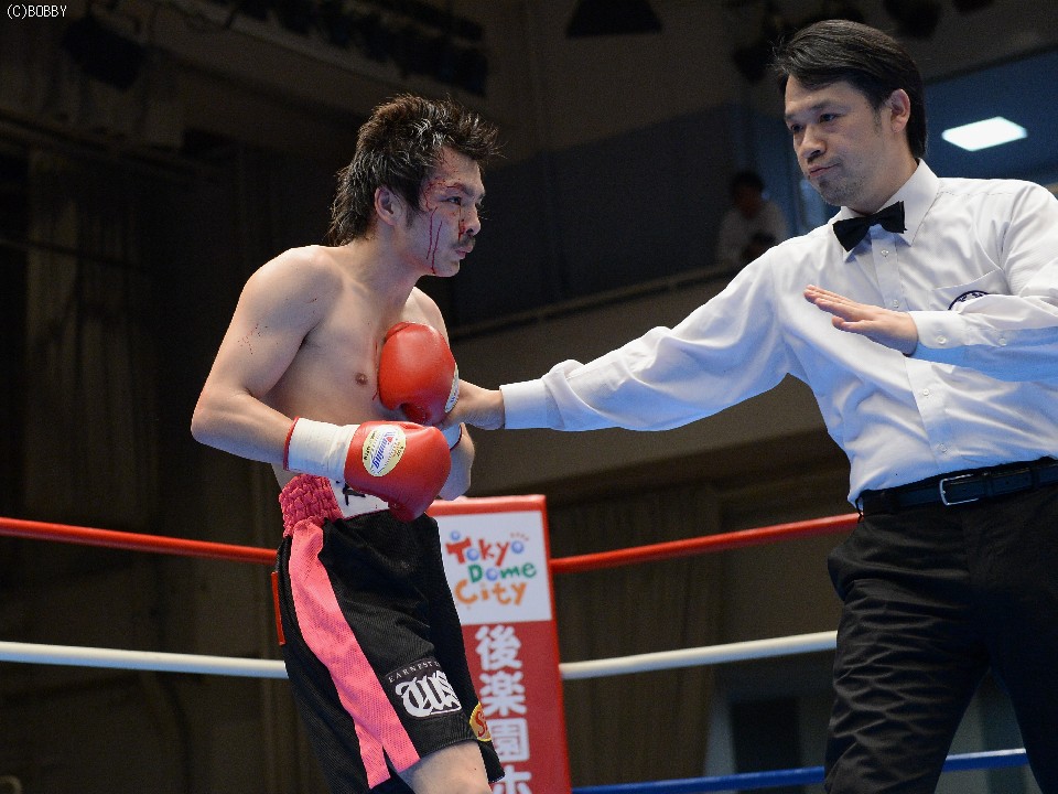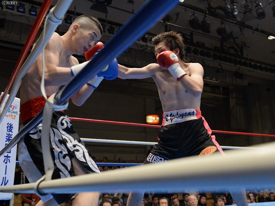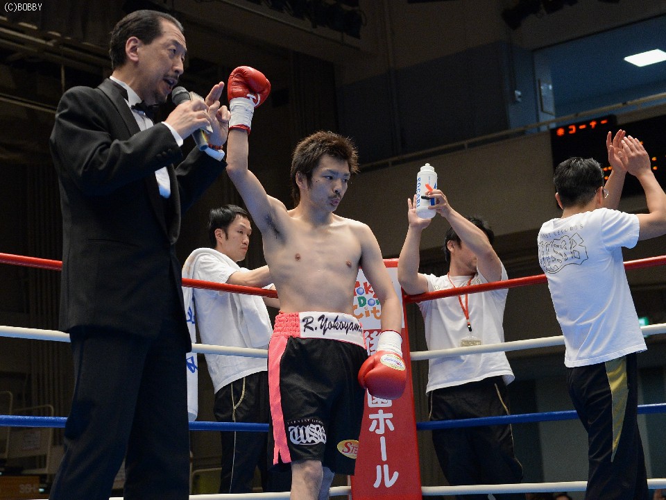 試合:左手を前に突きだし間合いを測る佐藤に対し、サウスポーの横山はリードから左を上下に入れプレス。さらにいきなりの左ストレートで佐藤の顔を跳ね上げる。佐藤も体を振っては左フック、右クロスを被せ、中に入っては負けじとボディを連打。スイッチも繰り返し横山のリズムを崩すと後半、疲労の色が濃くなった横山を詰めてもいたが、4Rに偶バツで負った横山の右目上の傷が酷くなり、6R途中でストップ。佐藤にとっては横山対策も出ていただけに、不完全燃焼に終った。