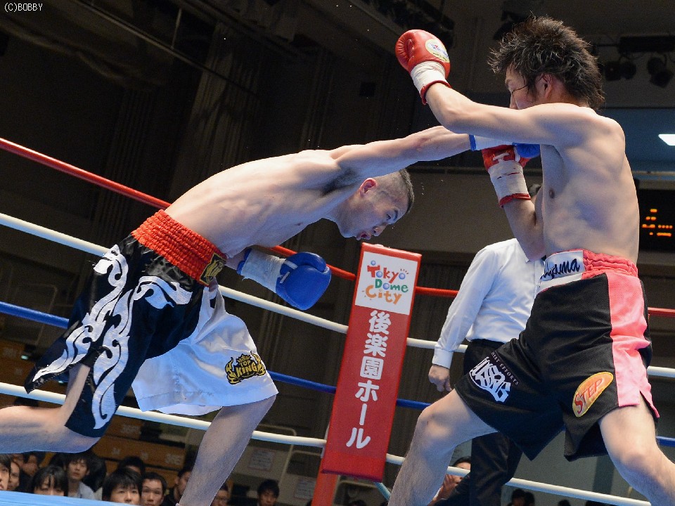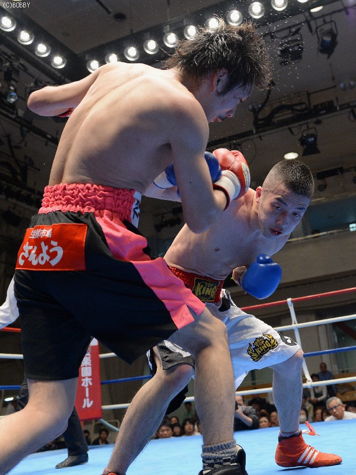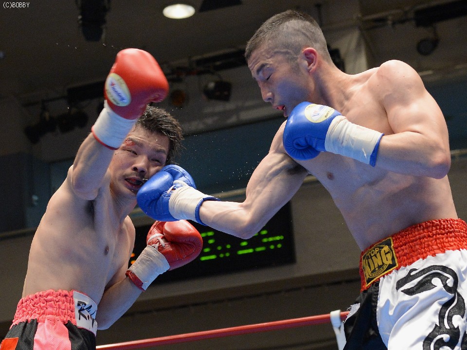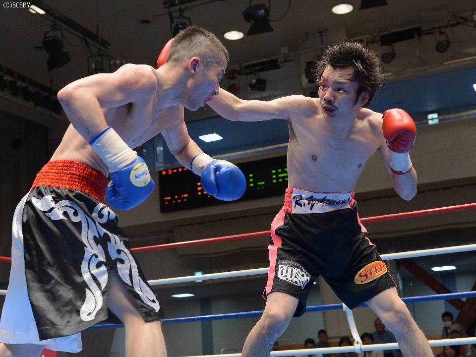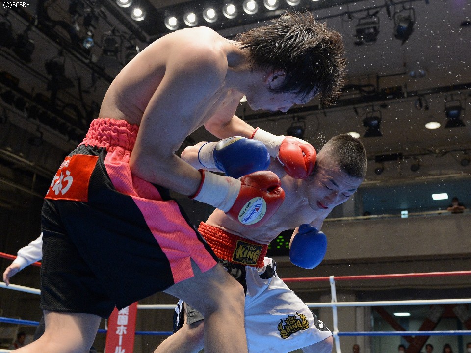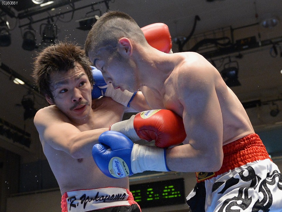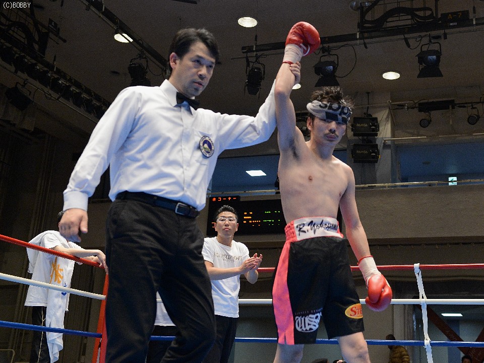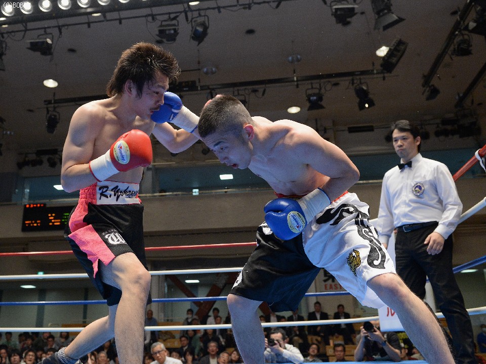 試合:左手を前に突きだし間合いを測る佐藤に対し、サウスポーの横山はリードから左を上下に入れプレス。さらにいきなりの左ストレートで佐藤の顔を跳ね上げる。佐藤も体を振っては左フック、右クロスを被せ、中に入っては負けじとボディを連打。スイッチも繰り返し横山のリズムを崩すと後半、疲労の色が濃くなった横山を詰めてもいたが、4Rに偶バツで負った横山の右目上の傷が酷くなり、6R途中でストップ。佐藤にとっては横山対策も出ていただけに、不完全燃焼に終った。