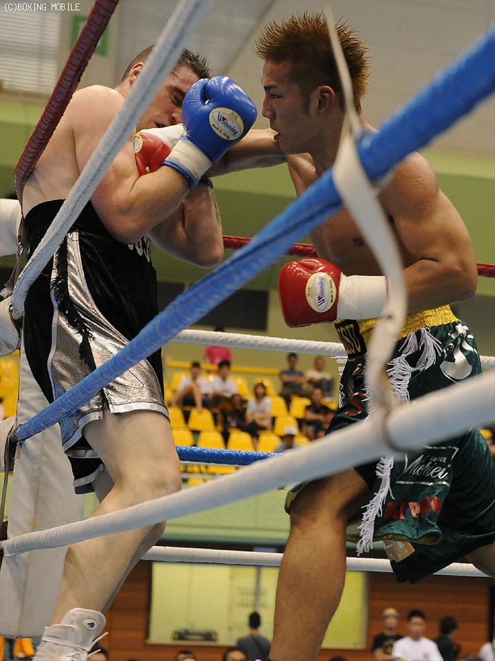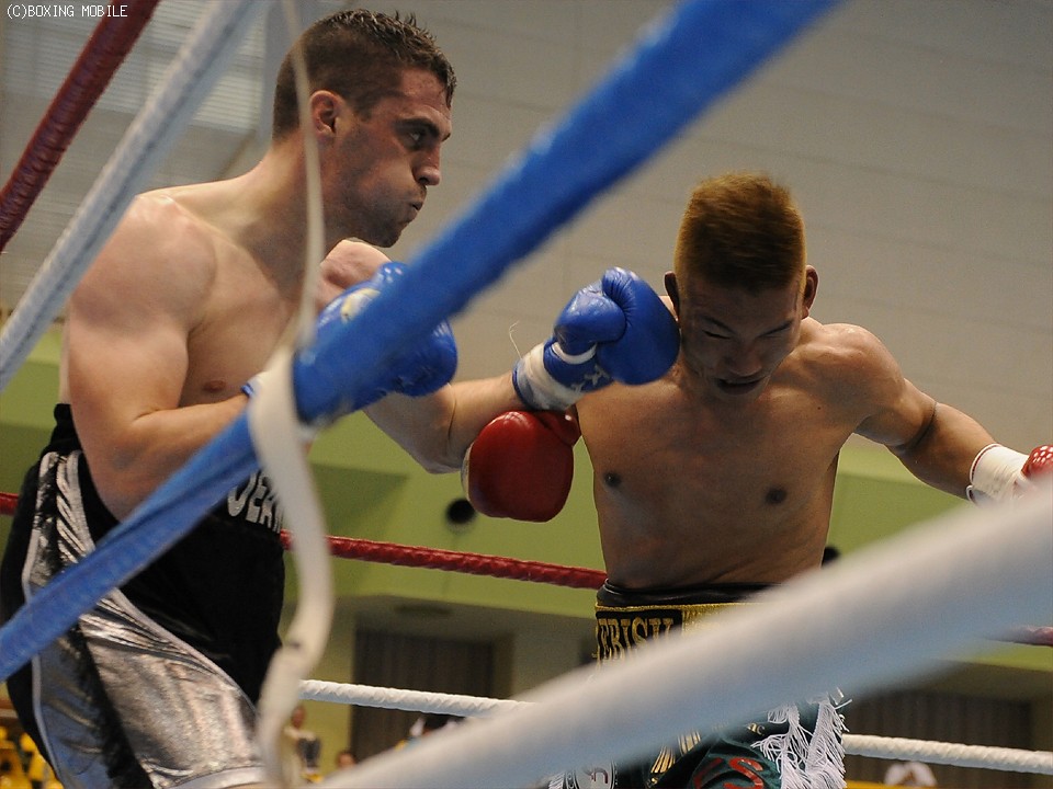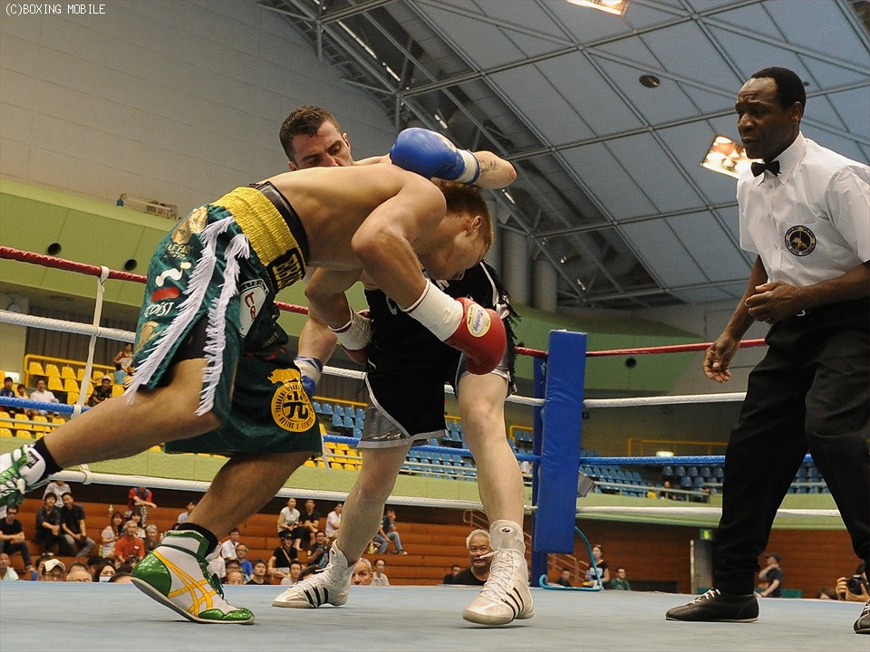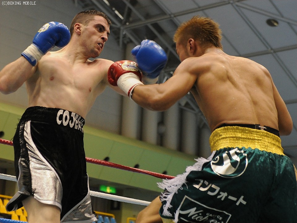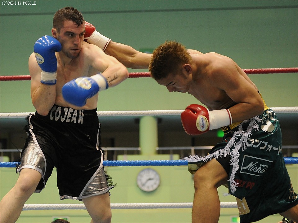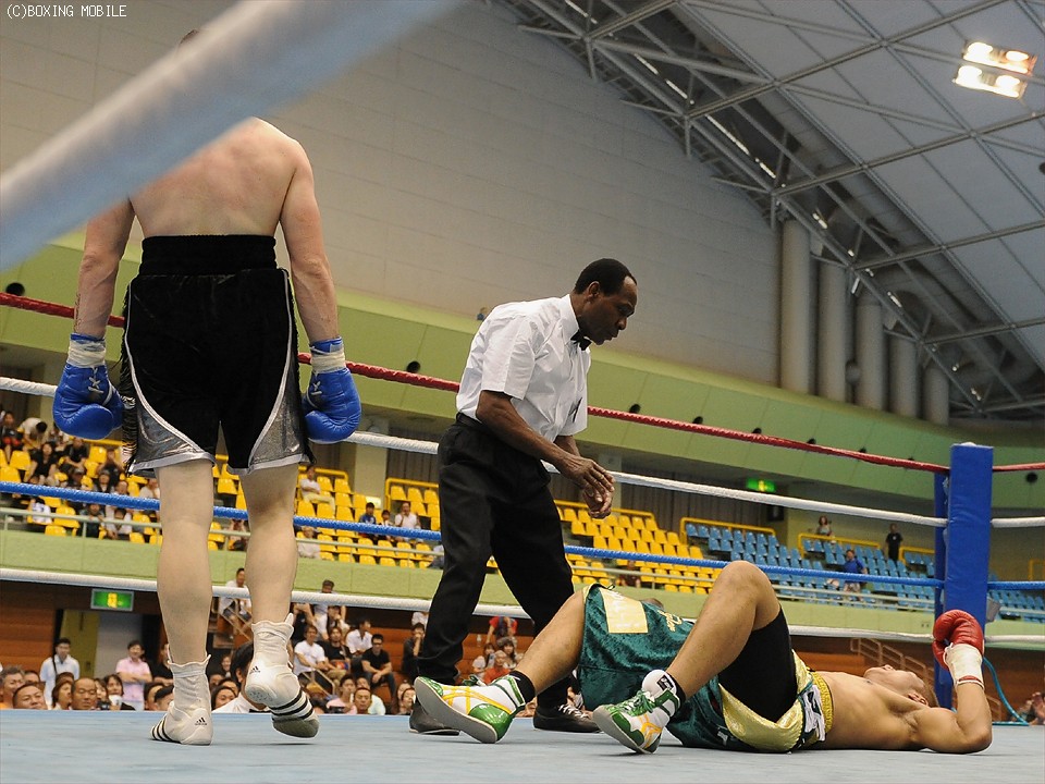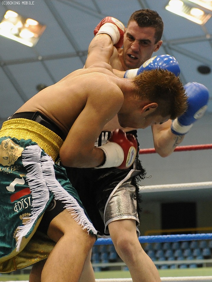 試合:スピード、パワーとも目を見張るモノがあるコジャンだが、胡はそれを上回る立ち上がりで、初回に左でダウンを先制。しかし、足を入れ換えたコジャンの左の返しを浴びると膝が折れ、終了間際に再び左で倒されてしまう。完全に足にきた胡だが、なんとか立ち上がりラウンドを凌ぐ。2R、自分から仕掛けた胡は、一旦は連打で追い込むが足に力が入らず、コジャンの速いパンチを返され最後は左フックがテンプルにヒット。これが決まり、胡はこの試合2度目のダウン。立ち上がり戦意は見せたが、ダメージを重く見たレフェリーに止められた。