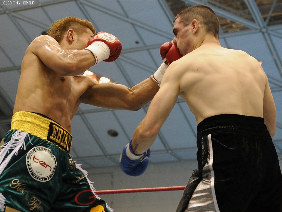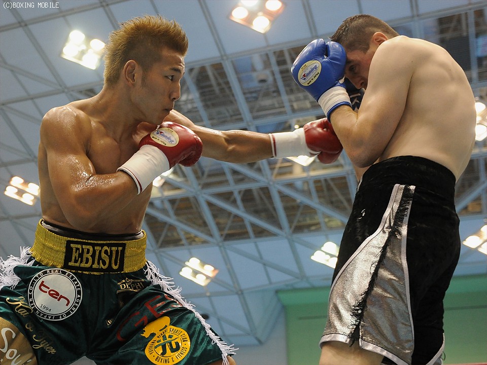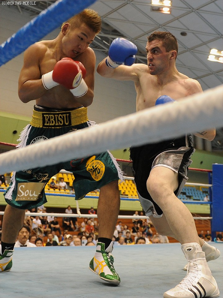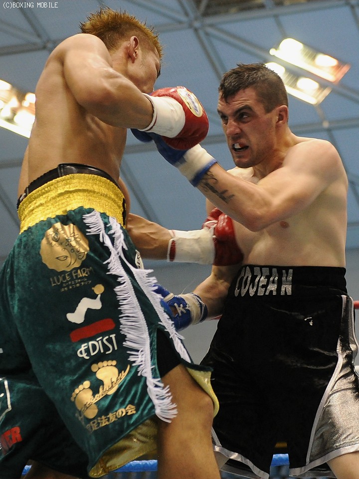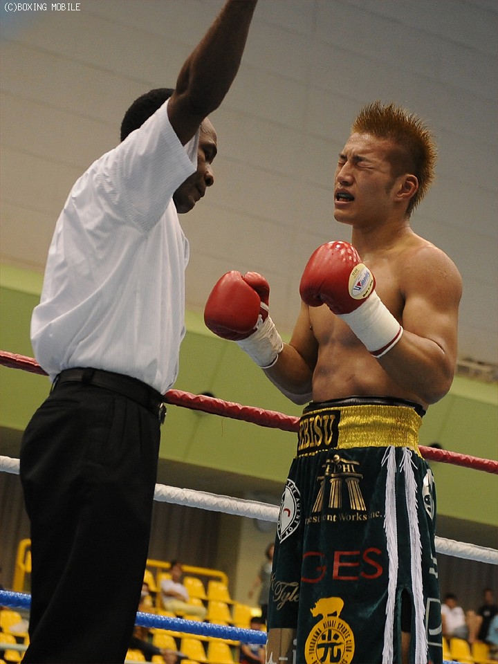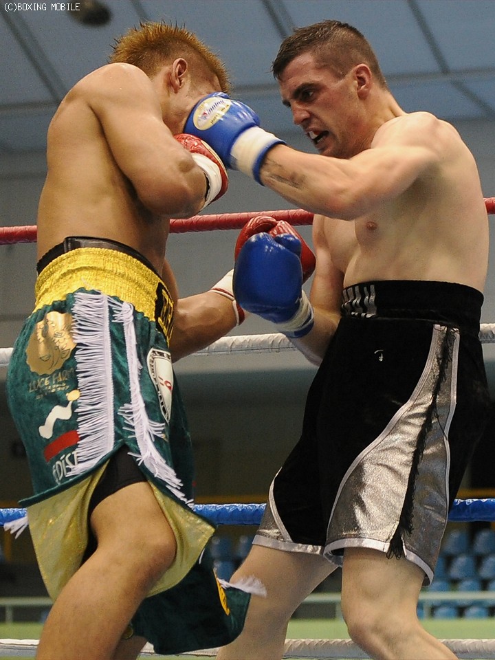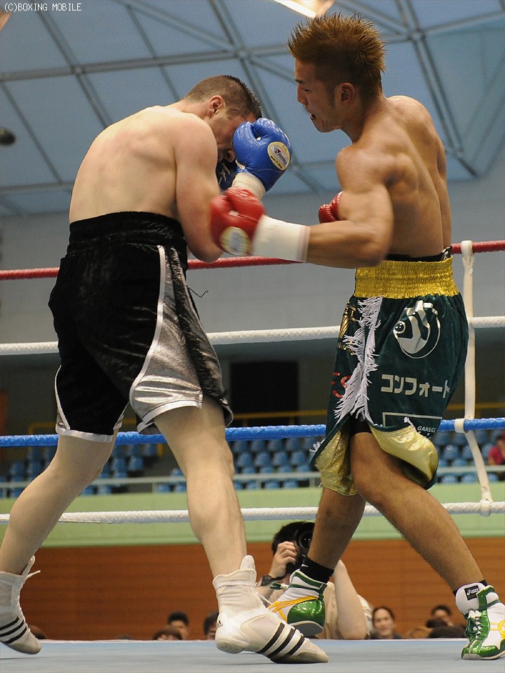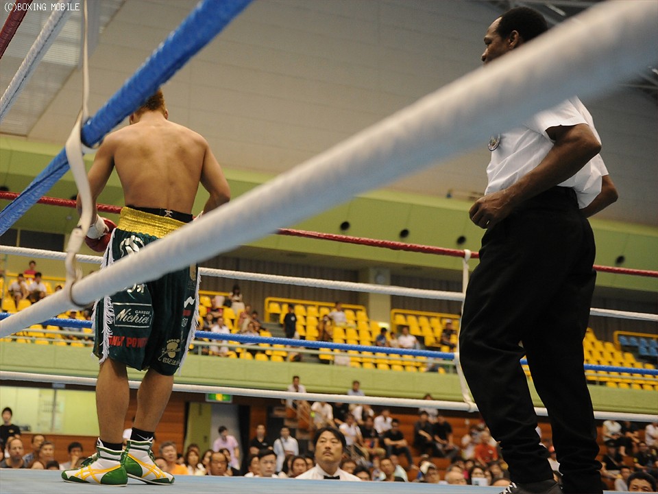 試合:スピード、パワーとも目を見張るモノがあるコジャンだが、胡はそれを上回る立ち上がりで、初回に左でダウンを先制。しかし、足を入れ換えたコジャンの左の返しを浴びると膝が折れ、終了間際に再び左で倒されてしまう。完全に足にきた胡だが、なんとか立ち上がりラウンドを凌ぐ。2R、自分から仕掛けた胡は、一旦は連打で追い込むが足に力が入らず、コジャンの速いパンチを返され最後は左フックがテンプルにヒット。これが決まり、胡はこの試合2度目のダウン。立ち上がり戦意は見せたが、ダメージを重く見たレフェリーに止められた。