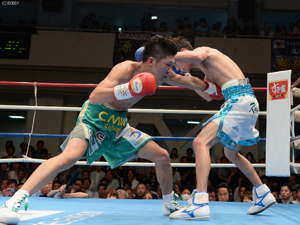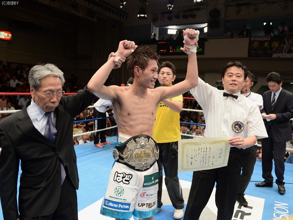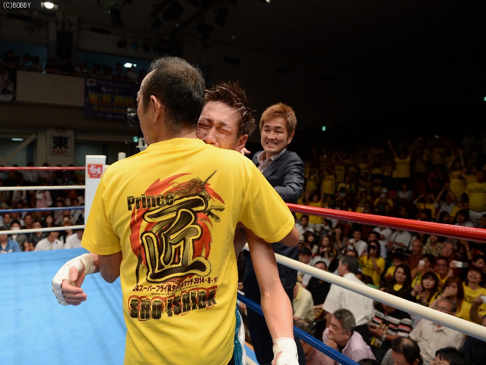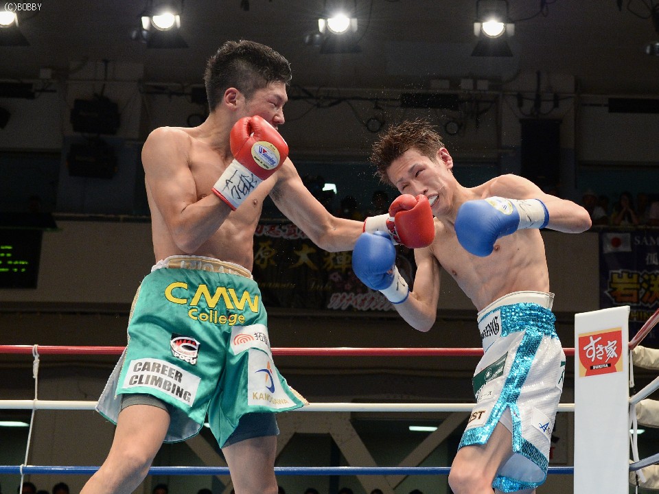 試合:立ち見で溢れた超満員の会場で、ここまで16戦全勝(9KO)の石田を王者の戸部が指名挑戦者に迎えた。初回はともに距離を測りつつ、スピードのあるジャブで牽制しあうと、出だしの固い戸部に石田の右ストレートが伸び、左右ボディにまで返す。2Rも戸部の直線的な足の運びを石田はサイドステップでかわし、早くも右で戸部の左目を赤く腫らす。すると3R、タイミングを外した石田の右ストレートがクリーンヒット。致命打にはならなかったが、この一発で戸部が焦りから大振りとなり、序盤のペースを石田が掴む。4R、なかなか先手が取れない戸部はワンツー、ボディストレートでプレスをかけ、ボディのヒットは奪うものの、パンチの回転とスピードで石田に上回れてしまう。5R、戸部は一発を狙ってしまい、体が流れたところにパンチを浴びるが、なおも強引に攻め、この試合で初めて右のカウンターがヒットし流れが傾き始める。5R終了時の途中採点は48-47が2者、残る1者が50-45で3者とも挑戦者を支持。ポイント不利の戸部は、6Rに距離も掴み始め、リードで追い込んでは右を上下に打ち込むが、石田もサイドに動いてはワンツー、フックで対応。石田は消耗を見せるが、形成逆転とまではいかず。9Rも激しく前に出た王者は相討ち覚悟で石田を詰め、手数と気力で上回る。終了間際に戸部が思わず倒れるが、これは足を滑らせてのスリップ。最終10Rも戸部が思いきりよく飛び出し、力業の勝負に出たが、石田も最後まで決定打を許さず、距離を取ってはジャブ、ストレートで突き放す。ラスト30秒には戸部の右を浴びて腰が落ちたが、危なかったのはこれを含めて数回ほど。終始カウンターを合わせた石田がリードを広げ、判定3-0で勝利。全勝のまま日本王座を奪取した。