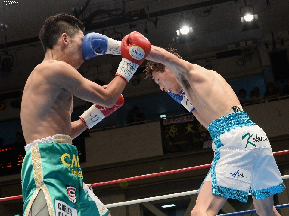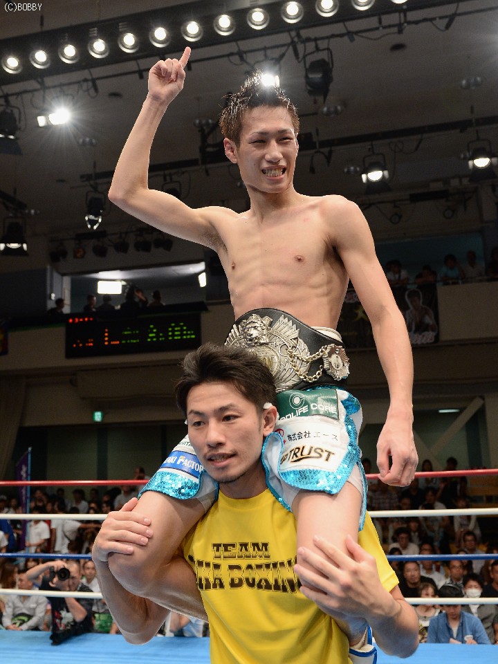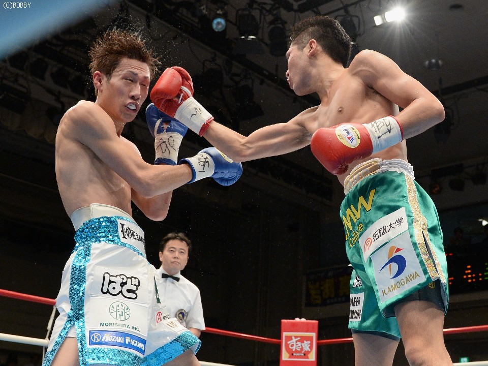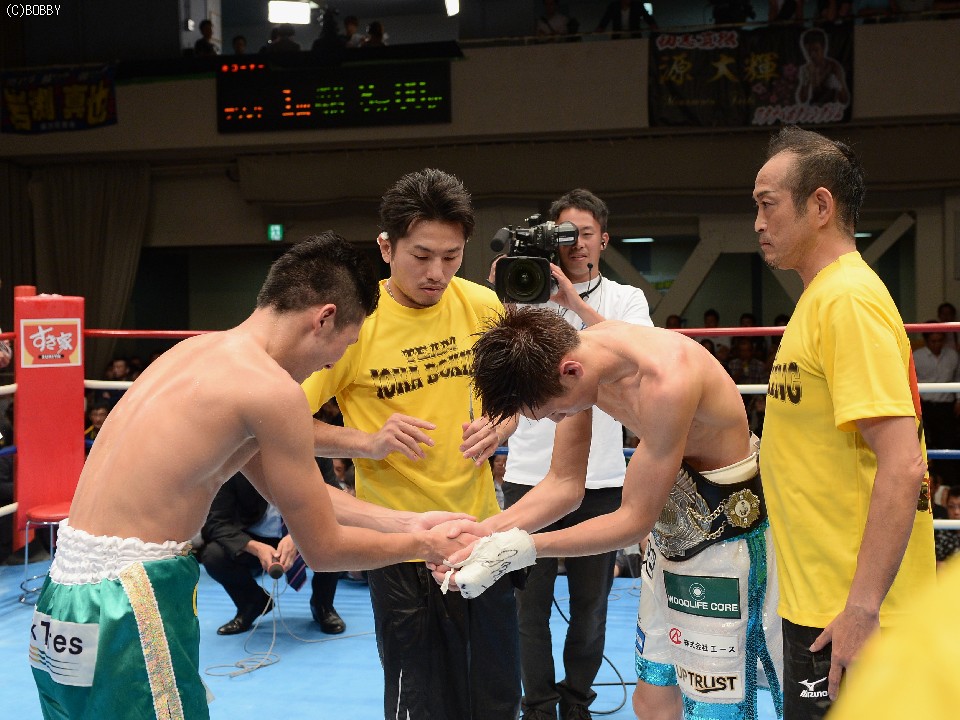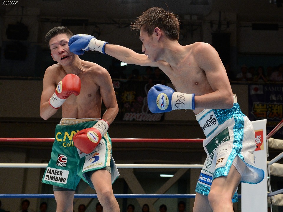 試合:立ち見で溢れた超満員の会場で、ここまで16戦全勝(9KO)の石田を王者の戸部が指名挑戦者に迎えた。初回はともに距離を測りつつ、スピードのあるジャブで牽制しあうと、出だしの固い戸部に石田の右ストレートが伸び、左右ボディにまで返す。2Rも戸部の直線的な足の運びを石田はサイドステップでかわし、早くも右で戸部の左目を赤く腫らす。すると3R、タイミングを外した石田の右ストレートがクリーンヒット。致命打にはならなかったが、この一発で戸部が焦りから大振りとなり、序盤のペースを石田が掴む。4R、なかなか先手が取れない戸部はワンツー、ボディストレートでプレスをかけ、ボディのヒットは奪うものの、パンチの回転とスピードで石田に上回れてしまう。5R、戸部は一発を狙ってしまい、体が流れたところにパンチを浴びるが、なおも強引に攻め、この試合で初めて右のカウンターがヒットし流れが傾き始める。5R終了時の途中採点は48-47が2者、残る1者が50-45で3者とも挑戦者を支持。ポイント不利の戸部は、6Rに距離も掴み始め、リードで追い込んでは右を上下に打ち込むが、石田もサイドに動いてはワンツー、フックで対応。石田は消耗を見せるが、形成逆転とまではいかず。9Rも激しく前に出た王者は相討ち覚悟で石田を詰め、手数と気力で上回る。終了間際に戸部が思わず倒れるが、これは足を滑らせてのスリップ。最終10Rも戸部が思いきりよく飛び出し、力業の勝負に出たが、石田も最後まで決定打を許さず、距離を取ってはジャブ、ストレートで突き放す。ラスト30秒には戸部の右を浴びて腰が落ちたが、危なかったのはこれを含めて数回ほど。終始カウンターを合わせた石田がリードを広げ、判定3-0で勝利。全勝のまま日本王座を奪取した。