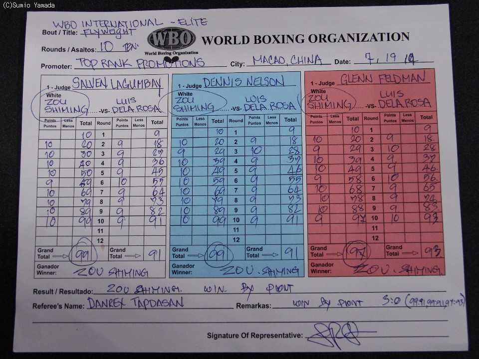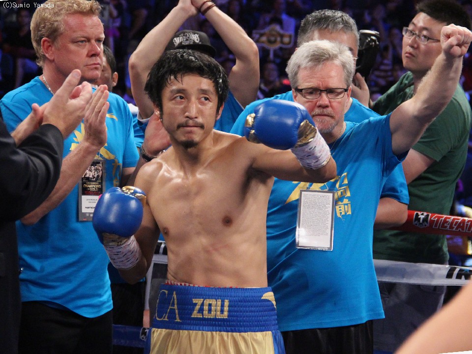 ゾウは3度の世界挑戦経験を持つルイス・デラ・ローサ(コロンビア)に99対91(二者)、97対93の3-0の10回判定勝ちを収め、WBOインターナショナル・フライ級王座を獲得した。昨年4月のプロ転向後の戦績を5戦全勝(1KO)に伸ばしたゾウに対し、ボブ・アラム・プロモーターとフレディ・ローチ・トレーナーは次戦での世界挑戦にゴー・サインを出した。敗れたデラ・ローサは27戦23勝(13KO)4敗1分。