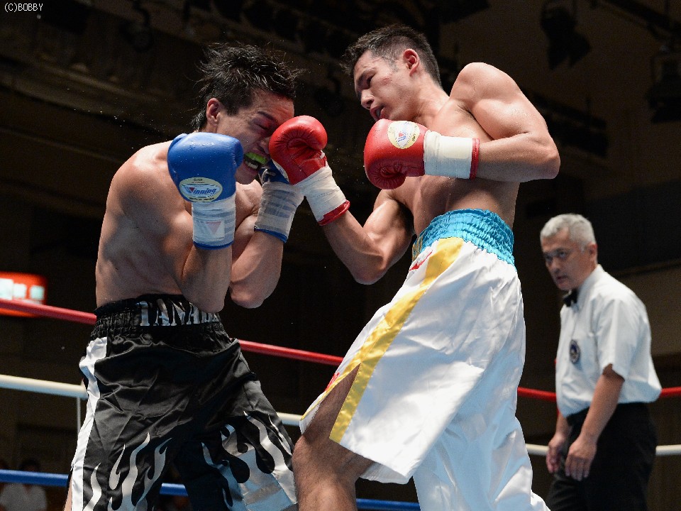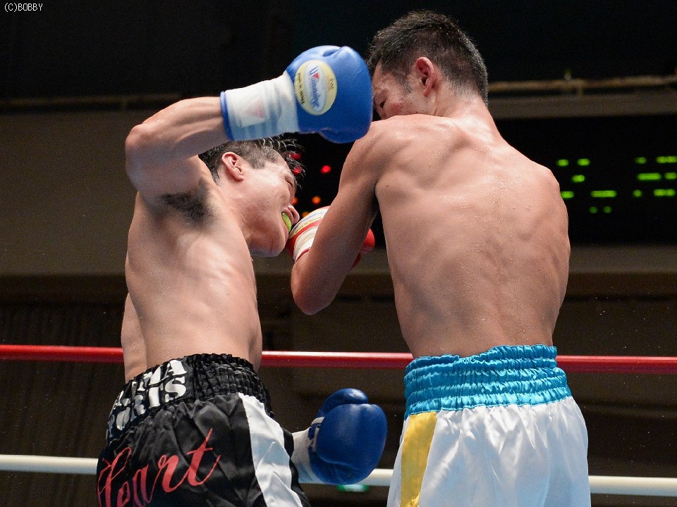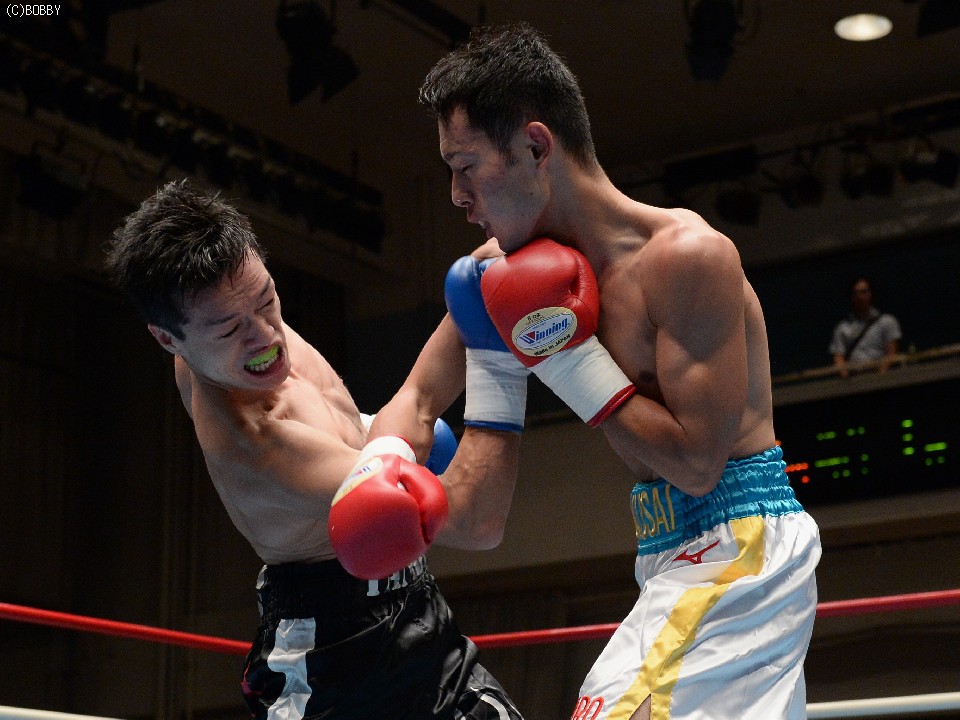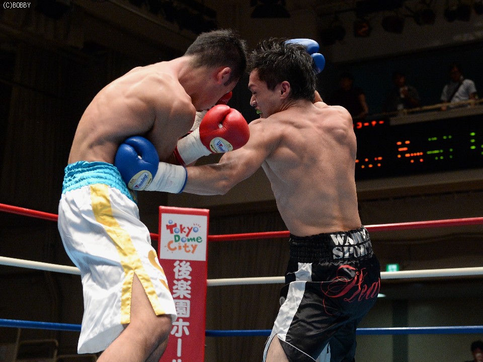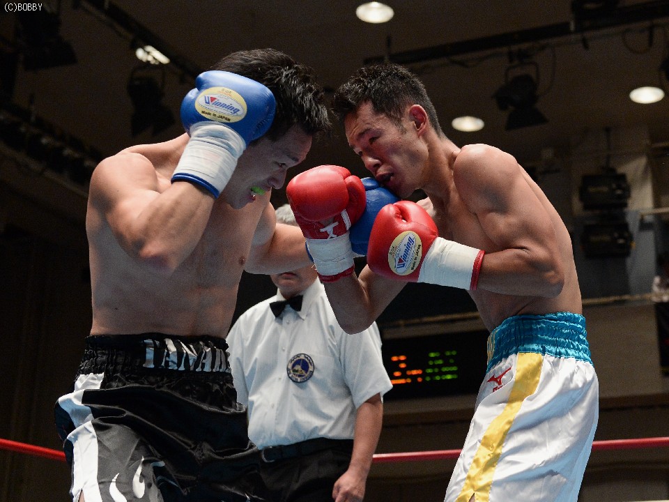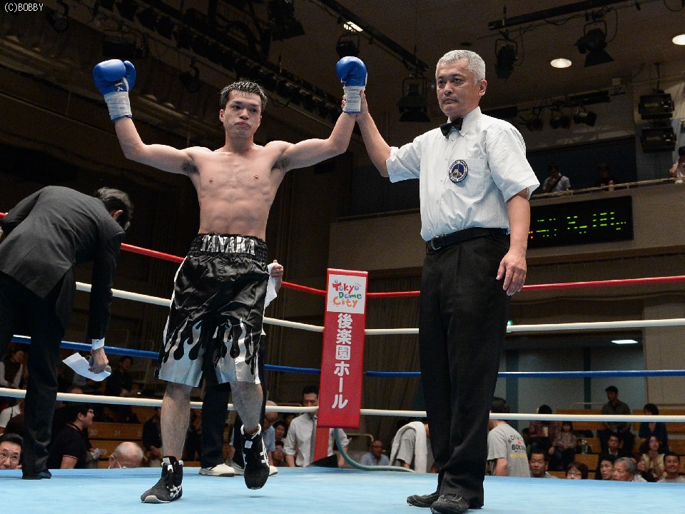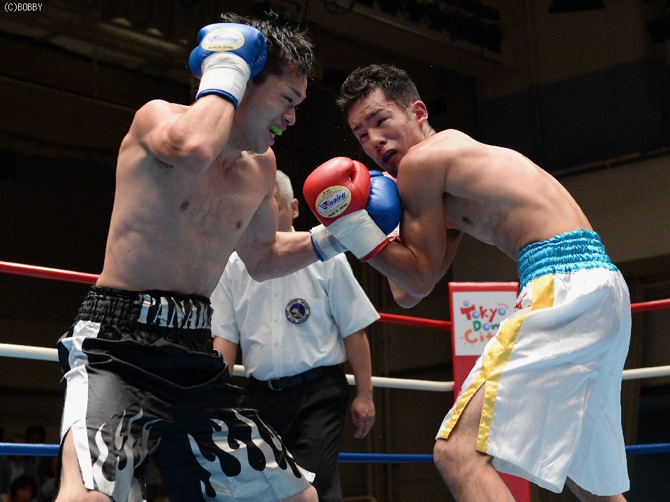 試合:ジャブ、ワンツーで圧力をかける飯田に対し、ガードを固めた田中は低く入っては左フックを上下に効かせる。2Rには飯田もボディを返し、引き離してはワンツー、フックを打ち込むが、田中に合わせてのインファイトが多くなってしまう。固いガードに中々アッパーも入らず、苦戦が続く飯田だが、手数では負けず、終盤には若干失速した田中にフック、アッパー、ボディのコンビネーションが決まる。最終6R、ゴングと同時に再び前に出た田中が左右フックの連打からワンツーを決め、会心のダウンを奪う。飯田もダメージはなく、最後まで手を出し続けた。