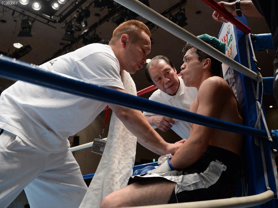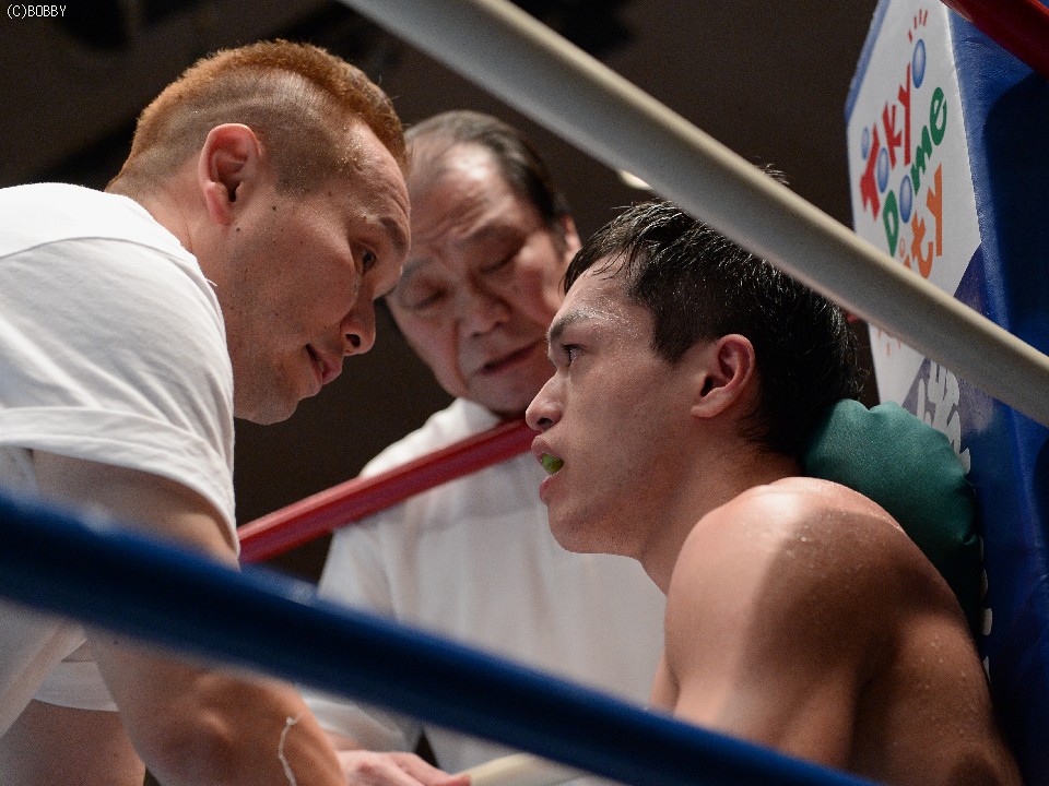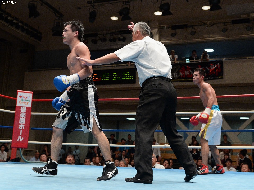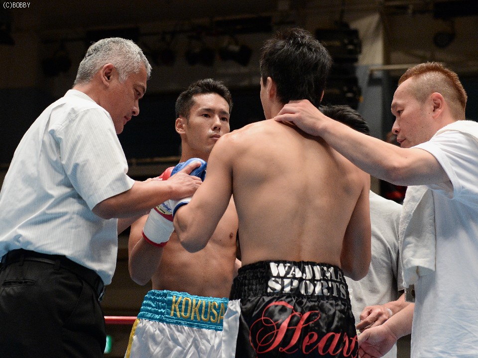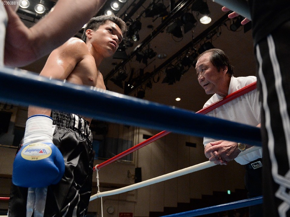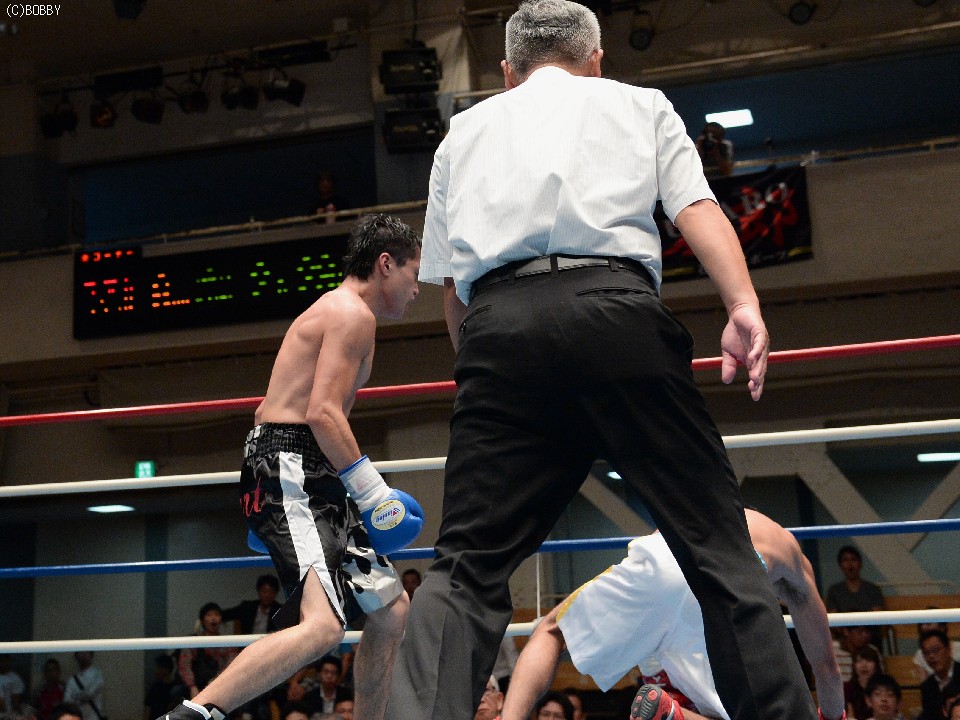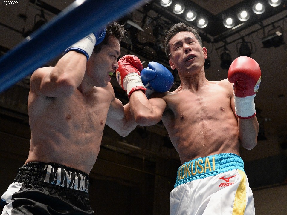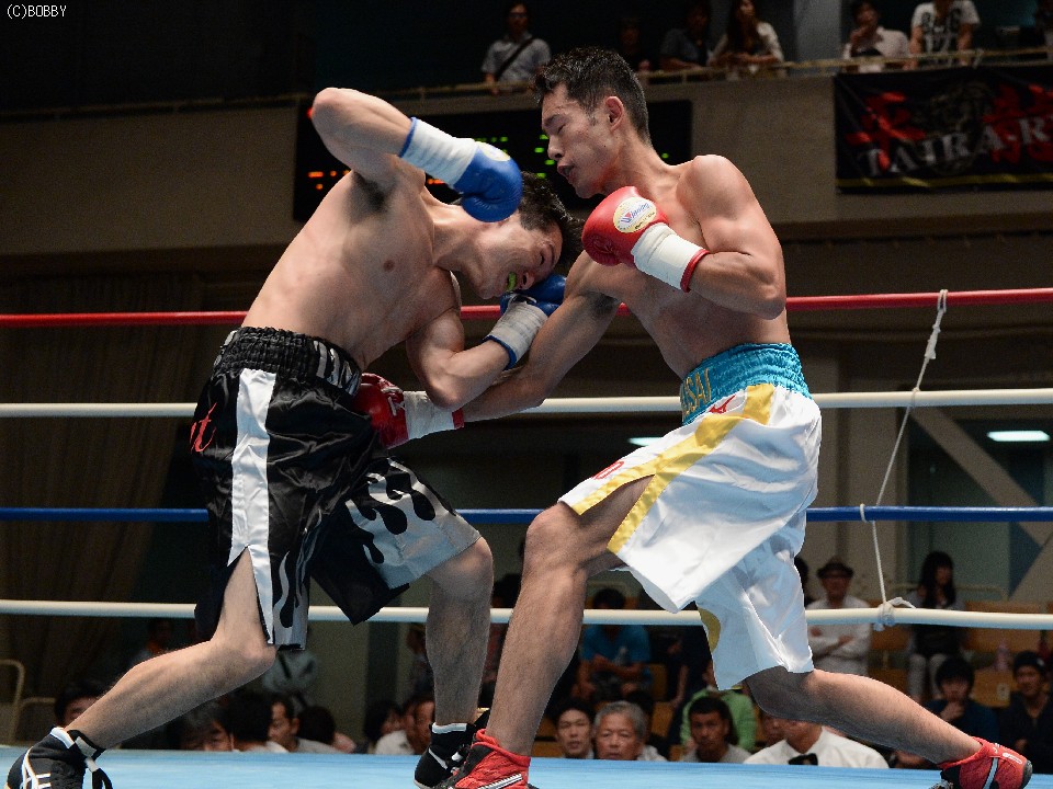 試合:ジャブ、ワンツーで圧力をかける飯田に対し、ガードを固めた田中は低く入っては左フックを上下に効かせる。2Rには飯田もボディを返し、引き離してはワンツー、フックを打ち込むが、田中に合わせてのインファイトが多くなってしまう。固いガードに中々アッパーも入らず、苦戦が続く飯田だが、手数では負けず、終盤には若干失速した田中にフック、アッパー、ボディのコンビネーションが決まる。最終6R、ゴングと同時に再び前に出た田中が左右フックの連打からワンツーを決め、会心のダウンを奪う。飯田もダメージはなく、最後まで手を出し続けた。