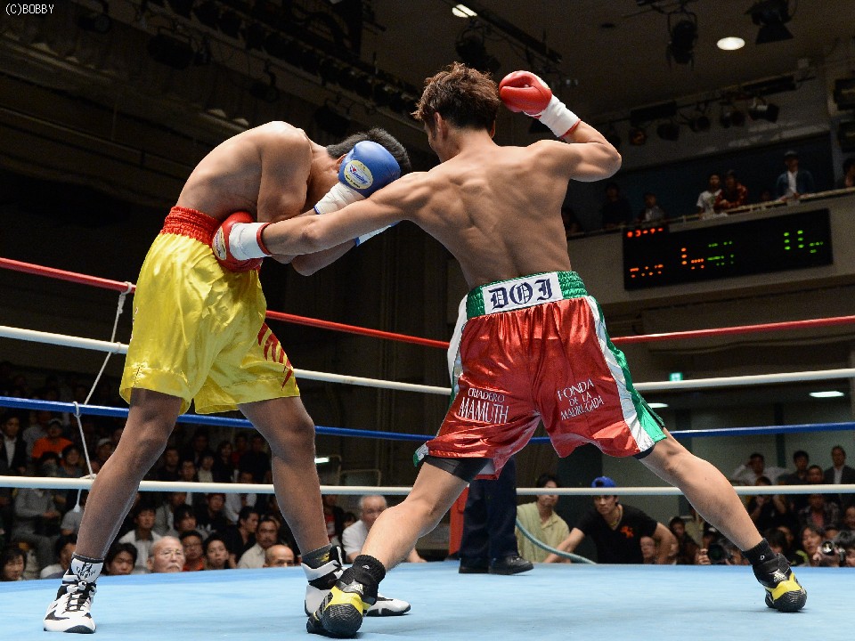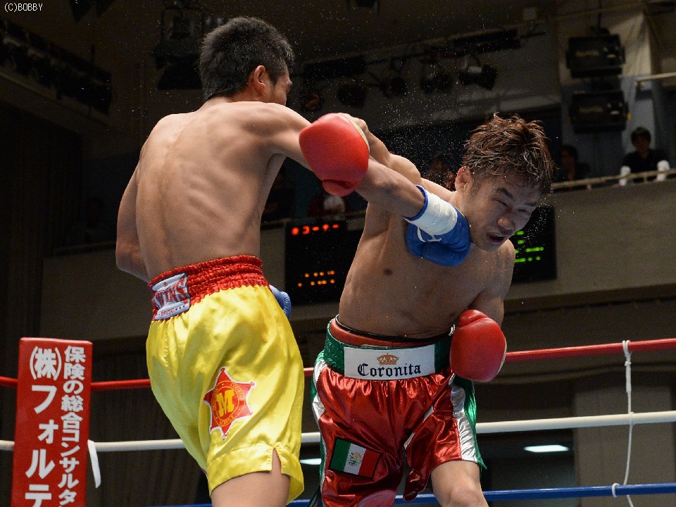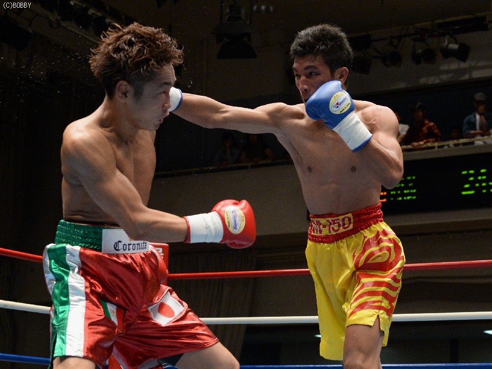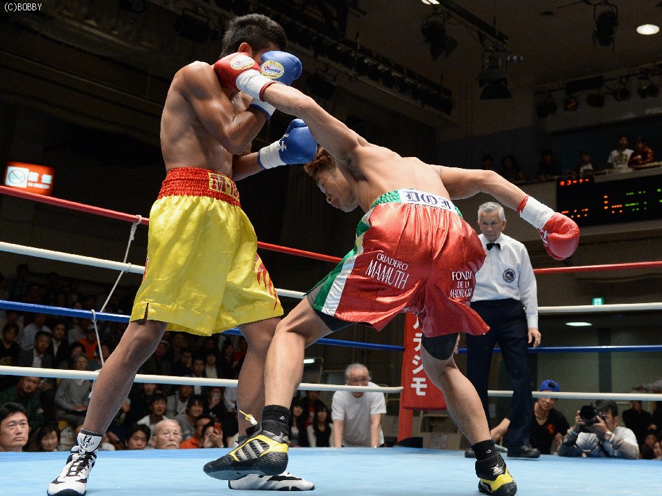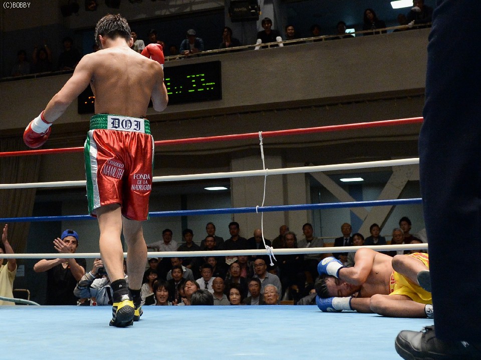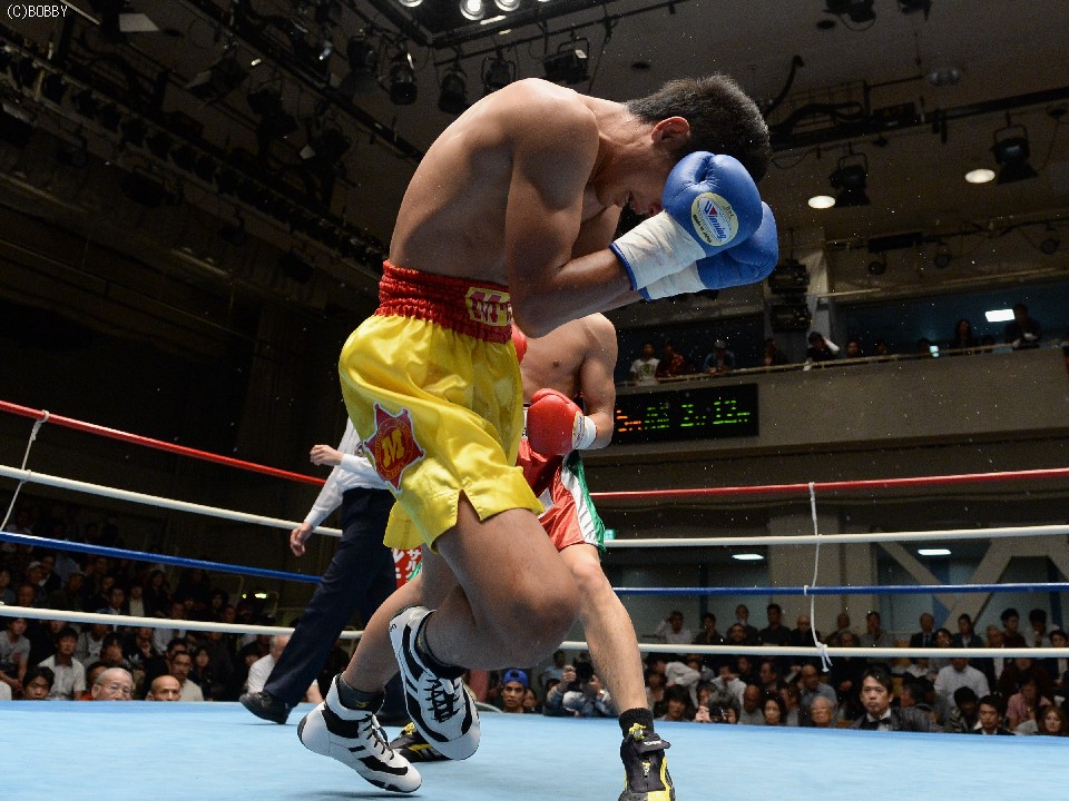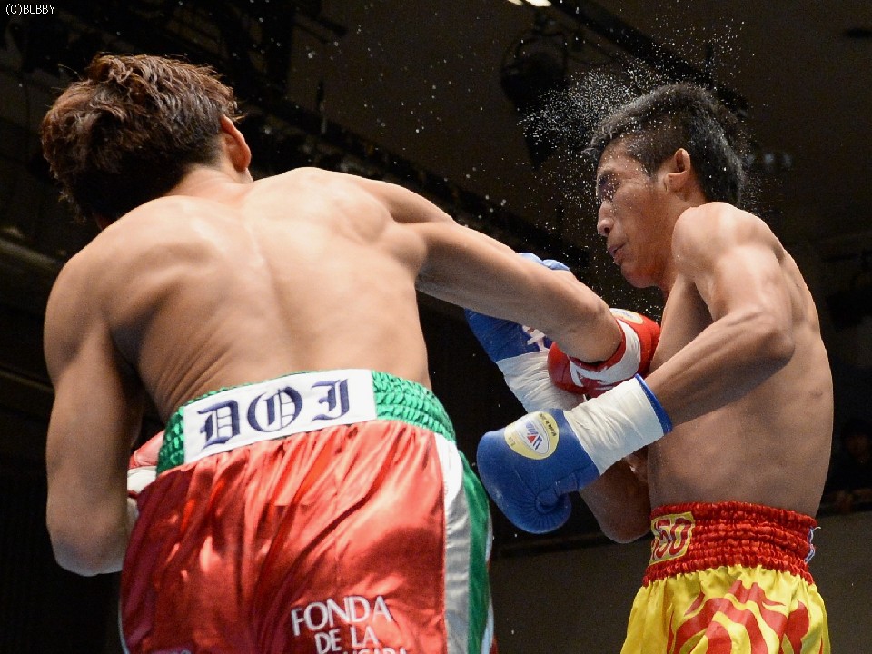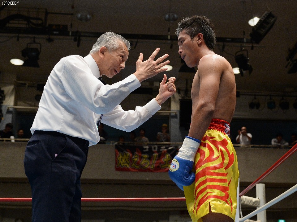 試合:湯場忠志(都城レオS)の57戦に次ぐ現役歴代2位のプロ51戦目を迎えた、元日本Sバンタム級1位の土居は、7勝(2KO)3敗1分のタイ人選手をボディの連打で攻めるが、タイ人も思いの外タイミングの良いパワージャブを返し、1Rはほぼ様子見で終わる。2Rは下にパンチを見せたかと思えば、即座に右のオーバーハンドへと繋げた土居だが、タイ人もジャブから右ストレートを匠にヒット。土居は思わぬ苦戦を強いられる。3Rは出入りを意識してジャブ、右フックで入った土居だが、たまに右が空を切るとタイ人の前進を許し、ワンツー、アッパーを被弾してしまう。相手を見すぎてしまうのか、今一つ調子が出ずに攻めきれない土居だったが、中盤を過ぎると強引に右のビッグパンチを振るい、5Rにまず右でダウンを奪うと、立ち直る隙を与えず最後もテンプルへの右でキャンバスに沈めた。起き上がる気配のないタイ人を見て、レフェリーが試合を止めた。