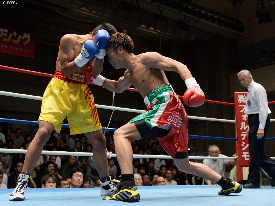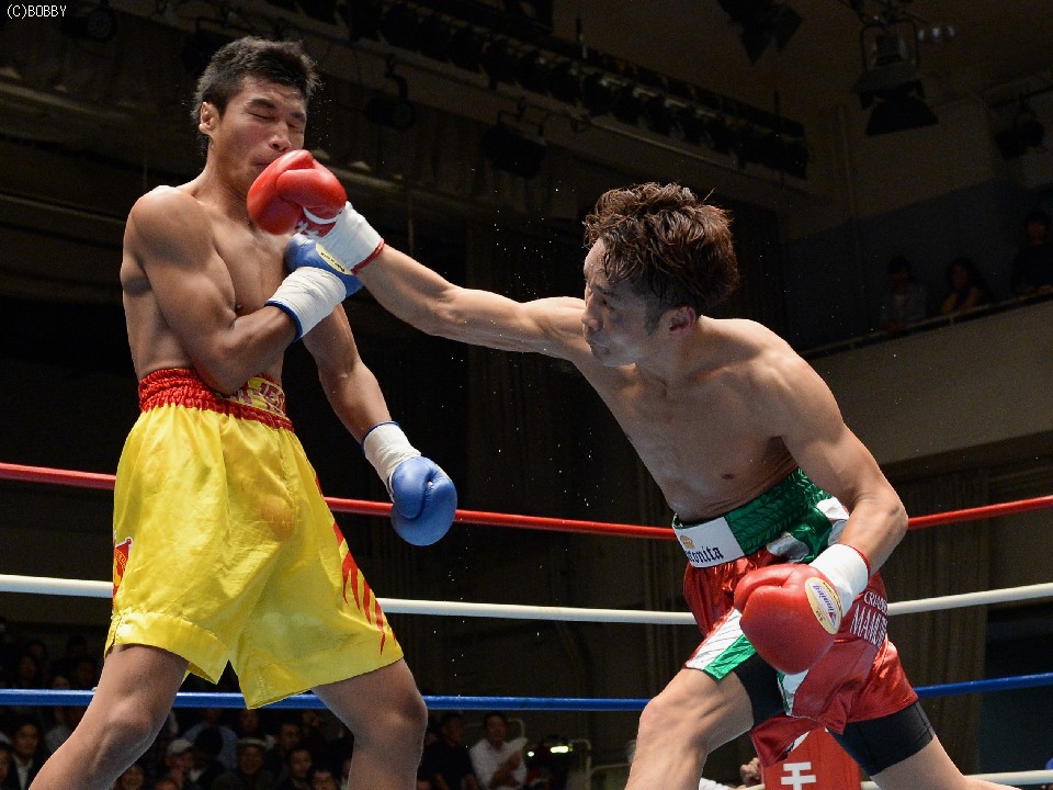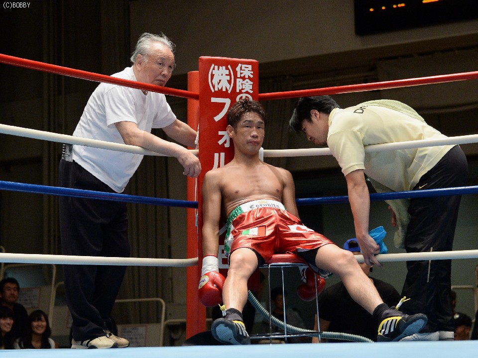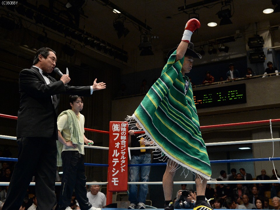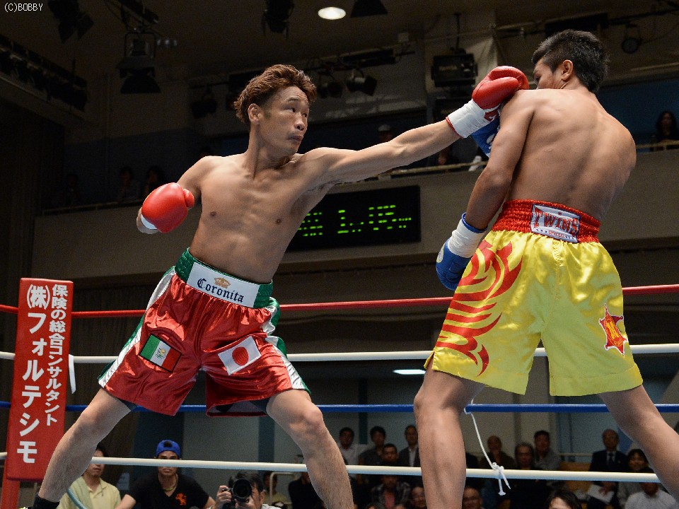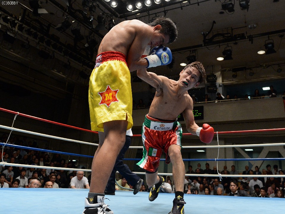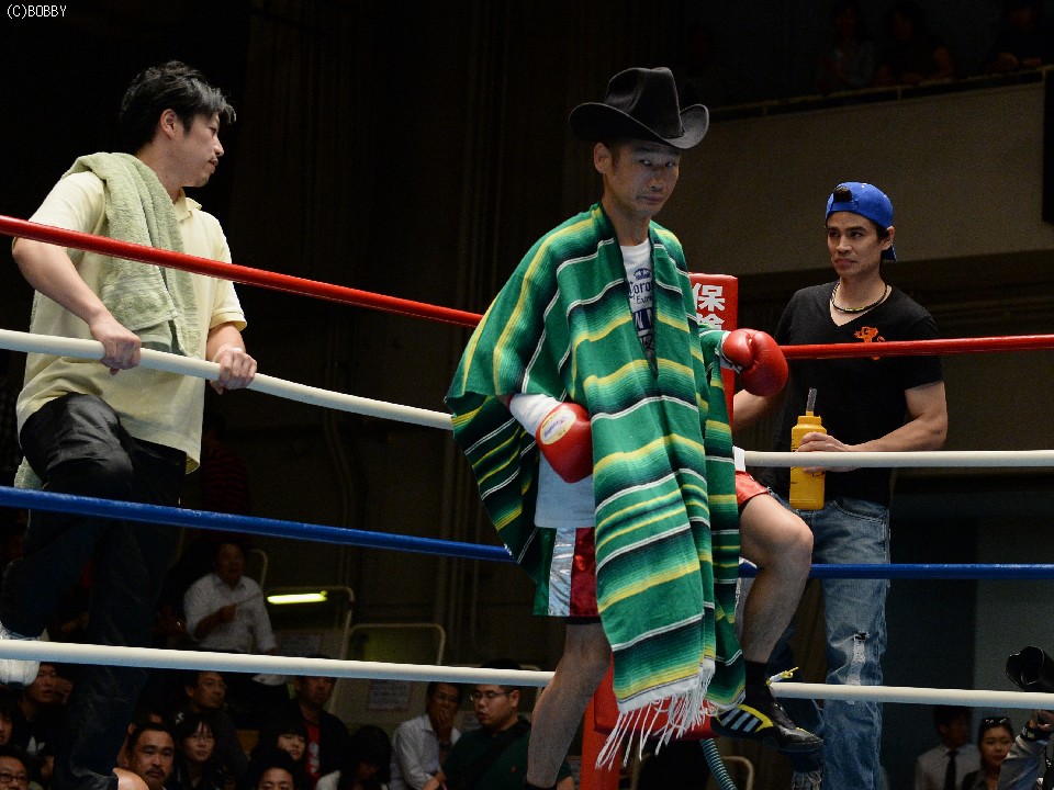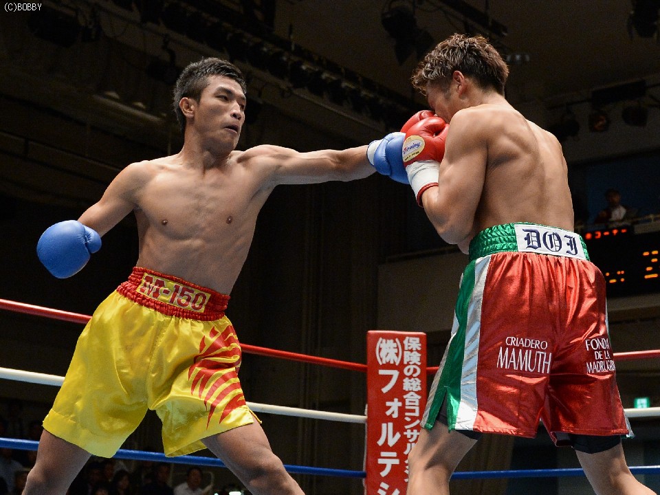 試合:湯場忠志(都城レオS)の57戦に次ぐ現役歴代2位のプロ51戦目を迎えた、元日本Sバンタム級1位の土居は、7勝(2KO)3敗1分のタイ人選手をボディの連打で攻めるが、タイ人も思いの外タイミングの良いパワージャブを返し、1Rはほぼ様子見で終わる。2Rは下にパンチを見せたかと思えば、即座に右のオーバーハンドへと繋げた土居だが、タイ人もジャブから右ストレートを匠にヒット。土居は思わぬ苦戦を強いられる。3Rは出入りを意識してジャブ、右フックで入った土居だが、たまに右が空を切るとタイ人の前進を許し、ワンツー、アッパーを被弾してしまう。相手を見すぎてしまうのか、今一つ調子が出ずに攻めきれない土居だったが、中盤を過ぎると強引に右のビッグパンチを振るい、5Rにまず右でダウンを奪うと、立ち直る隙を与えず最後もテンプルへの右でキャンバスに沈めた。起き上がる気配のないタイ人を見て、レフェリーが試合を止めた。
