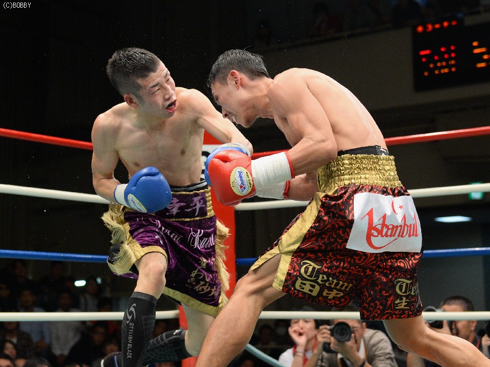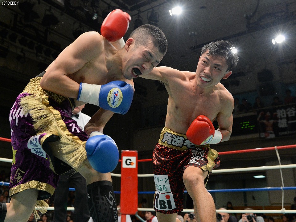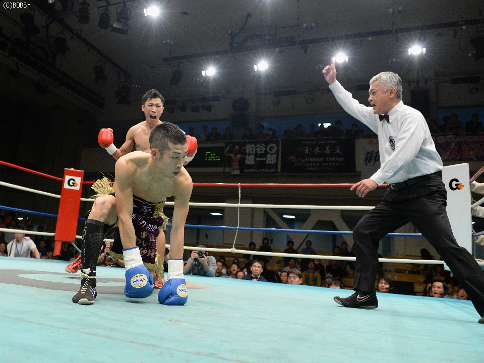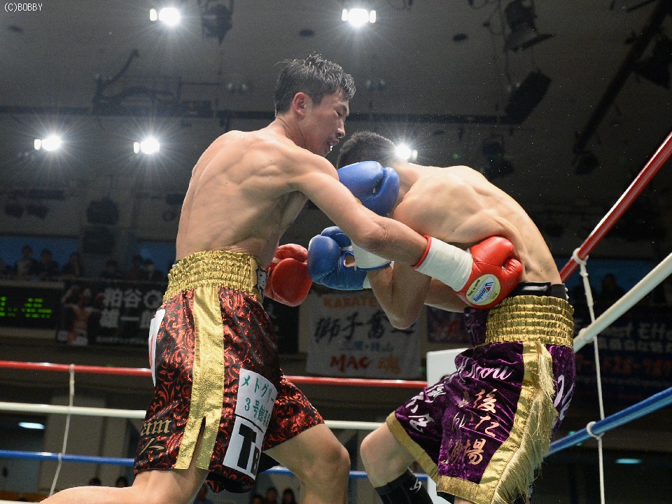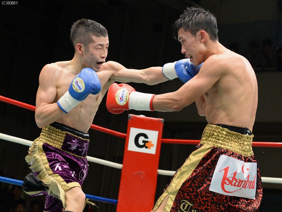 試合:市川の入り際に合わせ、左ストレートを狙うサウスポーの久保。市川に多少のやりにくさはあったが、思いきったワンツーで飛び込むと1R後半に右がヒットし、ダウンを奪う。ここは逃げ切った久保は、2Rにワンツー、アッパーでポイント挽回に出るが、すでに距離を掴んだ市川の固いディフェンスを崩せず。逆に打ち終わりを狙われ、パンチをまとめられてしまう。しかし3R、しつこく左を狙い続けた久保のカウンターが決まり、倒し返してみせる。流れを変えた久保は、4Rも厳しくプレスをかける市川を足でかき回し、左ストレートを次々にヒット。市川は焦りから振りが大きくなってしまい、パンチは空を切るか久保のガードの上。最終5Rも市川は力ずくで主導権を取り返しに出たが、久保はアウトボクシングでポイントアウト。序盤の劣勢を跳ね返し、5戦全勝の市川から判定勝ちを収めた。久保「良い結果が出て良かった。全日本新人王になって、兄を追い越したい」。
