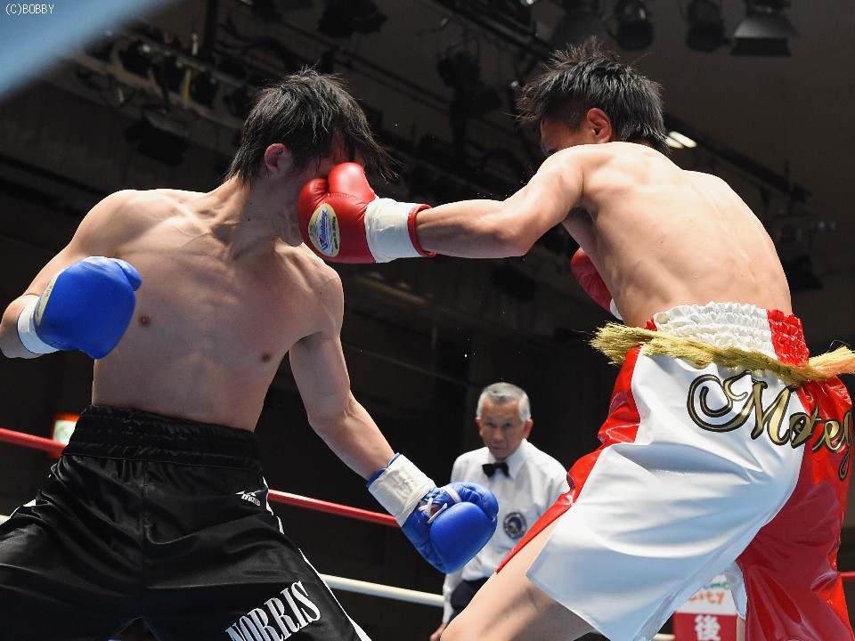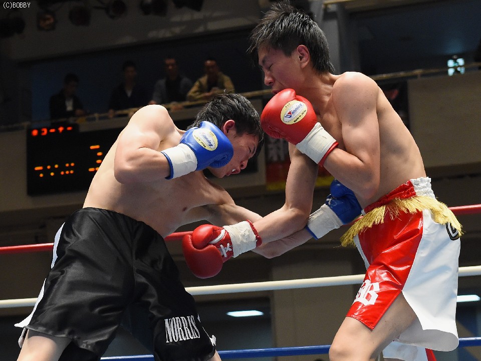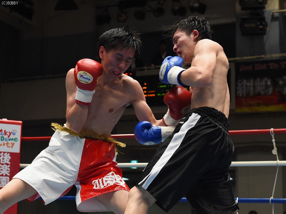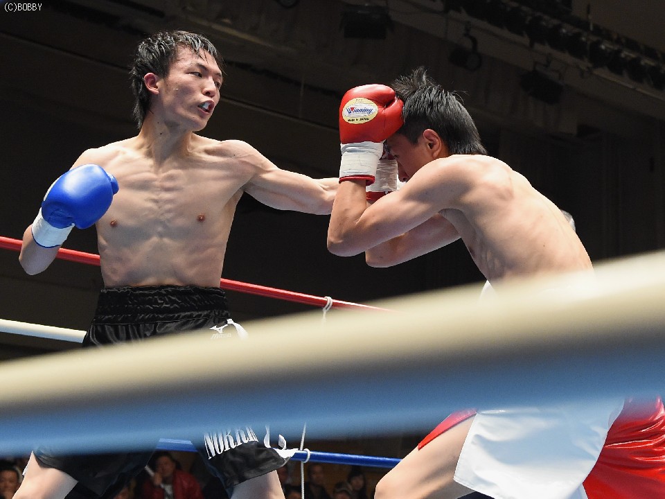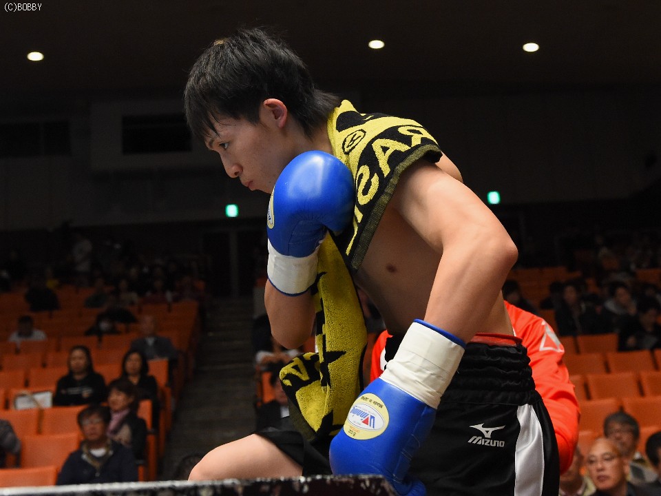試合:3月の新人王予選で、今年の東日本を獲った山下賢哉(古口)に初回TKOで敗れた矢野。7月の試合が相手の棄権により流れ、7ヶ月ぶりのリングとなった。矢野は初回、身長で上回る茂木に対し、スピードを活かした出入りでリードを上下にヒット。さらに、詰める茂木の打ち終わりを狙い、ストレート、左フックで序盤のリズムを掴むが、茂木も徐々に回転数を上げ、ワンツーで反撃。2Rには左右ボディを効かせ、矢野の足を封じる。しかしこの回終盤、詰められた矢野の右ストレートが決まり、茂木が膝を落とす。3Rは再びワンツー、ボディで追い込まれた矢野だが、位置を変えてはアッパー、ストレートを効かせ、決して茂木に主導権を渡さず。勝負の最終4Rも矢野はガードを固め、距離を作ってはジャブ、右ストレートで茂木の圧力に対抗。接近戦でも互角の手数を出したが、判定は2者がドロー裁定となり決着がつかず。