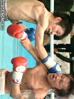 試合:初回から島崎がガード上げて前進。ワンツーからの連打で優位に展開。2Rにはホールドで濱中減点1。その後も島崎が果敢に攻め続け、濱中は鼻血を出し顔面が腫れ上がる。4R、やはり島崎が攻めている中、偶然のバッティングで濱中の右目が塞がりドクターチェック後、試合終了。結果はほぼワンサイドの3-0で島崎。これで新人王獲得を含め7連勝。