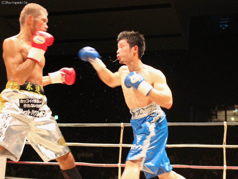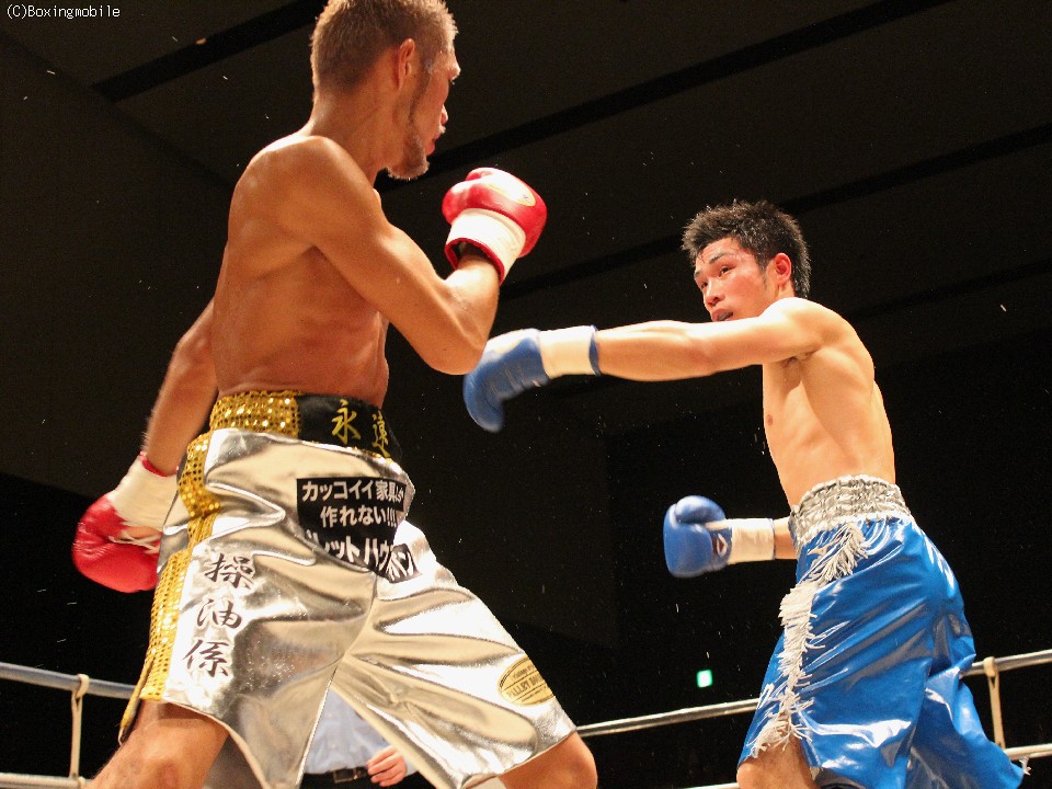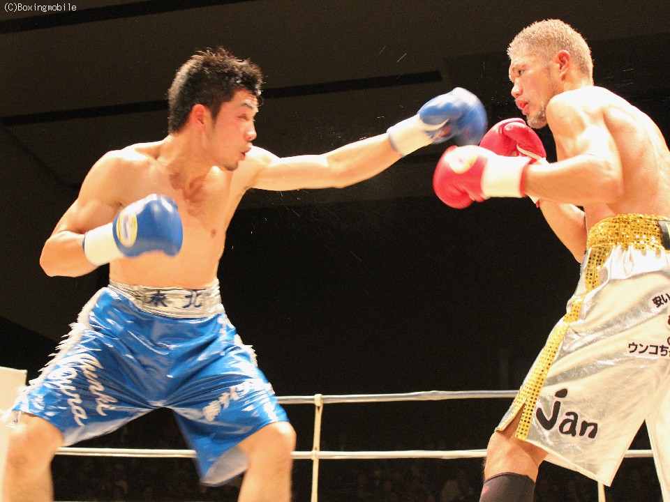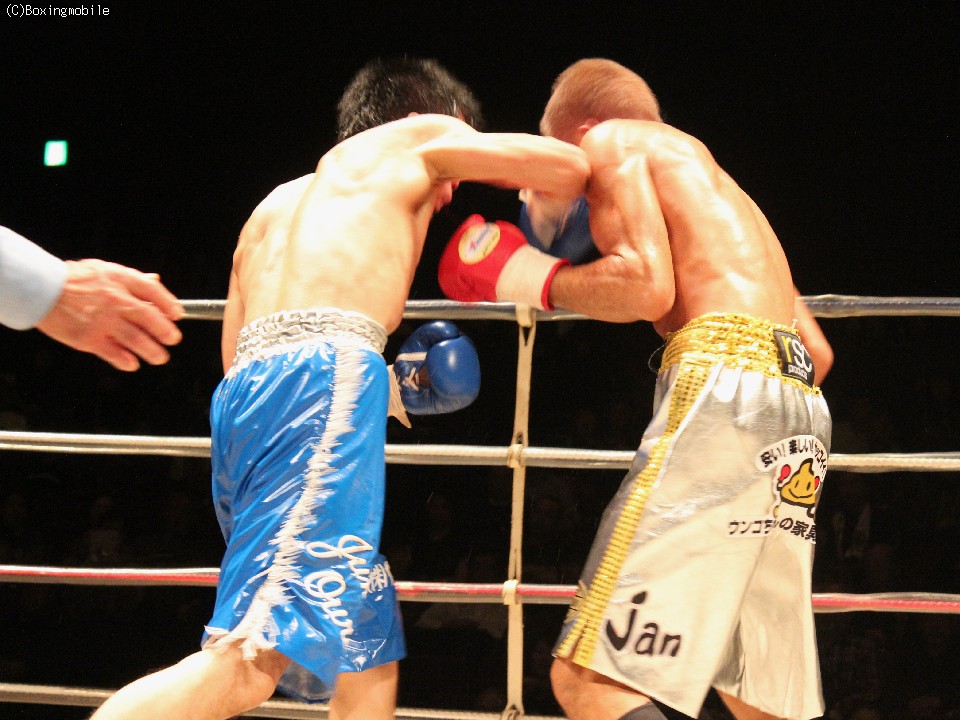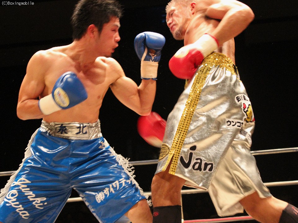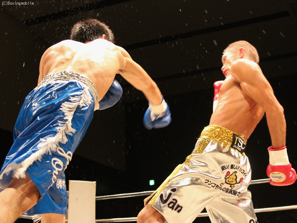 試合:長身のジャンボが徐々に距離をつめるが大浦はリングを時計回りに動いて様子を見た。2回、大浦は左ジャブを二つ続けて中に入ると右ストレートを打ち上げたが、ジャンボは身長差を活かしてパンチを下がってかわした。徐々に距離がつまった3回、大浦の右ストレートがジャンボをとらえる場面もあったが追撃がでない。手数が増えないジャンボに対して、長いジャブとワンツーで先に仕掛けた大浦。それでも5回、ジャンボが遠目から右ストレートを当てると連打でペースをつかみかけた。6回にも距離をつめて置いてパンチを放ったジャンボだが、大浦も単調だが左ロングから突破口を探る。終盤は徐々に距離を突き放して有効打でポイントアウトした。