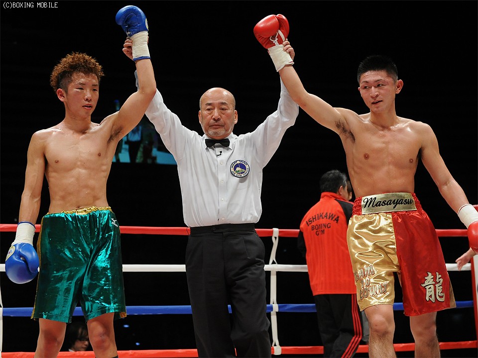 試合:中村が前進、木下が下がりながら応戦する展開。中村がワンツー、左ボディブローを浅く当てて主導権を握った。その後も中村の前進は続き、ワンツーで木下を追い立てるシーンが目立った。木下も動きを止めずに機をみて右ストレートや左フックで迎撃したが、後手に回った印象は拭えなかった。逆に4回からは木下のカウンター・アタックの正確さが目立ち、中村は引きつけられて細かいパンチを被弾する場面が増えた。